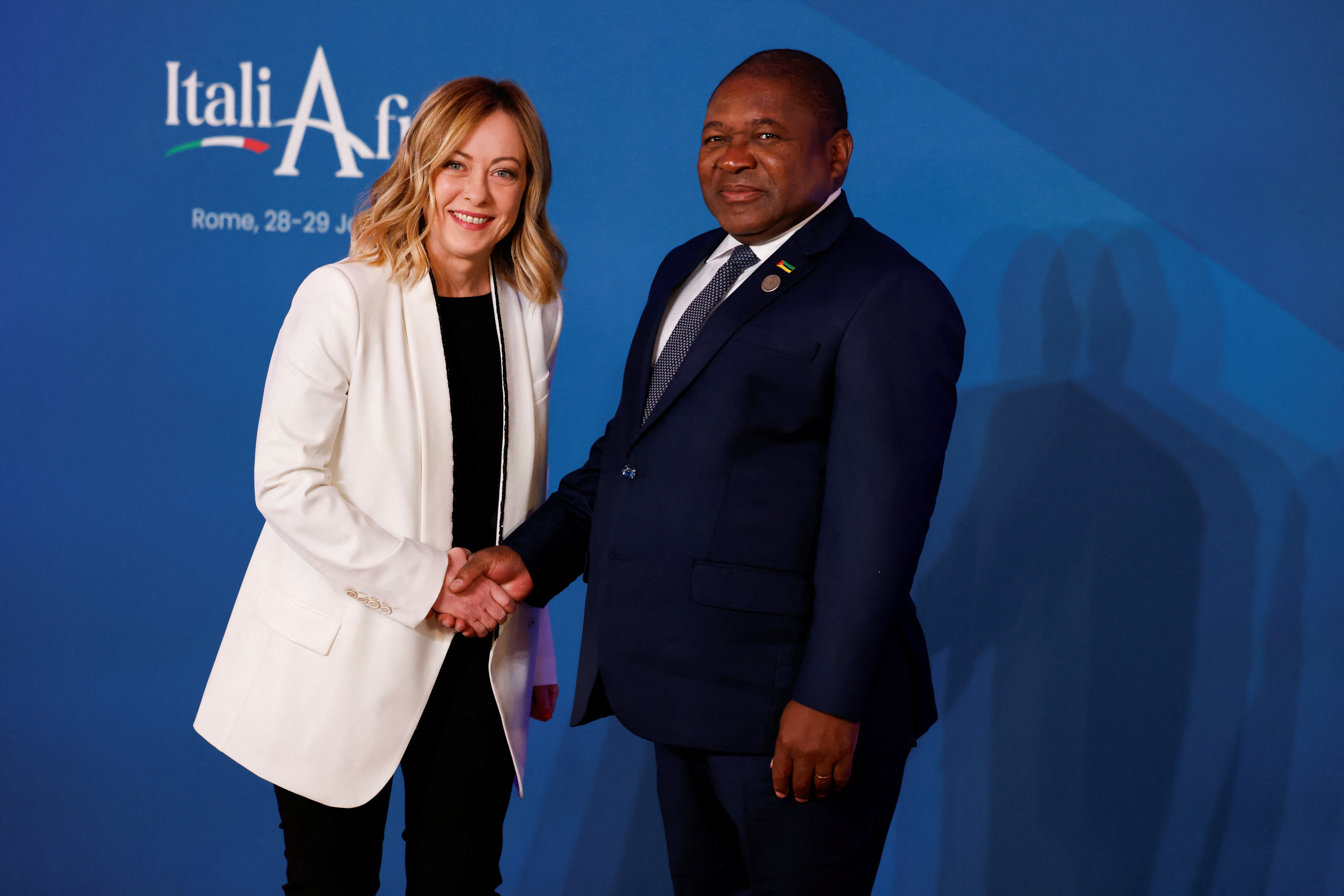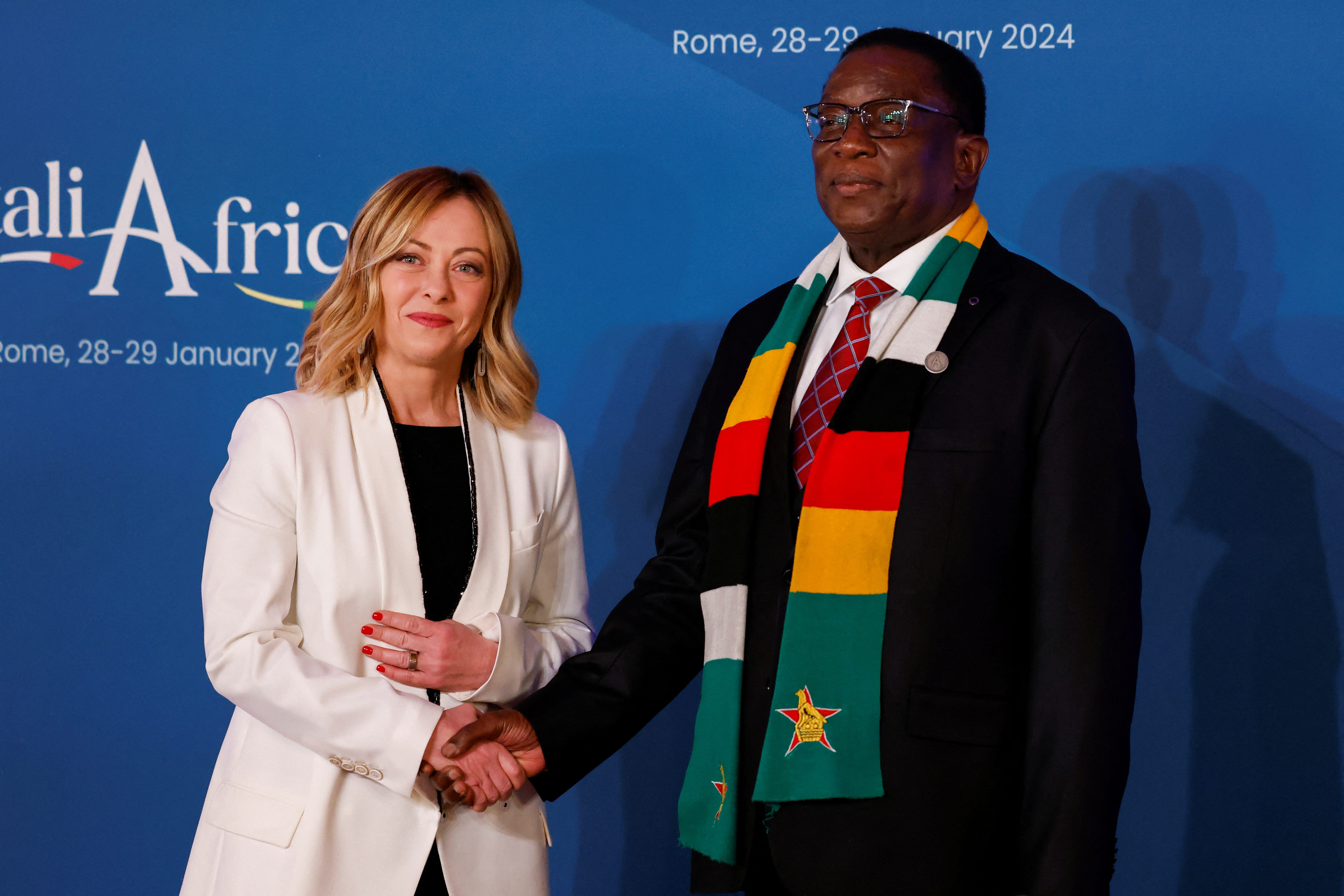意大利总理乔尔贾·梅洛尼(Giorgia Meloni)于2024年1月29日在罗马举行的意大利-非洲峰会上与津巴布韦总统埃默森·姆南加古瓦(Emmerson Mnangagwa)在马达玛宫(参议院)内会面。摄于2024年1月29日。意大利,罗马。路透社/雷莫·卡西利(REUTERS/Remo Casilli)