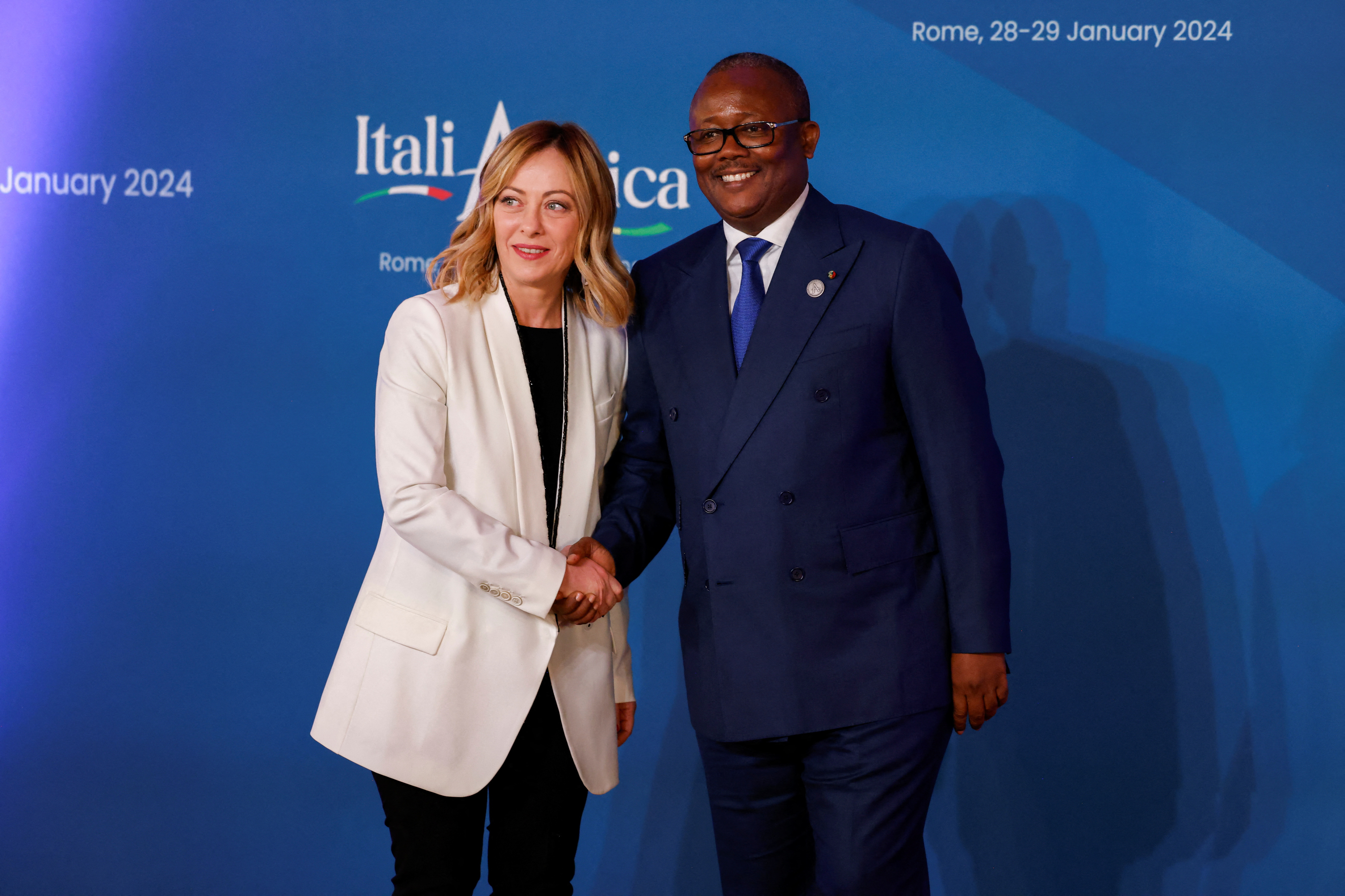 意大利总理乔尔贾·梅洛尼(Giorgia Meloni)于2024年1月29日在罗马举行的意大利-非洲峰会上与津巴布韦总统埃默森·姆南加古瓦(Emmerson Mnangagwa)在马达玛宫(参议院)内会面。摄于2024年1月29日。意大利,罗马。路透社/雷莫·卡西利(REUTERS/Remo Casilli)