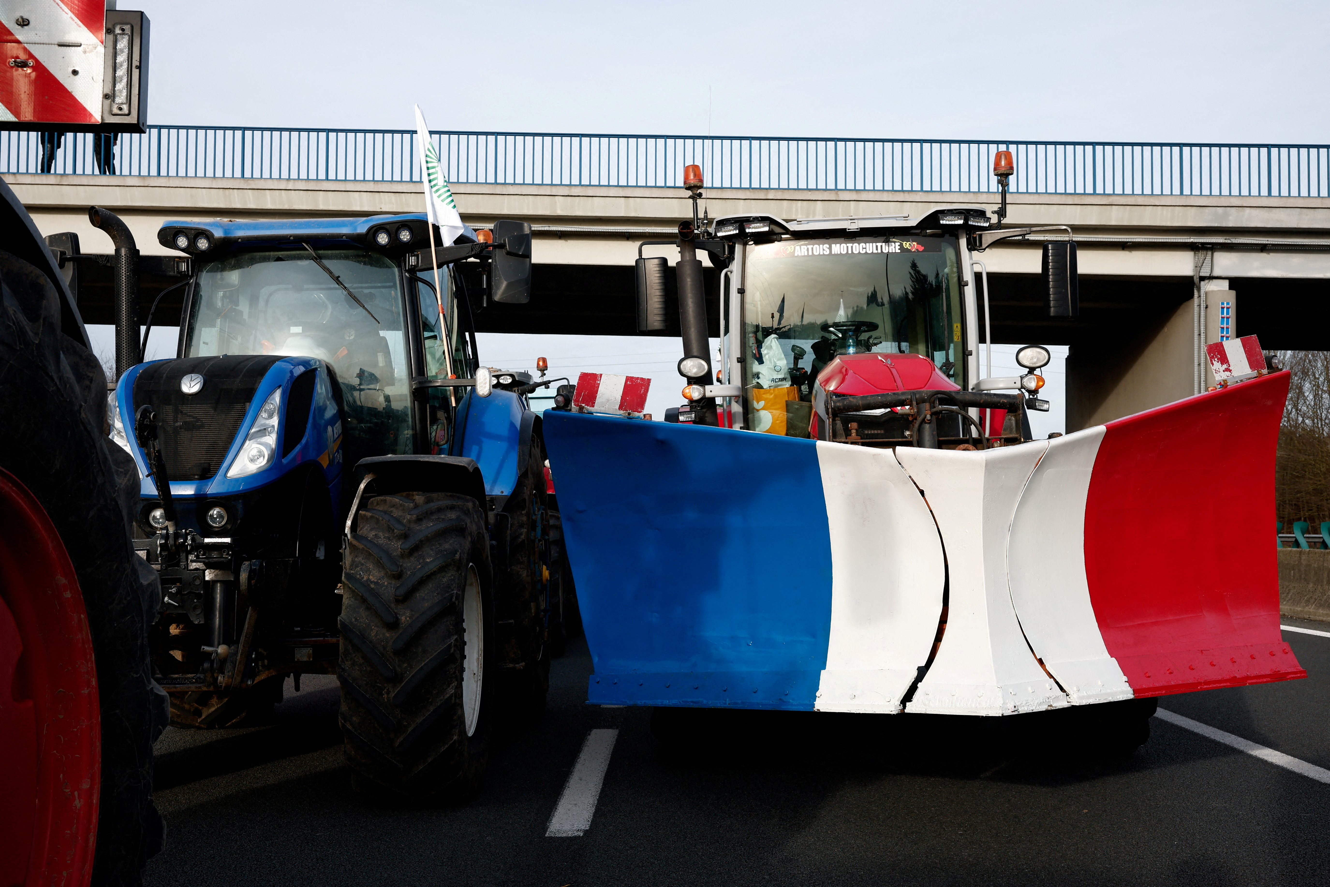 一辆部分涂成法国国旗颜色的车辆停在A1高速公路上,抗议价格压力、税收和绿色监管,这些是整个欧洲农民共同的不满,地点在法国巴黎附近的尚纳维埃莱卢夫尔,2024年1月29日。路透社/Benoit Tessier/文件照片