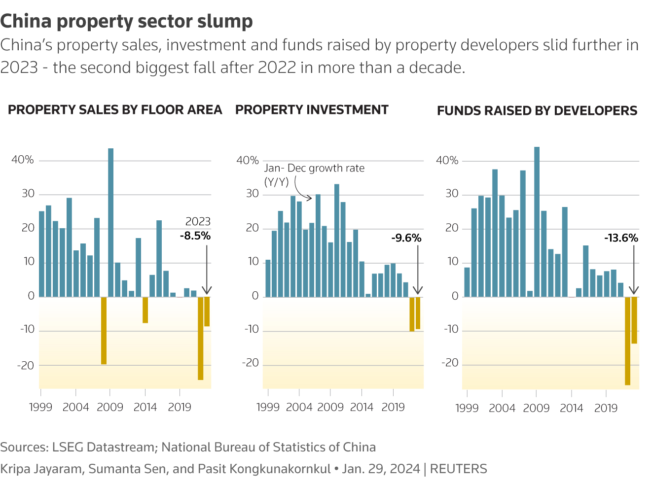 中国的房地产销售额、投资额以及房地产开发商筹集的资金在2023年进一步下滑 - 这是十多年来仅次于2022年的第二次大幅下降。