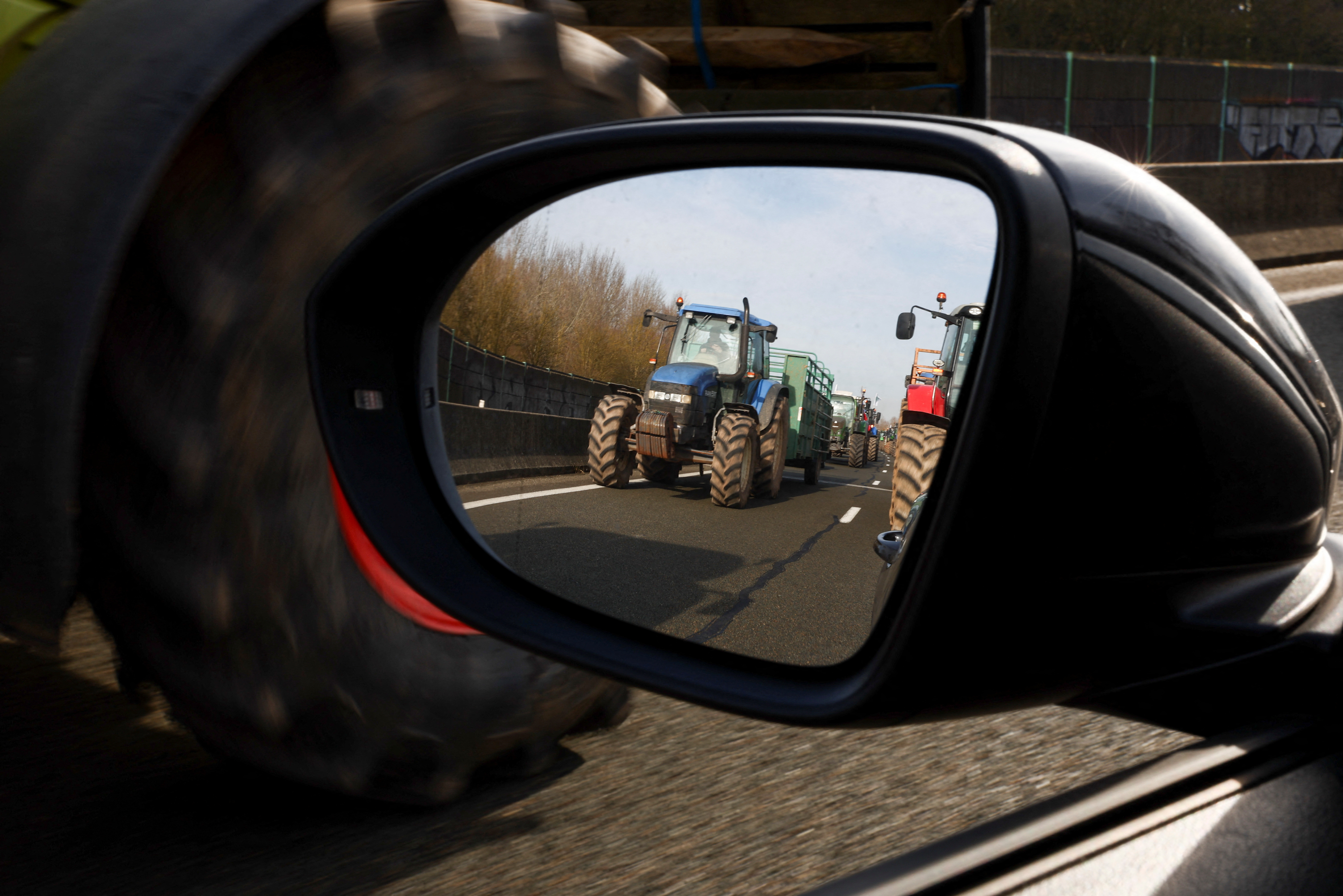 拖拉机在法国农民抗议活动中被反射在后视镜上,他们抗议价格压力、税收和绿色法规,这些是整个欧洲农民共同的诉求,地点在法国博韦,2024年1月29日。路透社/斯蒂芬妮·勒科克 - 灌溉- 批评动物福利和农药使用