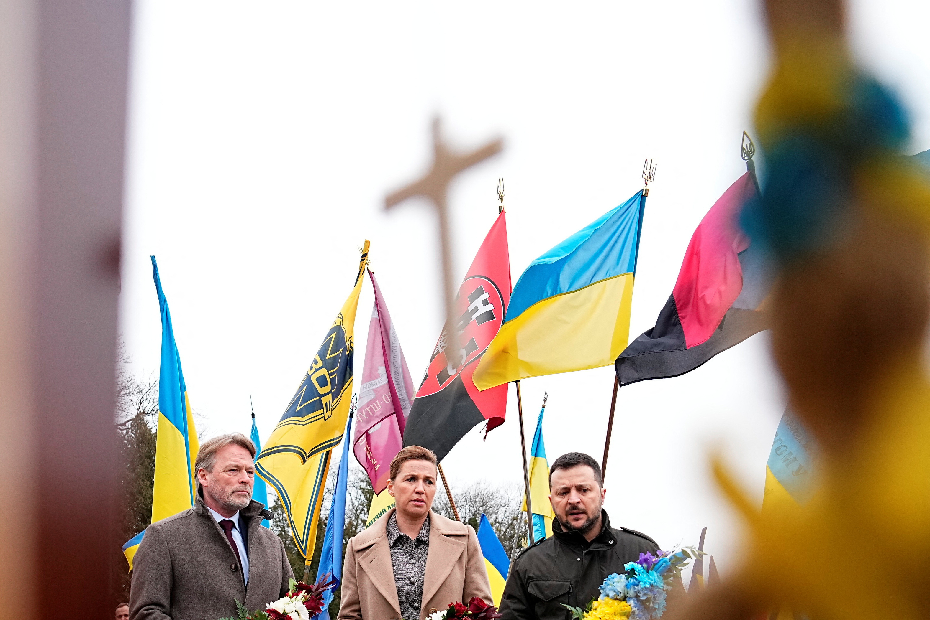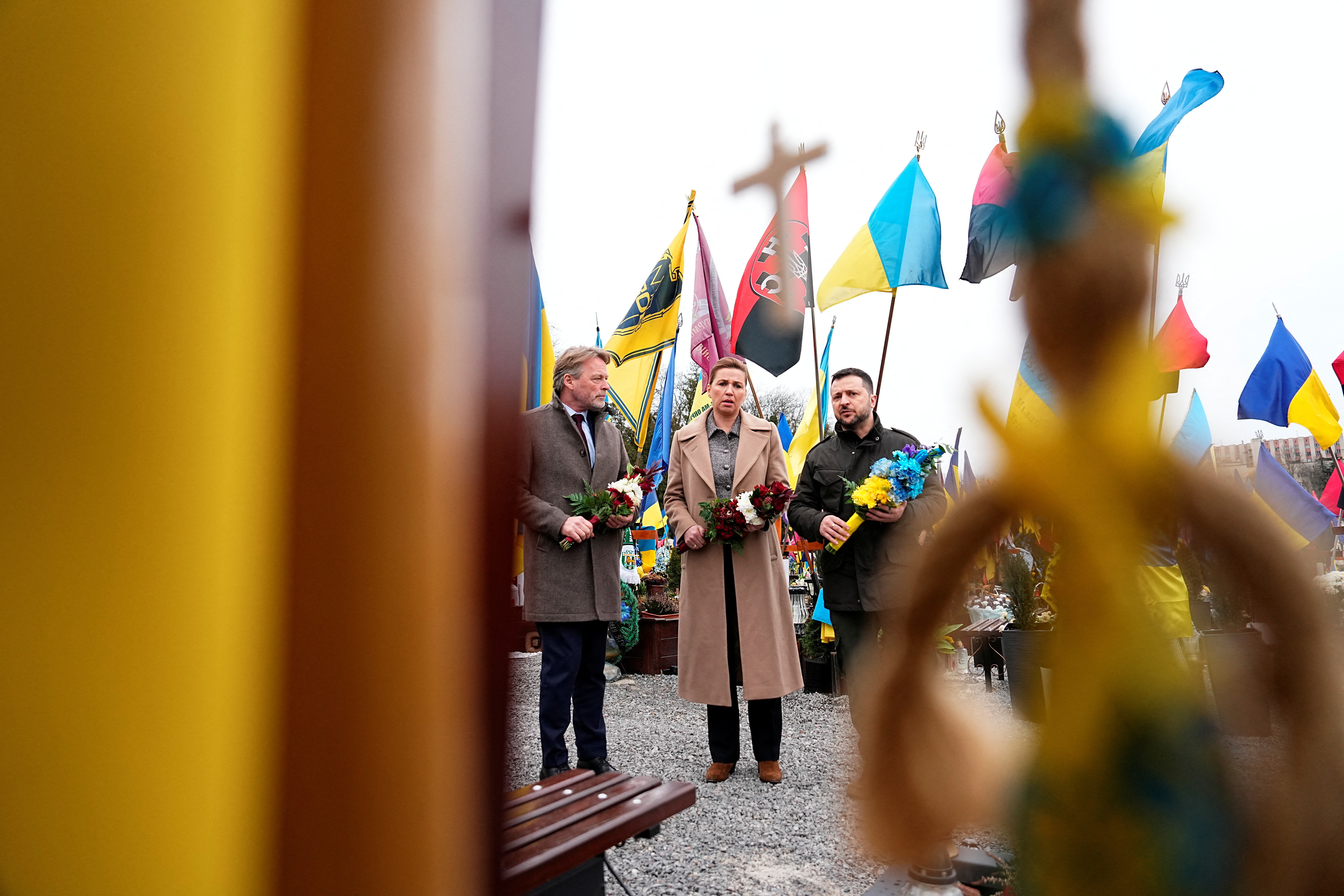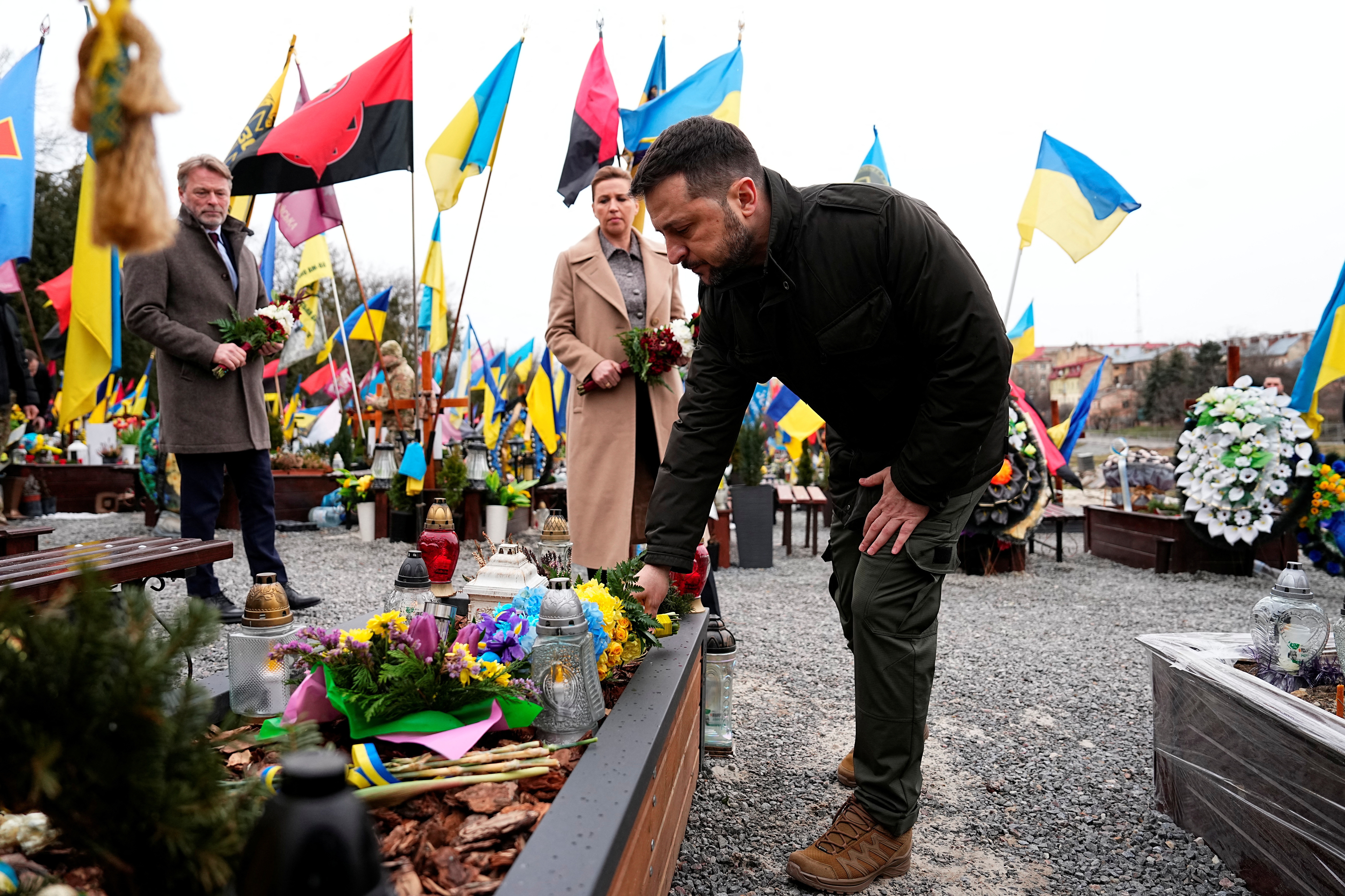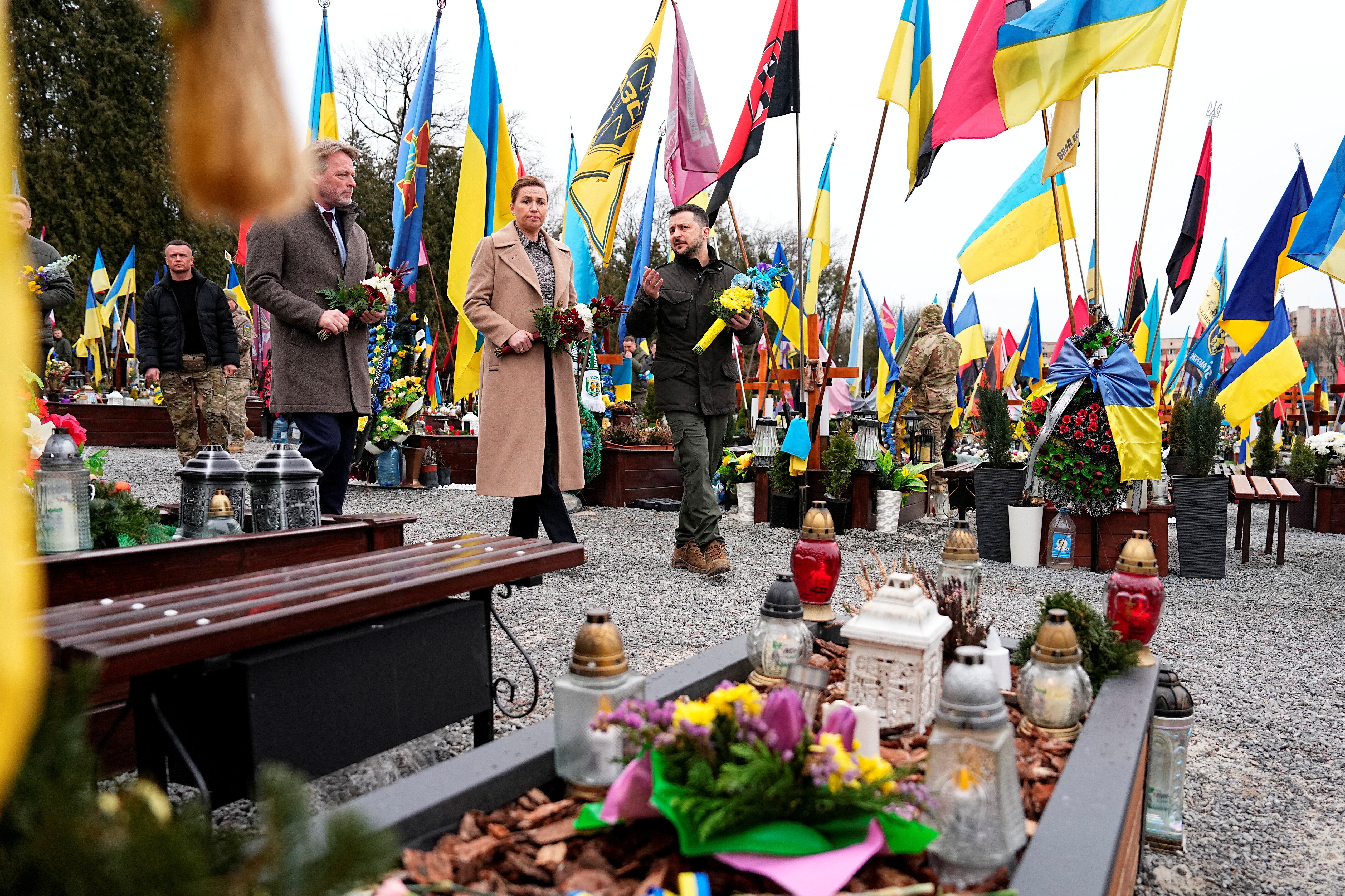 丹麦总理梅特·弗雷德里克森(Mette Frederiksen)、她的丈夫博·滕贝格(Bo Tengberg)和乌克兰总统沃洛迪米尔·泽连斯基(Volodymyr Zelenskiy)在乌克兰利沙克夫公墓的玛尔斯之地举行的悼念仪式上行走,时间为2024年2月23日星期五。Ritzau Scanpix/via REUTERS 2月23日(路透社)- 丹麦总理梅特·弗雷德里克森于周五在乌克兰西部城市利沙克夫会见了乌克兰总统沃洛迪米尔·泽连斯基,这是俄罗斯全面入侵两周年的前一天。。领导人们参观了一座墓地,并向阵亡士兵致敬,乌克兰总统办公室表示。