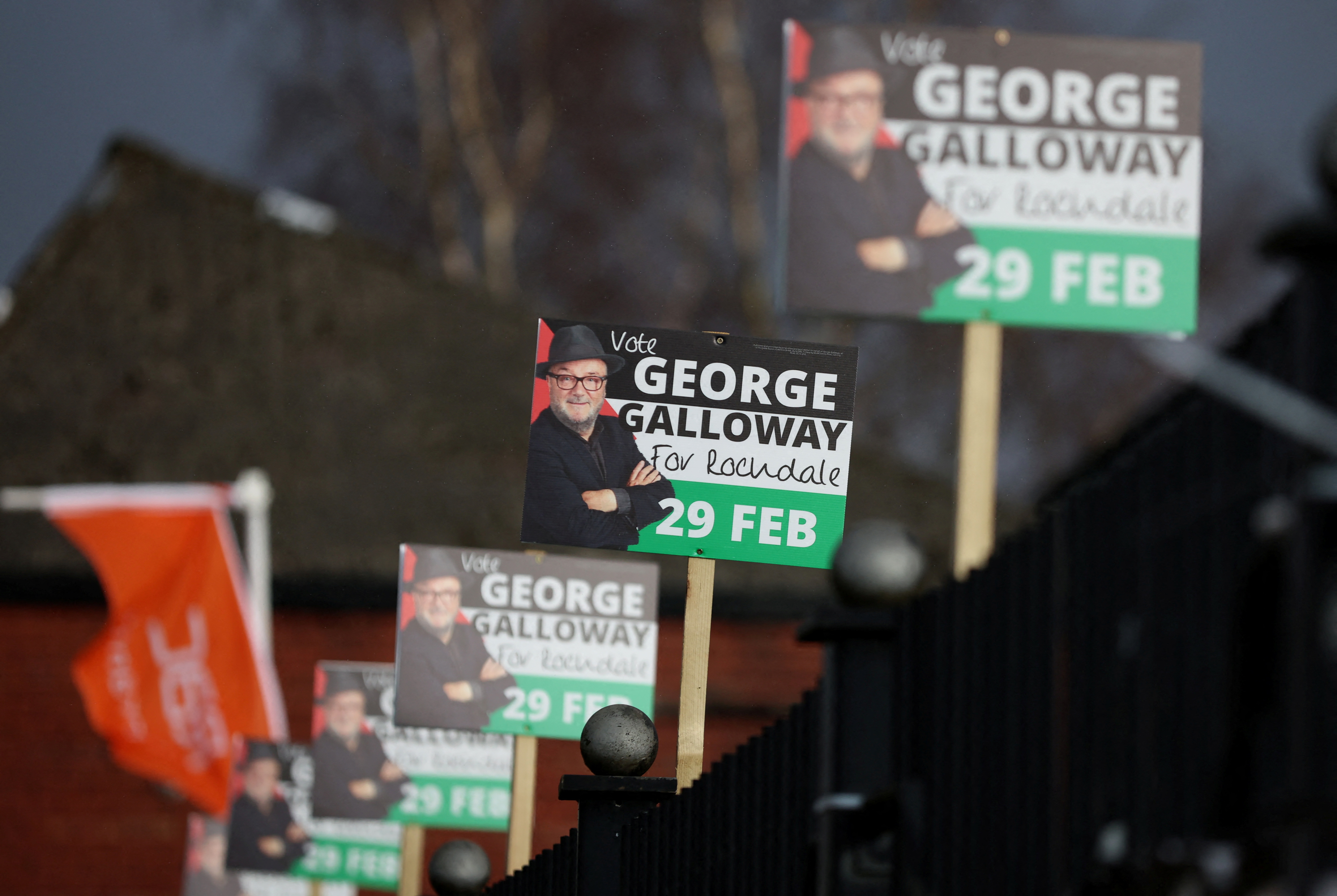 选举委员会鼓励人们在即将到来的英国罗奇代尔议会补选中投票支持工党领袖乔治·加洛韦的候选人,2024年2月26日,英国罗奇代尔,路透社/菲尔·诺布尔英格兰北部小镇罗奇代尔的选民表示,他们对本周的选举并不热衷,因为选举被政治争议主导,争论焦点是加沙战争,并为左翼激进分子乔治·加洛韦重返议会铺平道路。