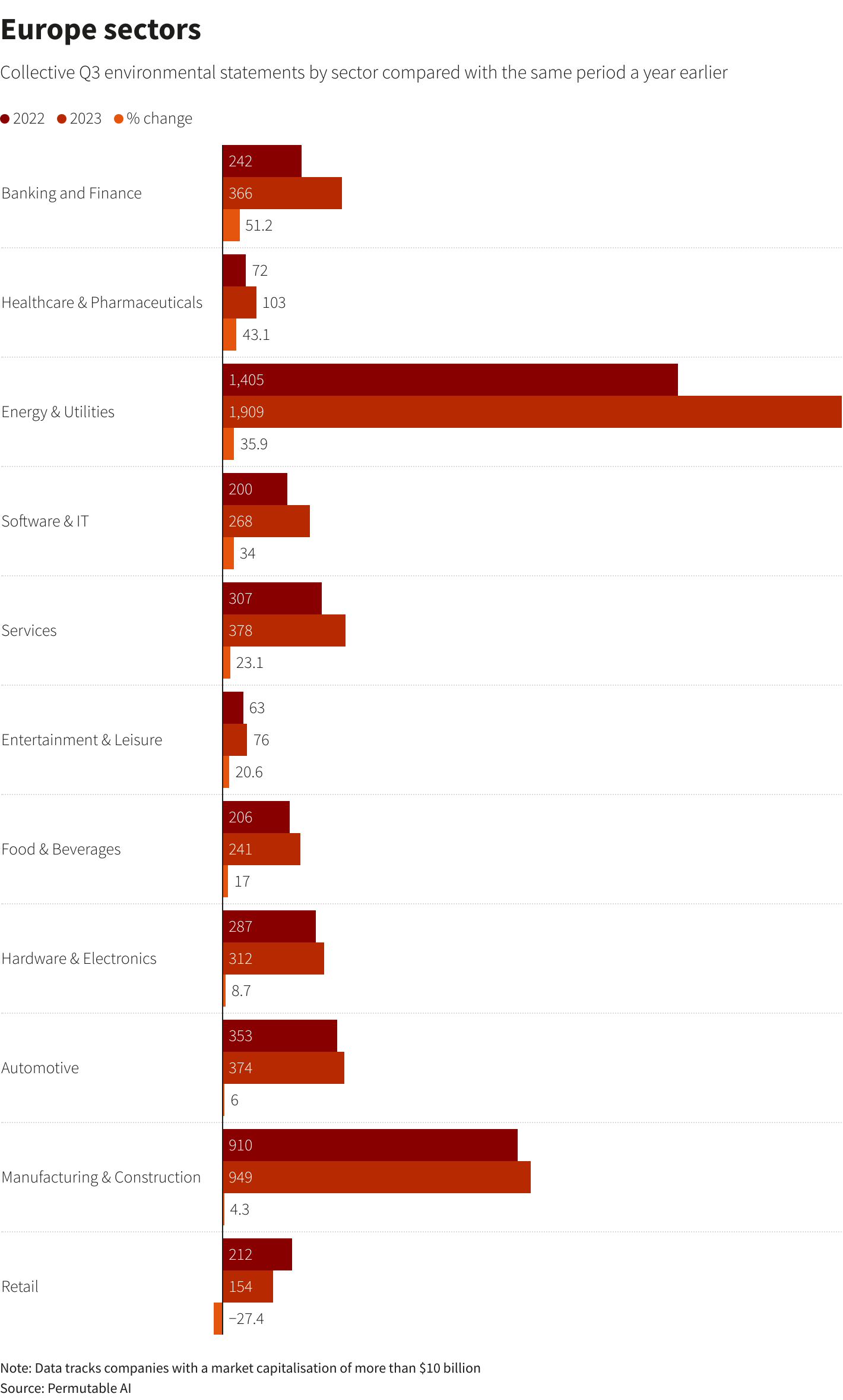 根据Permutable的数据,汽车和医疗保健公司的ESG提及也有所下降。食品和饮料公司的声明保持不变。