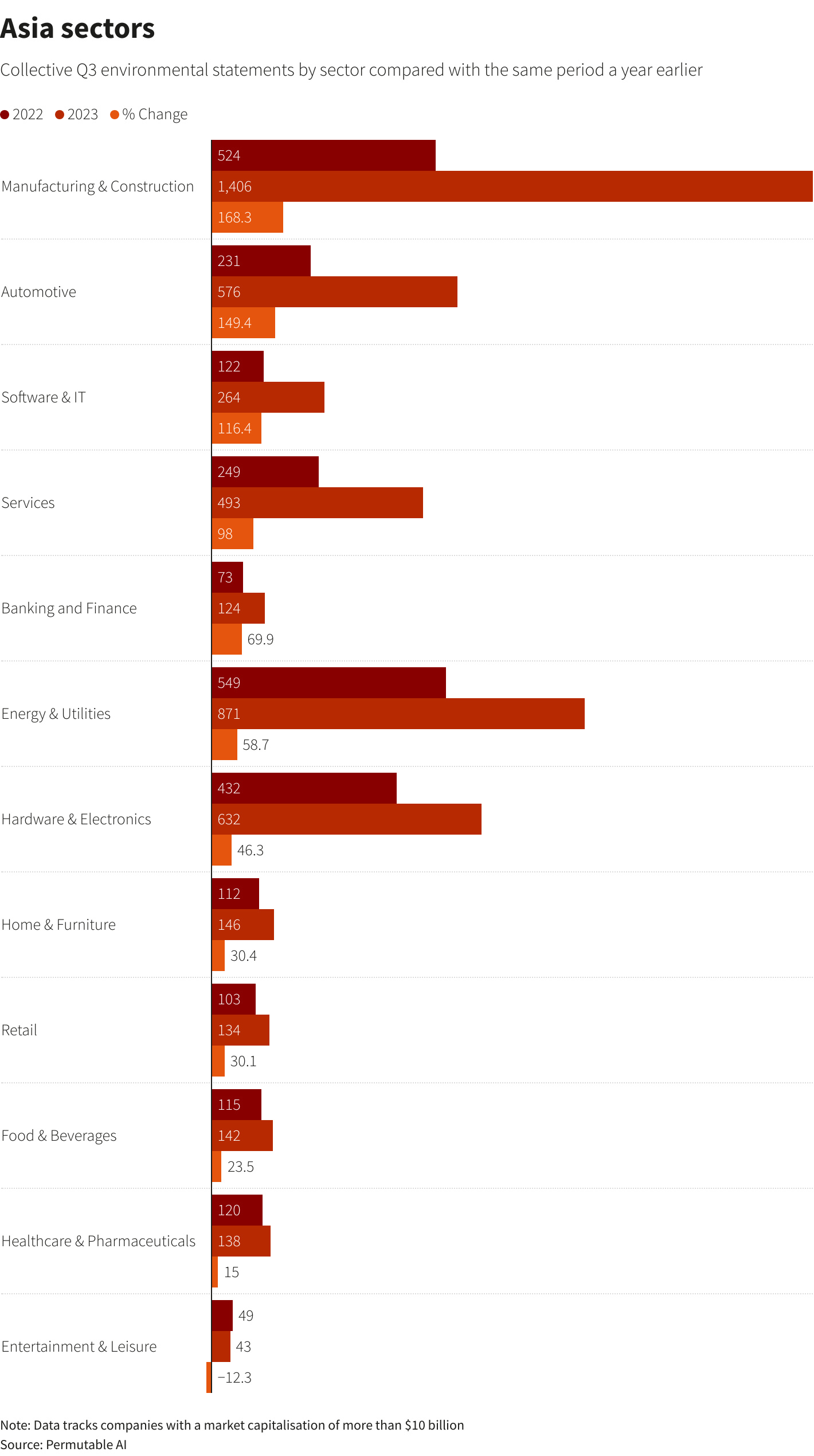 在世界其他地方,趋势完全不同。许多污染严重的亚洲国家政府正在向公司施压,要求它们在可持续性方面做得更多。数据显示,亚洲金融公司在同一时期集体提及ESG的次数增加了70%,而欧洲金融公司则增加了51%。