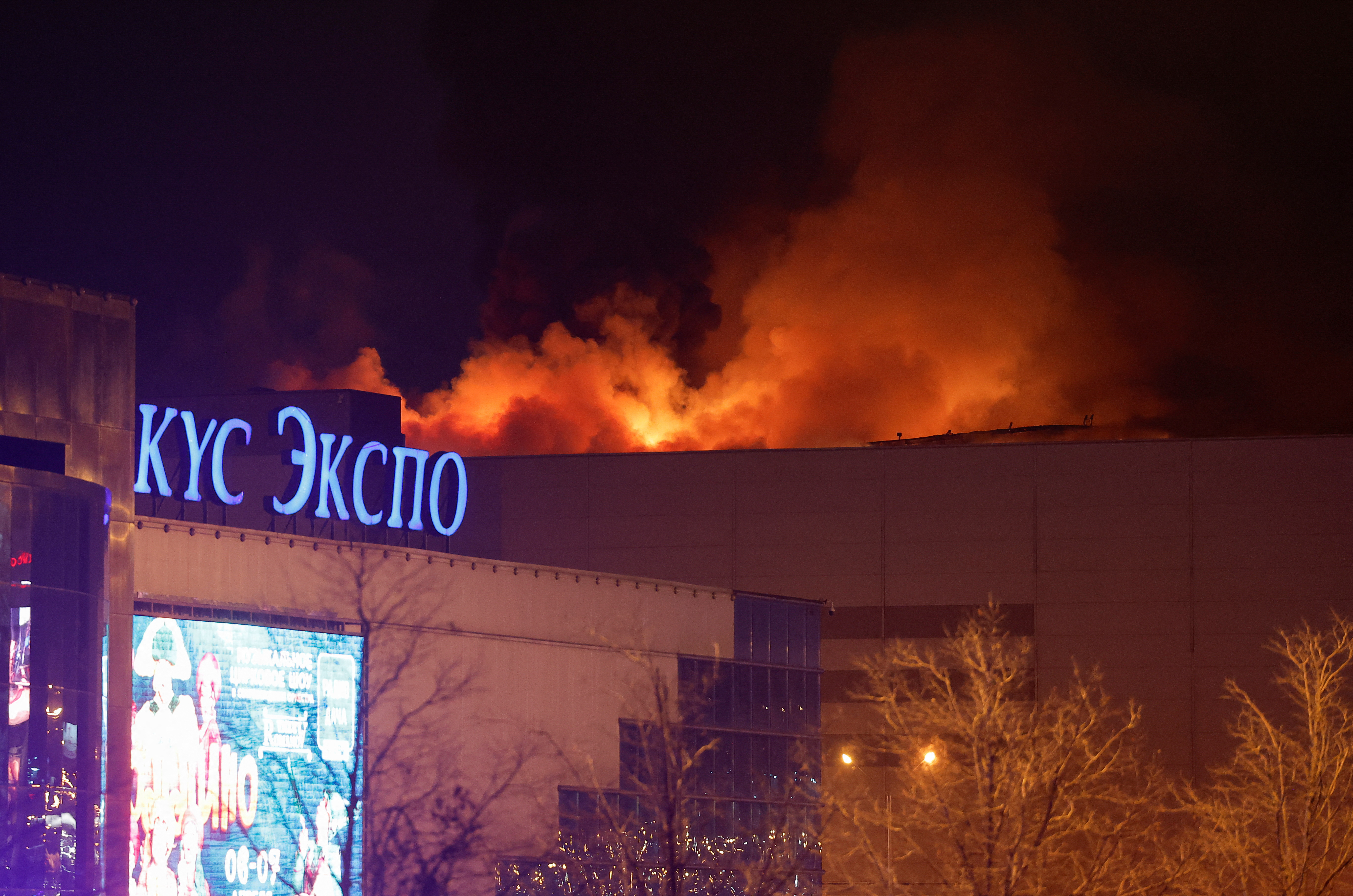 据报道,2024年3月22日,俄罗斯莫斯科外,发生枪击事件后,燃烧的玫瑰城市音乐厅上方升起烟雾。路透社/Maxim Shemetov -一名目击者告诉路透社记者,自动武器被使用。