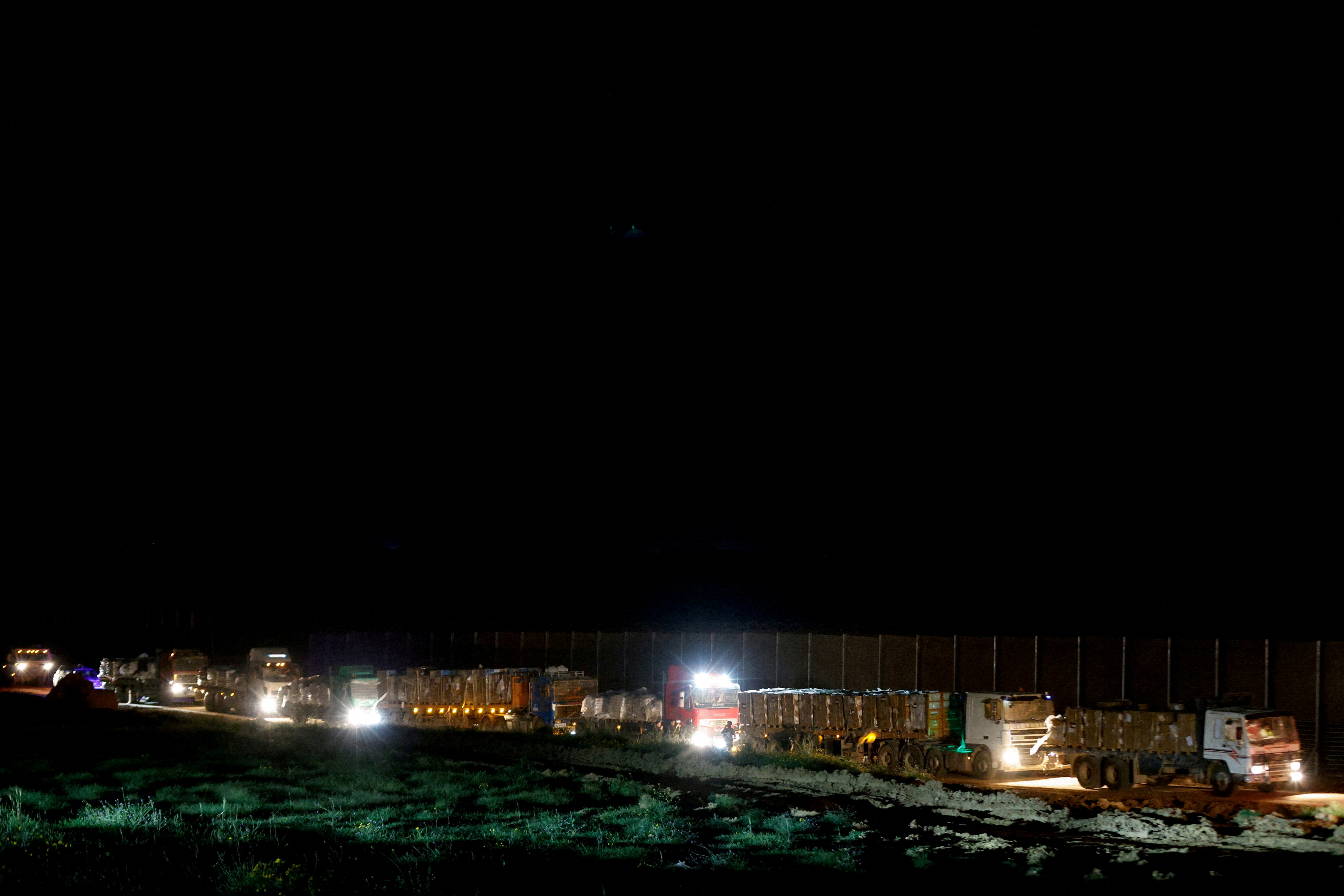 开罗,3月25日(路透社)- 三月中旬,一队卡车沿着通往加沙地带从以色列进入的过境点附近的沙漠公路排成了3公里长的队伍。同一天,另一队卡车,长达1.5公里,有时两三辆并排,排在了通往加沙的埃及过境点附近。