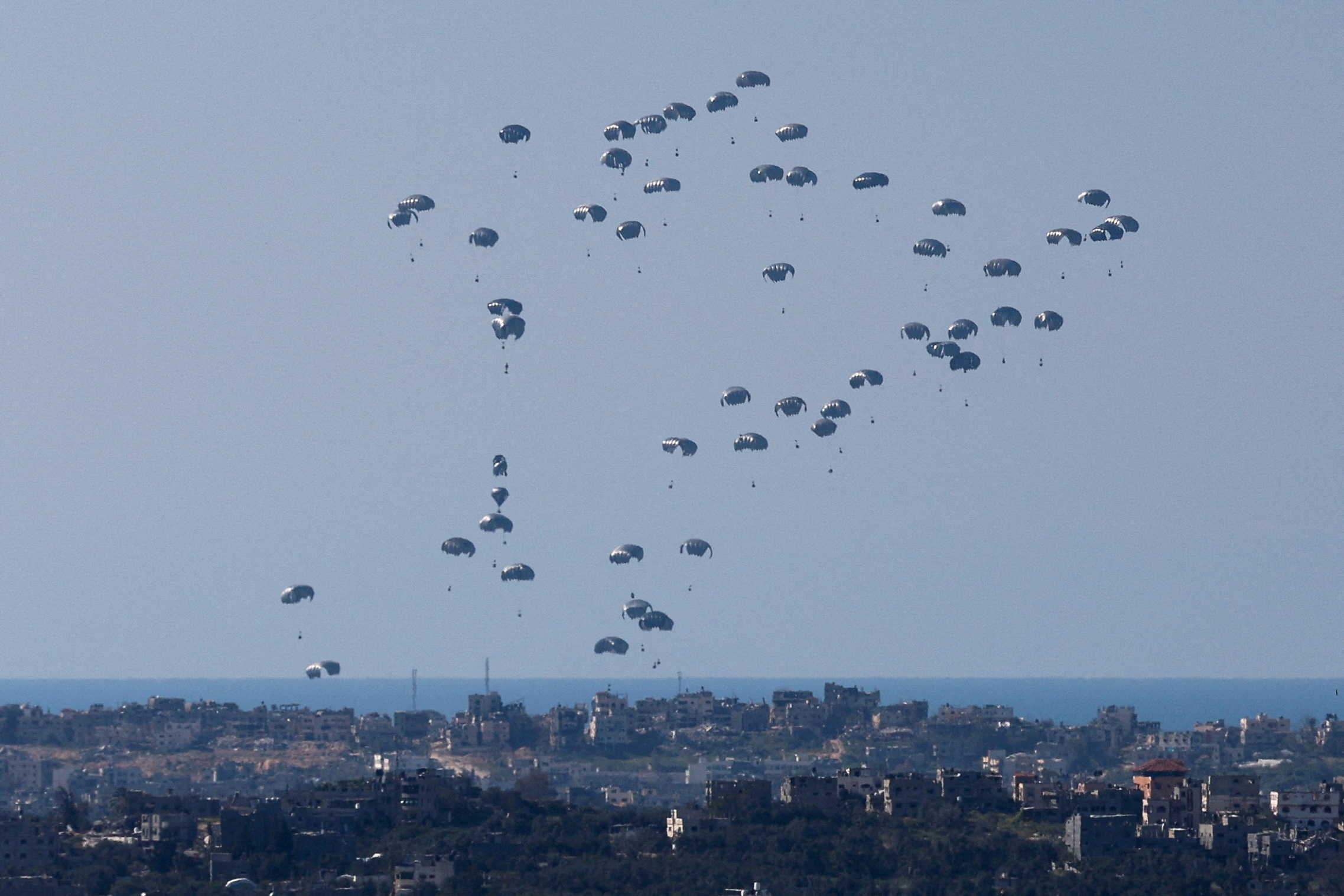 包裹从军用飞机上空投后向加沙北部落下,从以色列方向看,2024年3月11日。路透社/罗南·祖卢恩最近的粮食安全报告,即综合粮食安全阶段分类(IPC),发现由于援助不足,几乎所有加沙家庭每天都在跳餐,成年人减少进食以让孩子吃饱。报告称,北加沙的情况特别严重,在近三分之二的家庭中,“人们在过去30天中至少有10次整天整夜没有进食。”