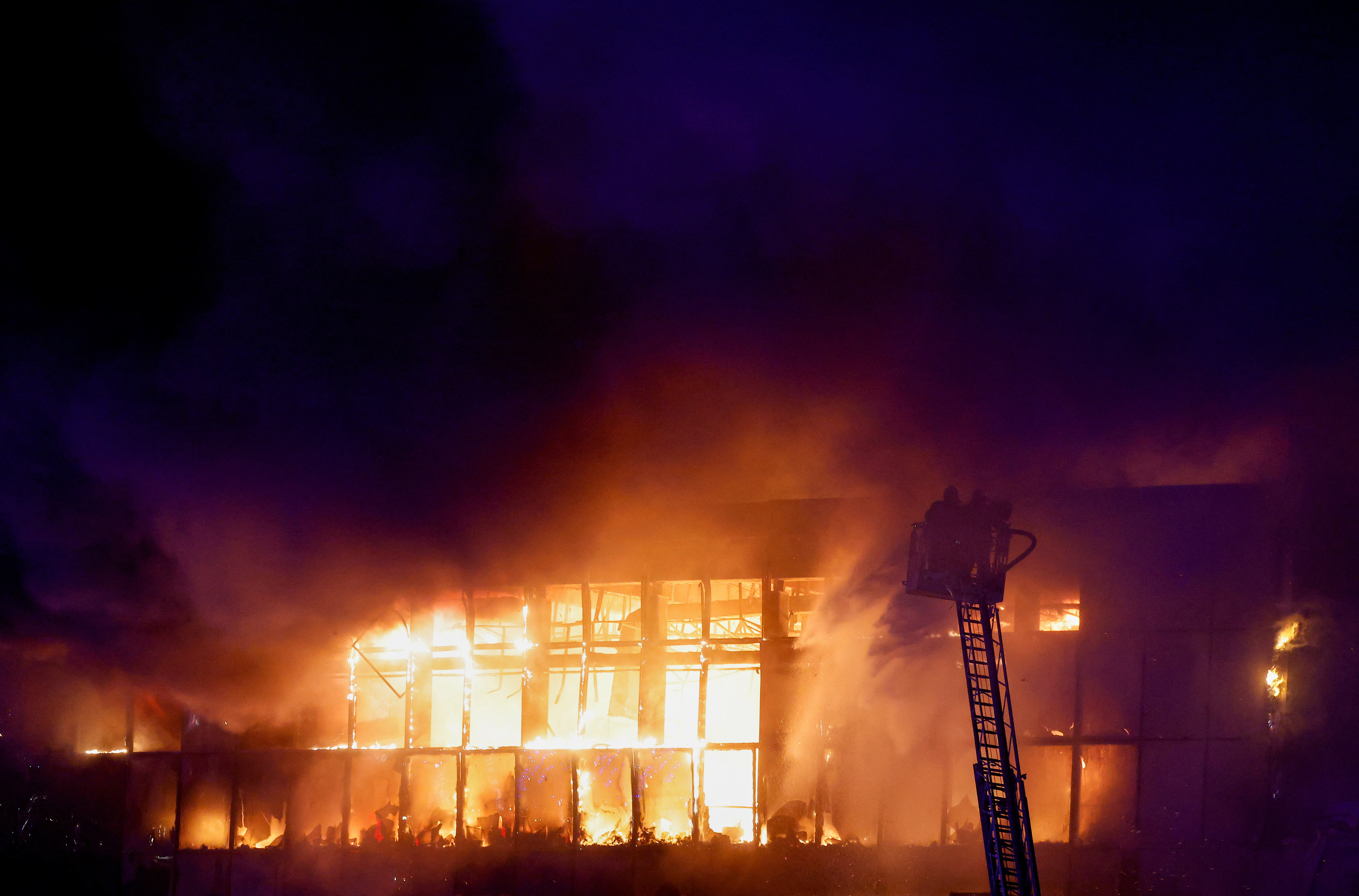 第1张图片,共4张 俄罗斯执法人员在莫斯科外的克罗库斯城市音乐厅演唱会场地附近的停车区走动,这里发生了一起枪击事件,2024年3月22日。路透社/马克西姆·舍梅托夫