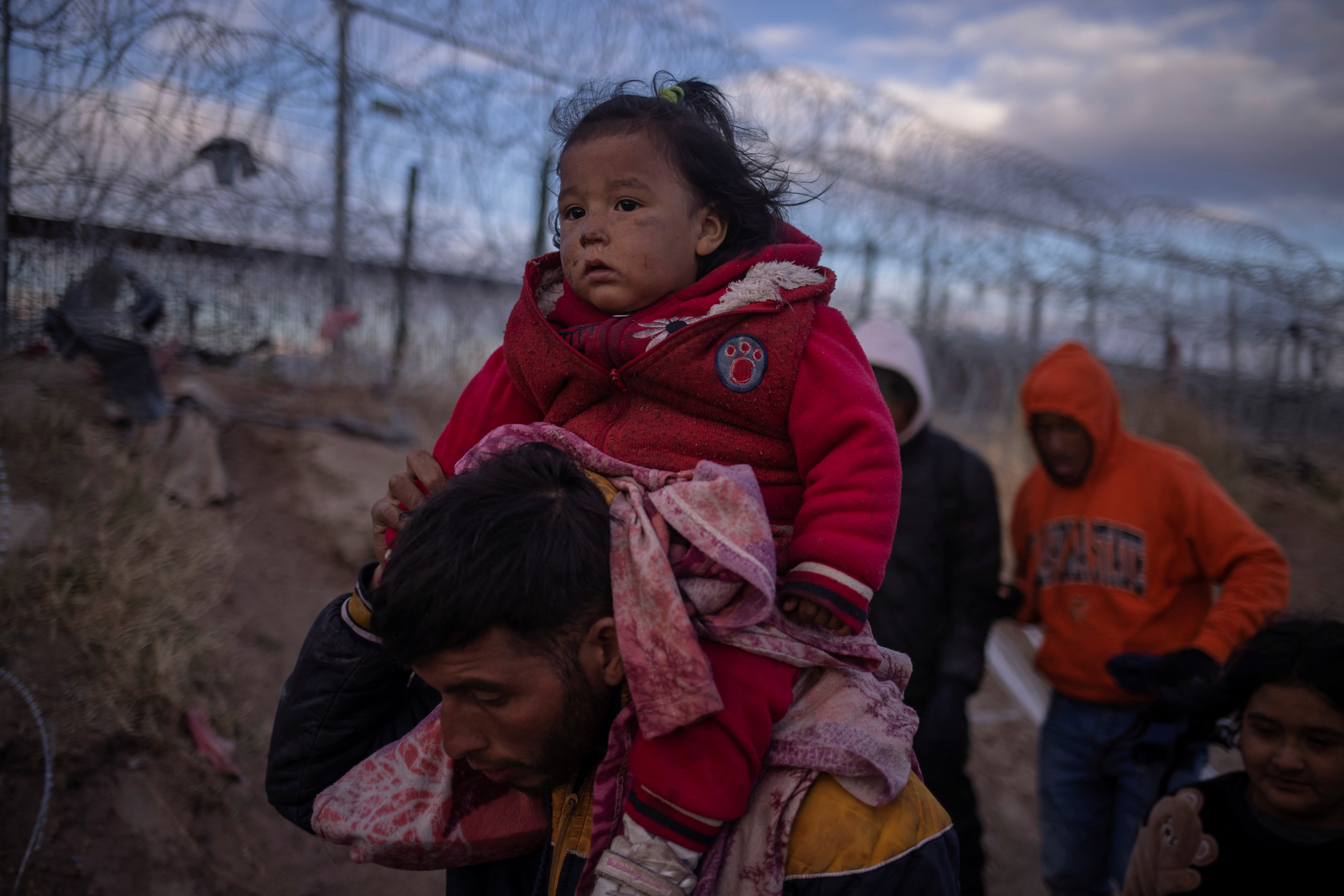第1/5项:来自委内瑞拉的移民Eliana,22岁,抱着她三岁的女儿Chrismarlees,当一名陆军国民警卫队士兵阻止她越过装有刀丝网的里约格兰德河岸边的围栏时,她朝他喊话,发生在美国德克萨斯州埃尔帕索,3月26日。Eliana的六岁女儿Ariana被其他移民抱过围栏,他们使用了剪刀剪断了刀丝网。路透社/Adrees Latif