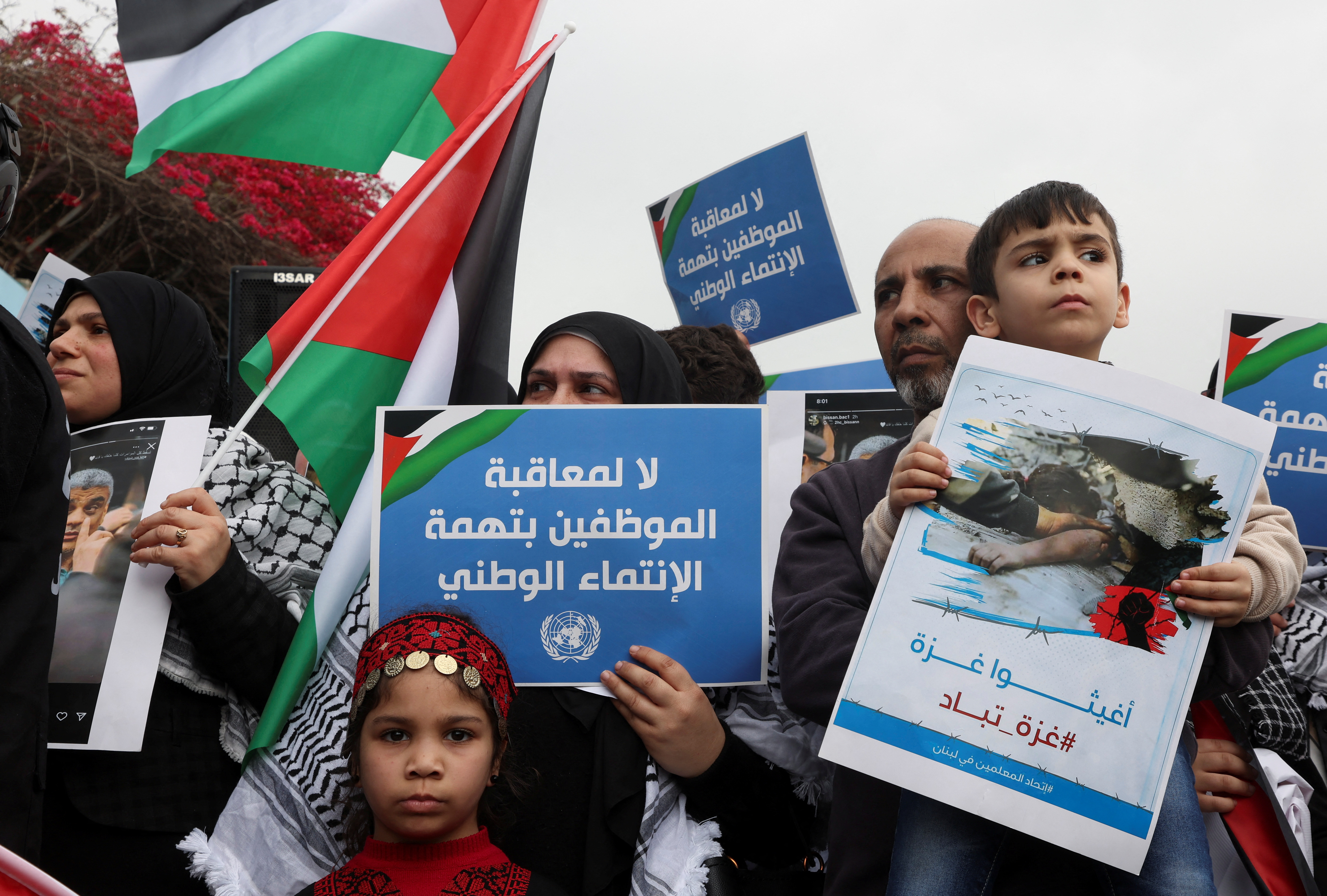 第1/4项示威者在黎巴嫩贝鲁特联合国巴勒斯坦难民机构办公室外举行抗议活动,因该机构因可能违反员工行为规定而将学校教师法蒂·阿尔谢里夫停职,2024年3月27日,摄于贝鲁特,黎巴嫩。路透社/莫哈迈德·阿扎基尔