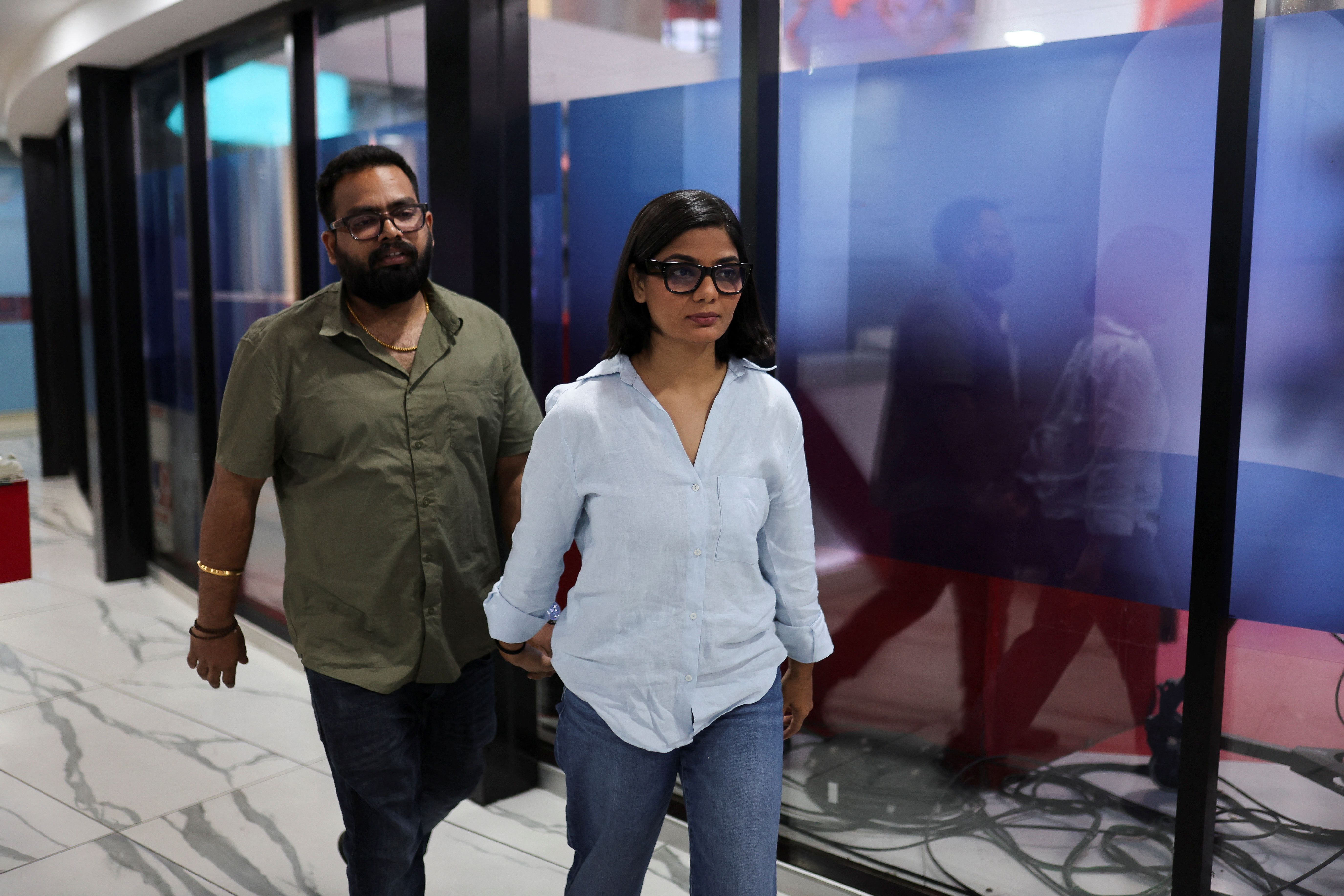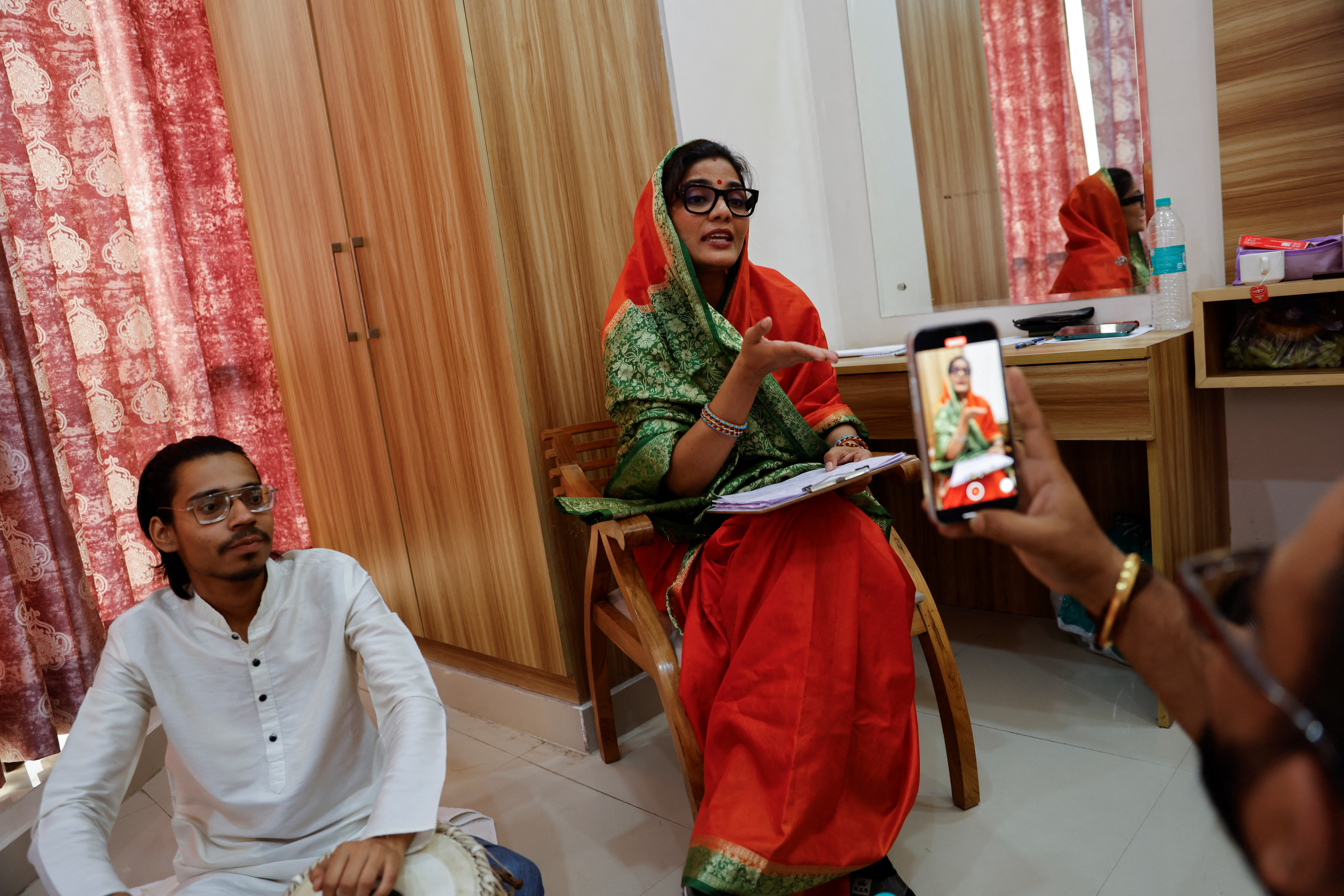 第1项5 Neha Singh Rathore,27岁,民间歌手和社交媒体内容创作者,在印度诺伊达的一家全国电视新闻网络的工作室内,参加辩论并被要求担任小组成员时做出反应,2024年4月5日。路透社/Anushree Fadnavis