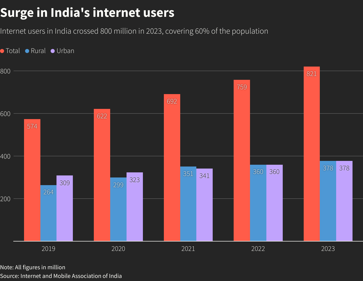 据行业估计,至少有8亿印度人可以接入互联网,印度人平均每天在社交媒体上花费超过两个小时,远远超过看电视频道或读报纸的时间。该国拥有近10亿选民。
