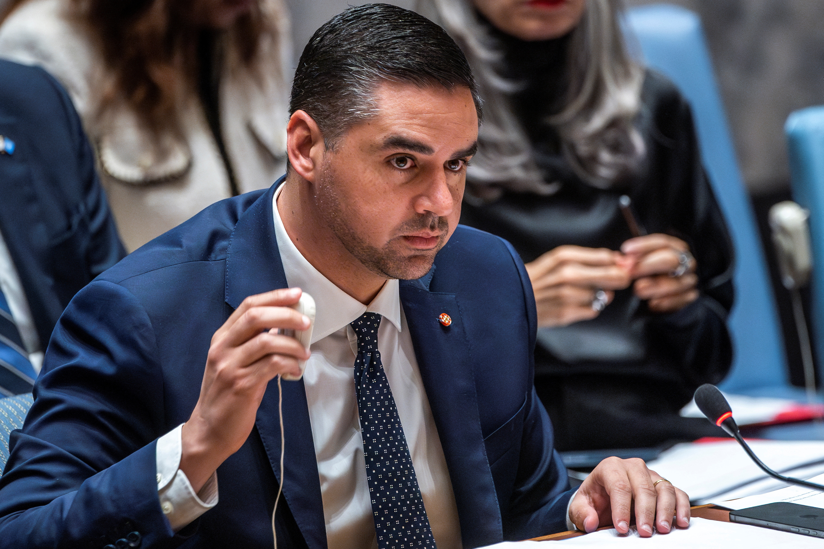 5项中的第1项 以色列驻联合国大使吉拉德·埃尔丹在纽约市联合国总部与安理会成员进行会议,讨论中东地区的情况,包括巴勒斯坦问题,2024年4月18日,美国纽约。路透社/埃迪亚多·穆诺斯