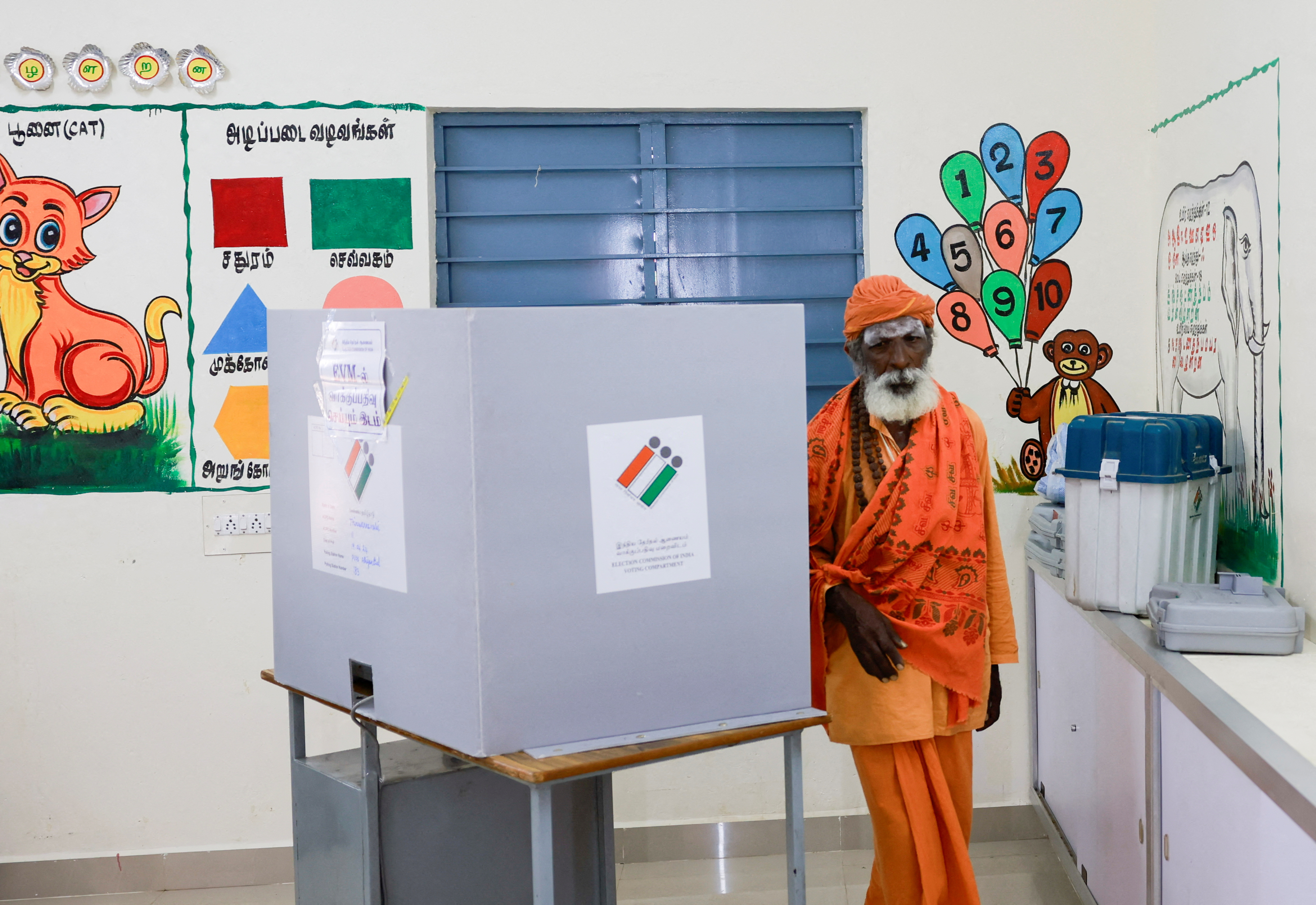 拉玛·钱德拉,76岁,一位苦行僧或印度教圣人,在印度泰米尔纳德邦的蒂鲁瓦南马莱投票站投票,这是2024年印度大选的第一阶段。路透社/纳维什·奇特拉卡尔4月19日(路透社)- 印度将在本月开始举行世界上最大的选举,近10亿人有资格投票,现任总理纳伦德拉·莫迪处于领先地位。## 这是什么?