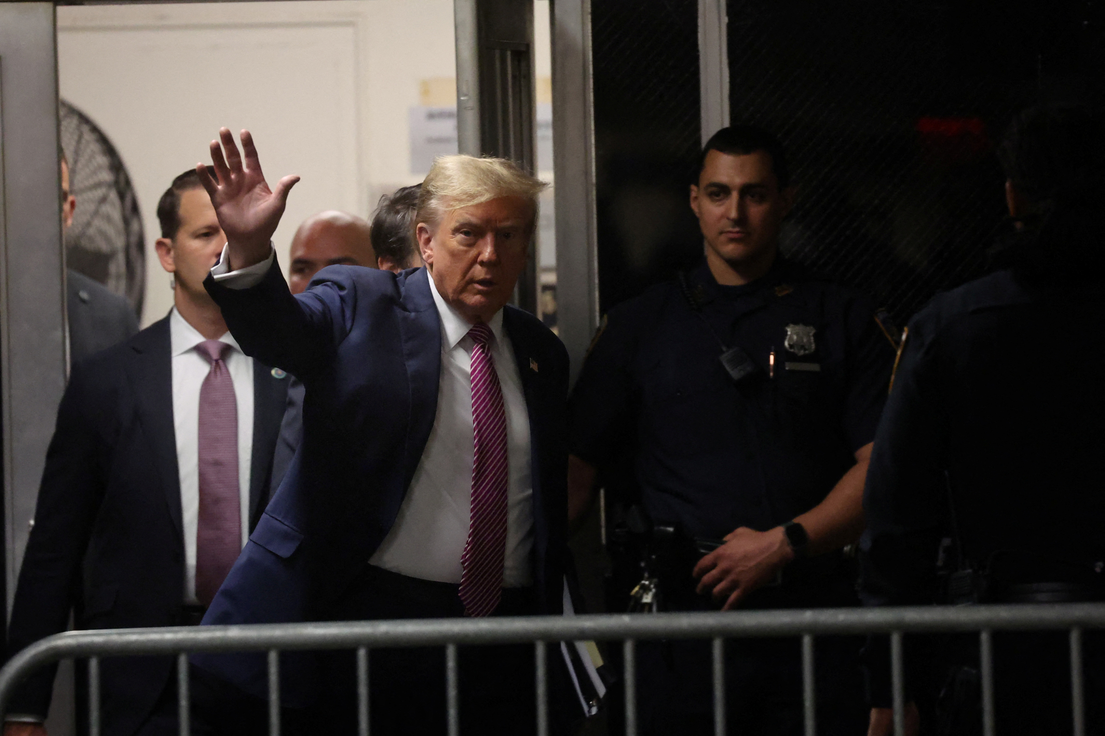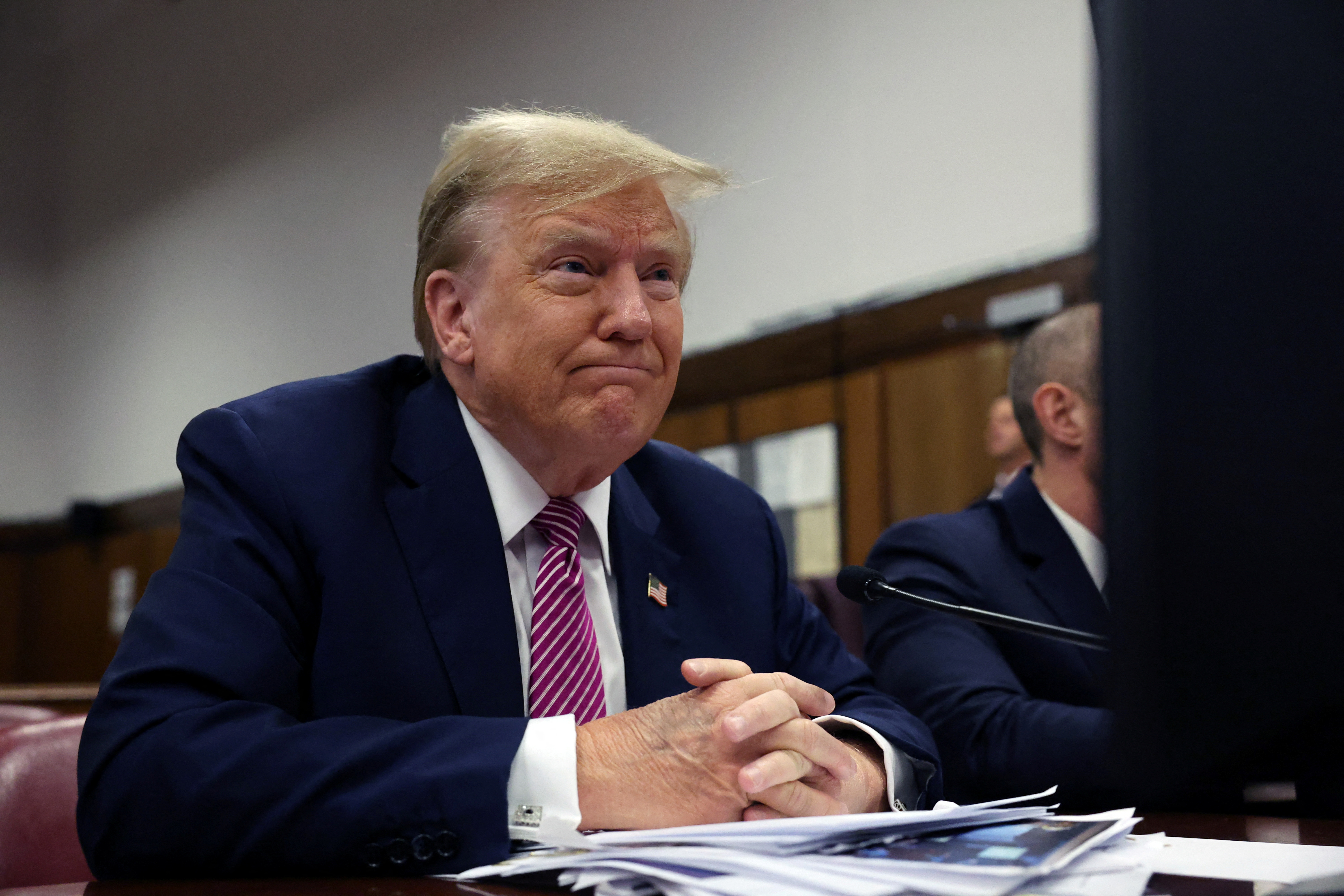 第1项,前美国总统唐纳德·特朗普坐在曼哈顿刑事法庭,审理他涉嫌掩盖付给保持沉默金钱的指控,2024年4月19日,美国纽约市,美国。斯宾塞·普拉特/路透社通过REUTERS