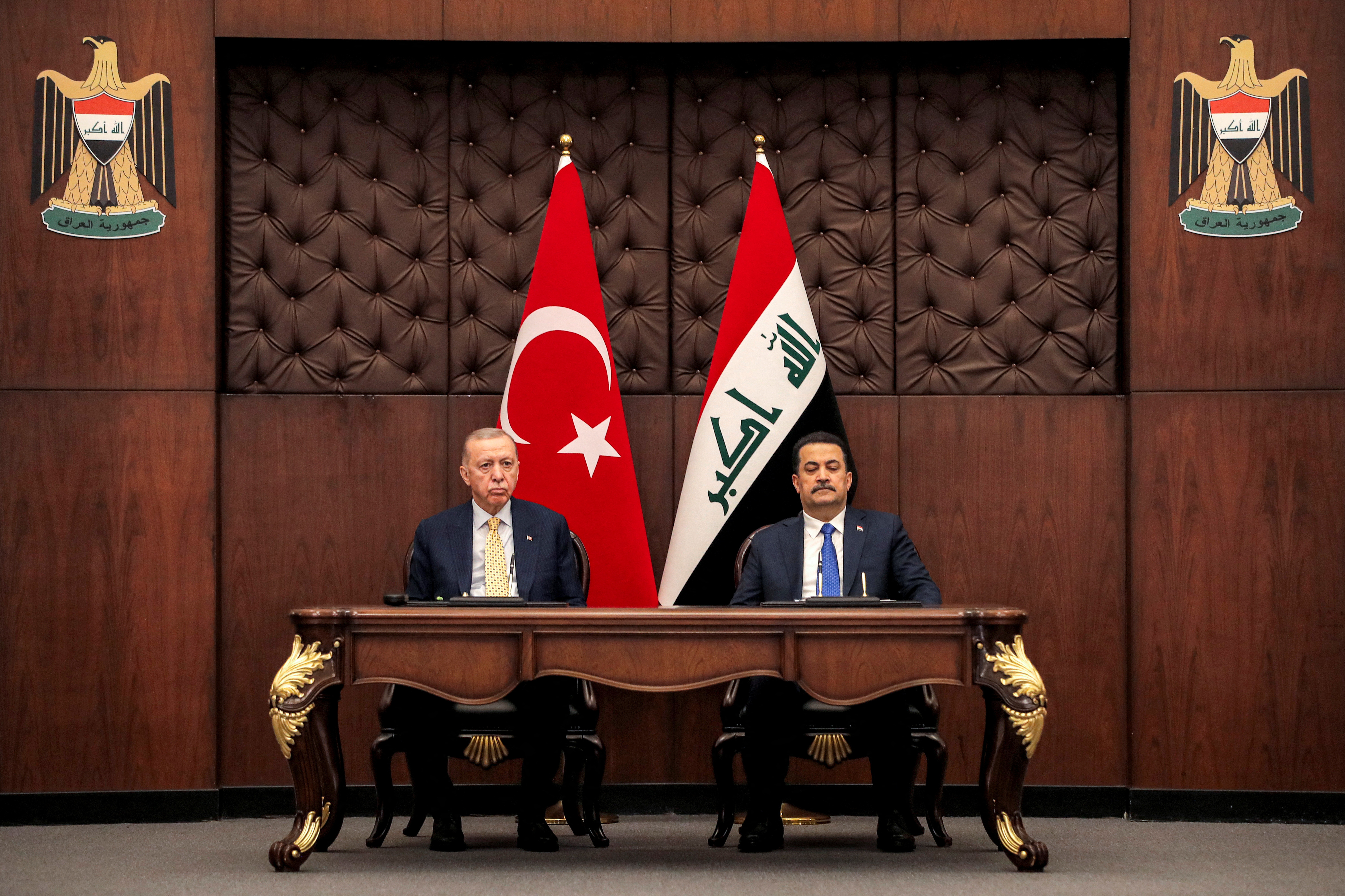 伊拉克总理穆罕默德·希亚·阿尔-苏达尼与土耳其总统雷杰普·塔伊普·埃尔多安在伊拉克巴格达会晤,2024年4月22日。阿赫迈德·阿尔-鲁巴耶/路透社 “伊拉克必须根除各种恐怖主义,”土耳其总统府在埃尔多安与伊拉克总统阿卜杜勒·拉提夫·拉希德会谈后发表声明称,拉希德是伊拉克最高级别的库尔德官员。
