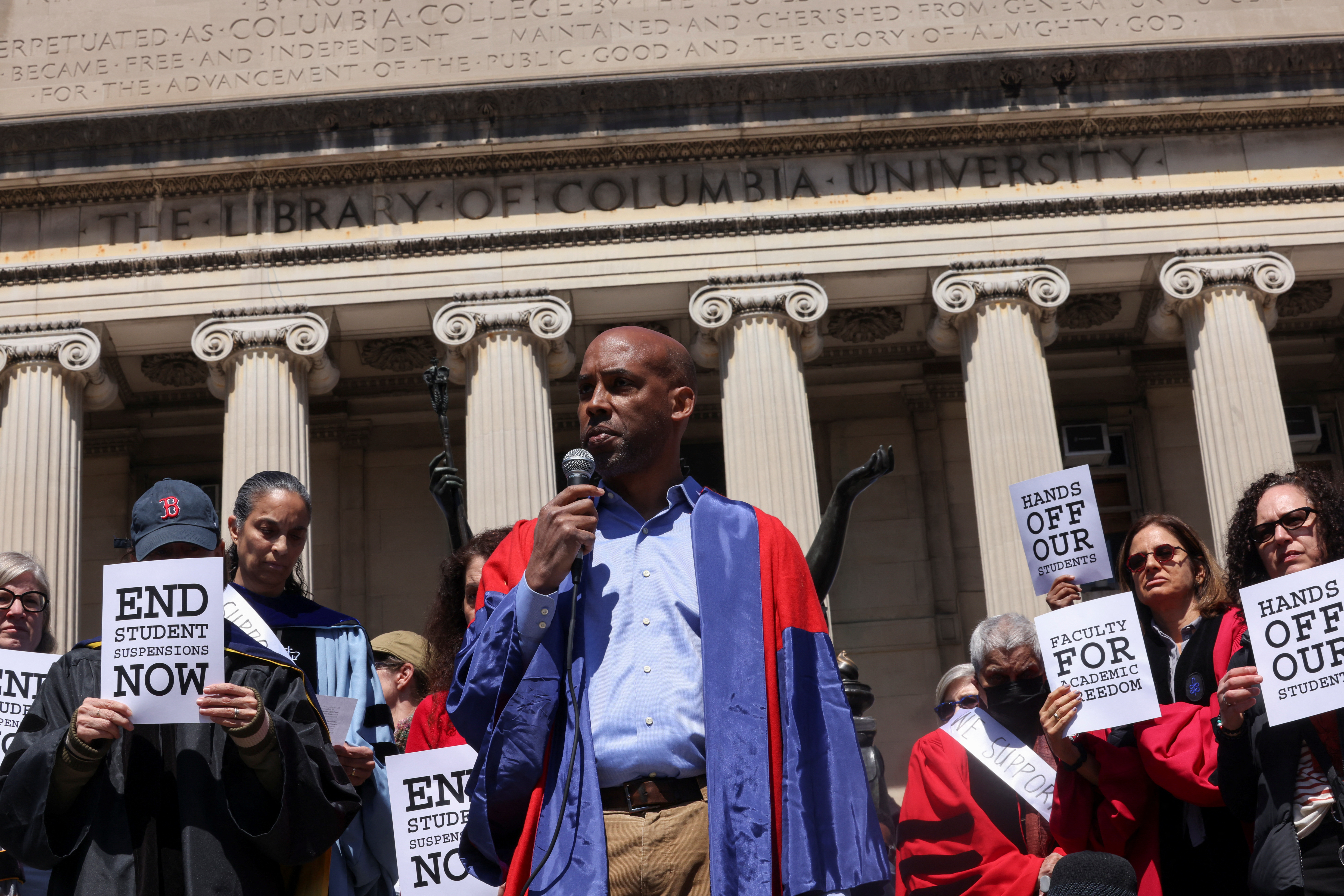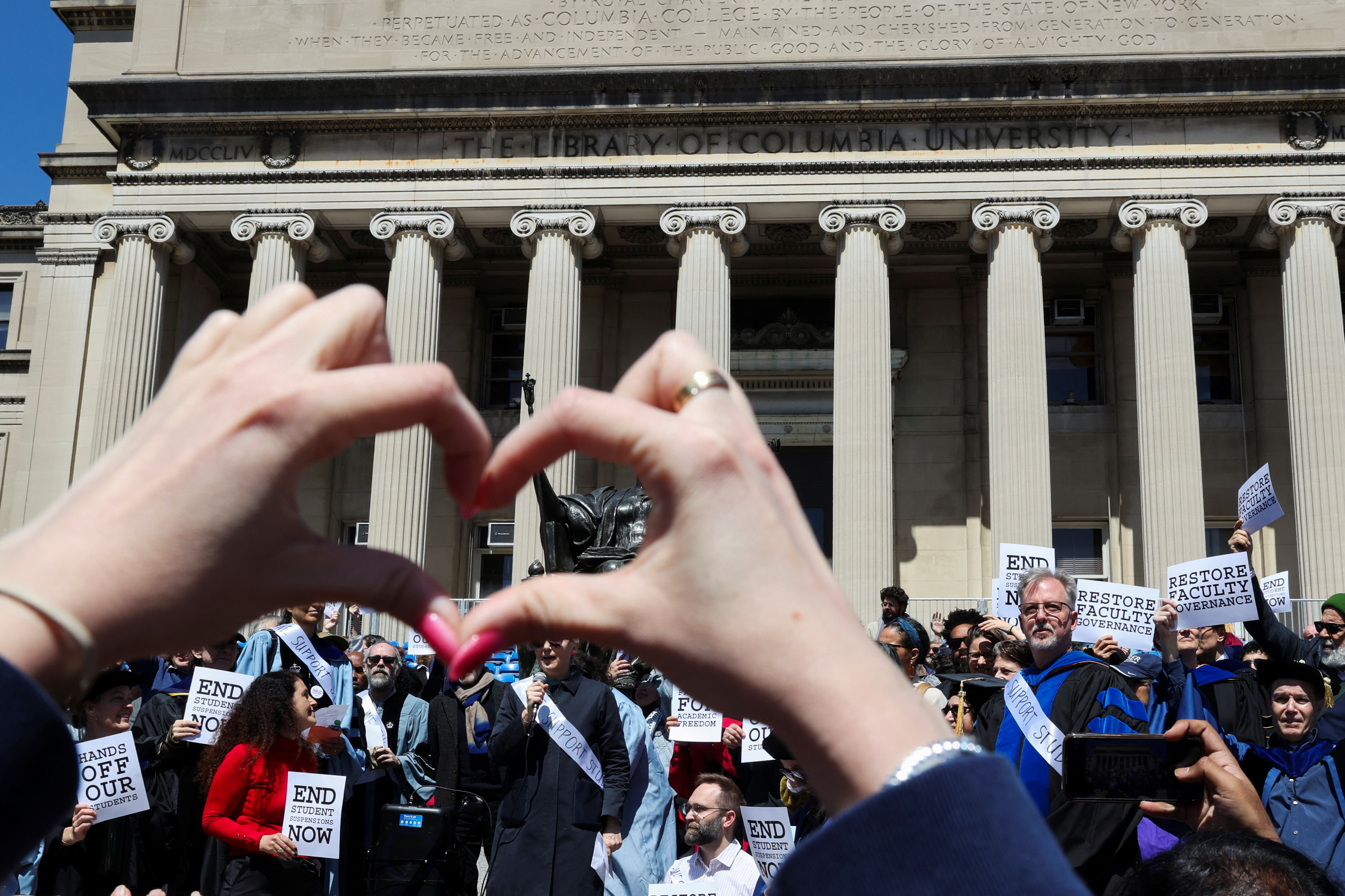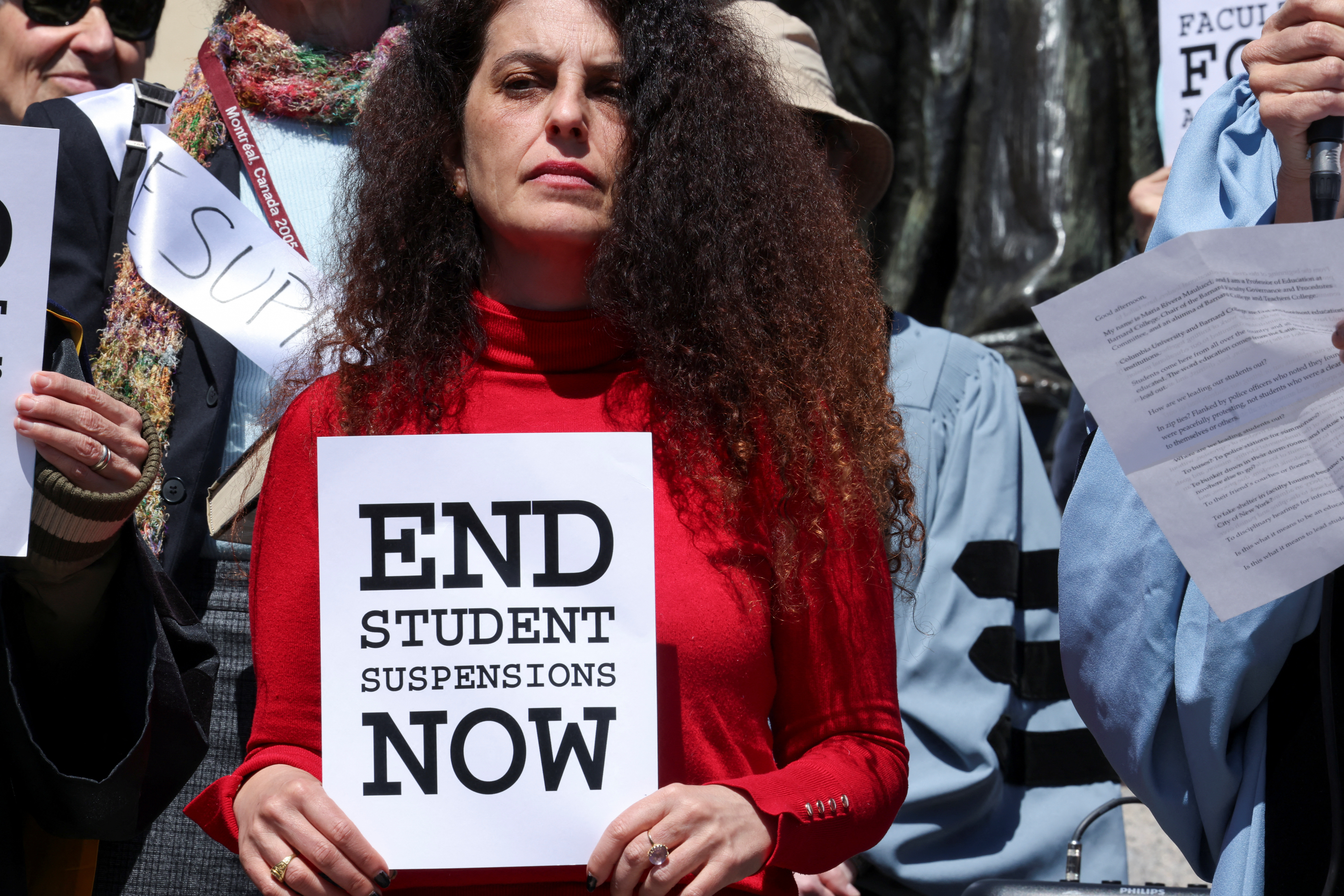 第1项共10项 哥伦比亚大学教师联盟代表哥伦比亚学生,支持言论自由,并反对最近在哥伦比亚大学校园内对学生的警方逮捕,随着以色列和巴勒斯坦伊斯兰组织哈马斯之间的冲突持续进行,纽约市,美国,2024年4月22日,路透社/凯特琳·奥克斯