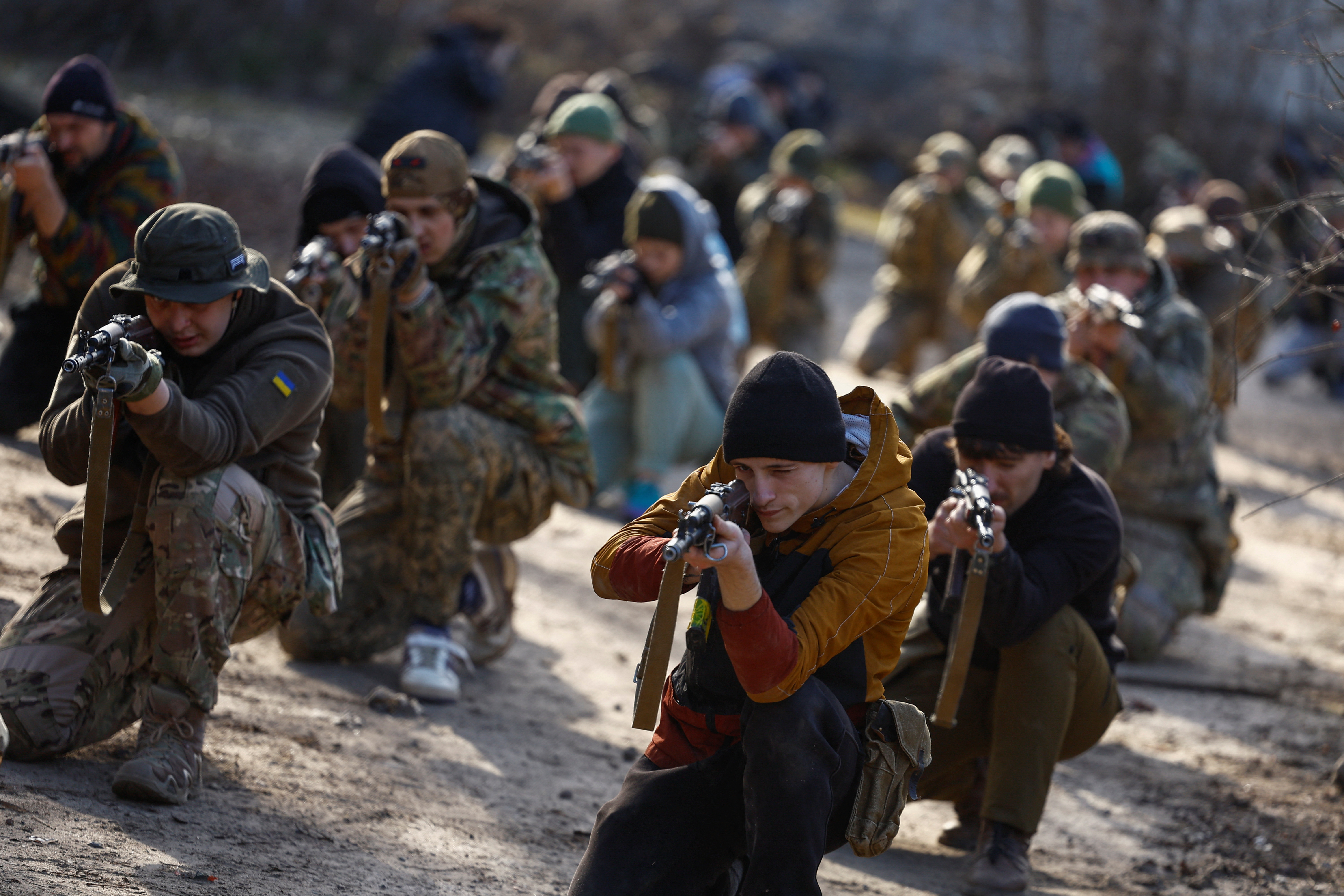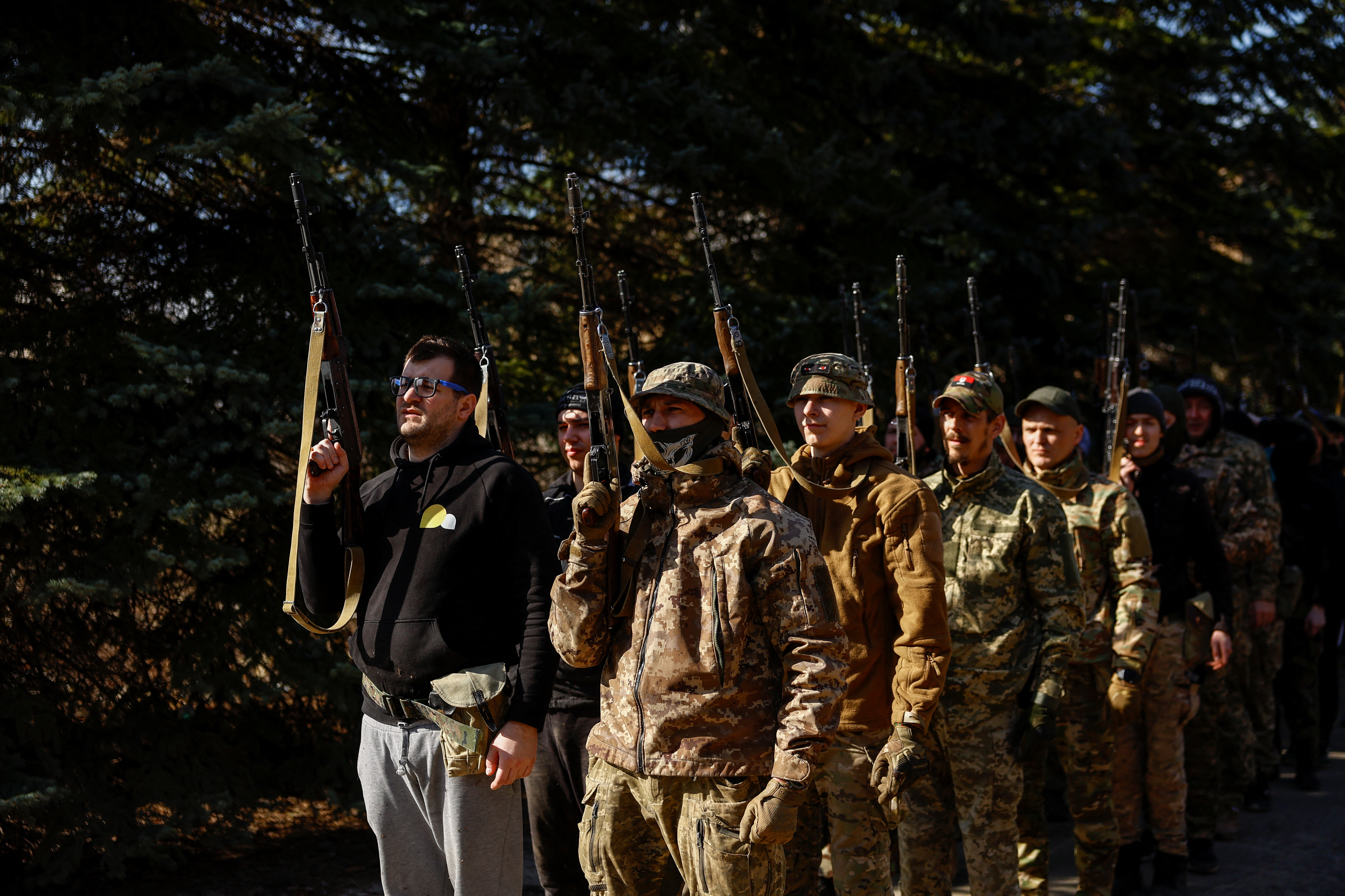第1项5潜在新兵,他们渴望加入乌克兰武装部队第3独立突击旅参加基础军事测试课程,当时俄罗斯正在袭击乌克兰,2024年3月27日,乌克兰基辅。路透社/瓦伦廷·奥吉连科/档案照片