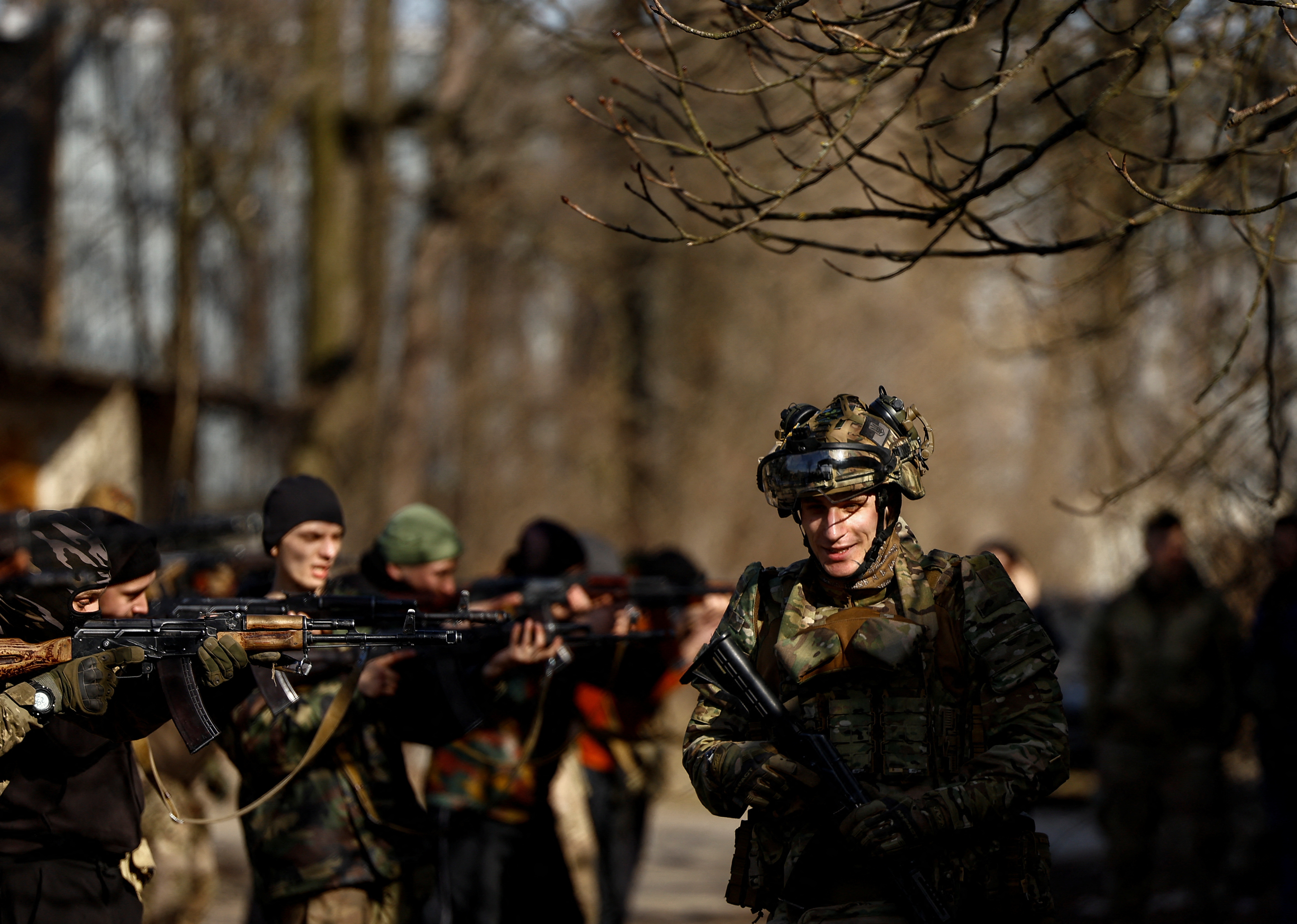 第1项5潜在新兵,他们渴望加入乌克兰武装部队第3独立突击旅参加基础军事测试课程,当时俄罗斯正在袭击乌克兰,2024年3月27日,乌克兰基辅。路透社/瓦伦廷·奥吉连科/档案照片