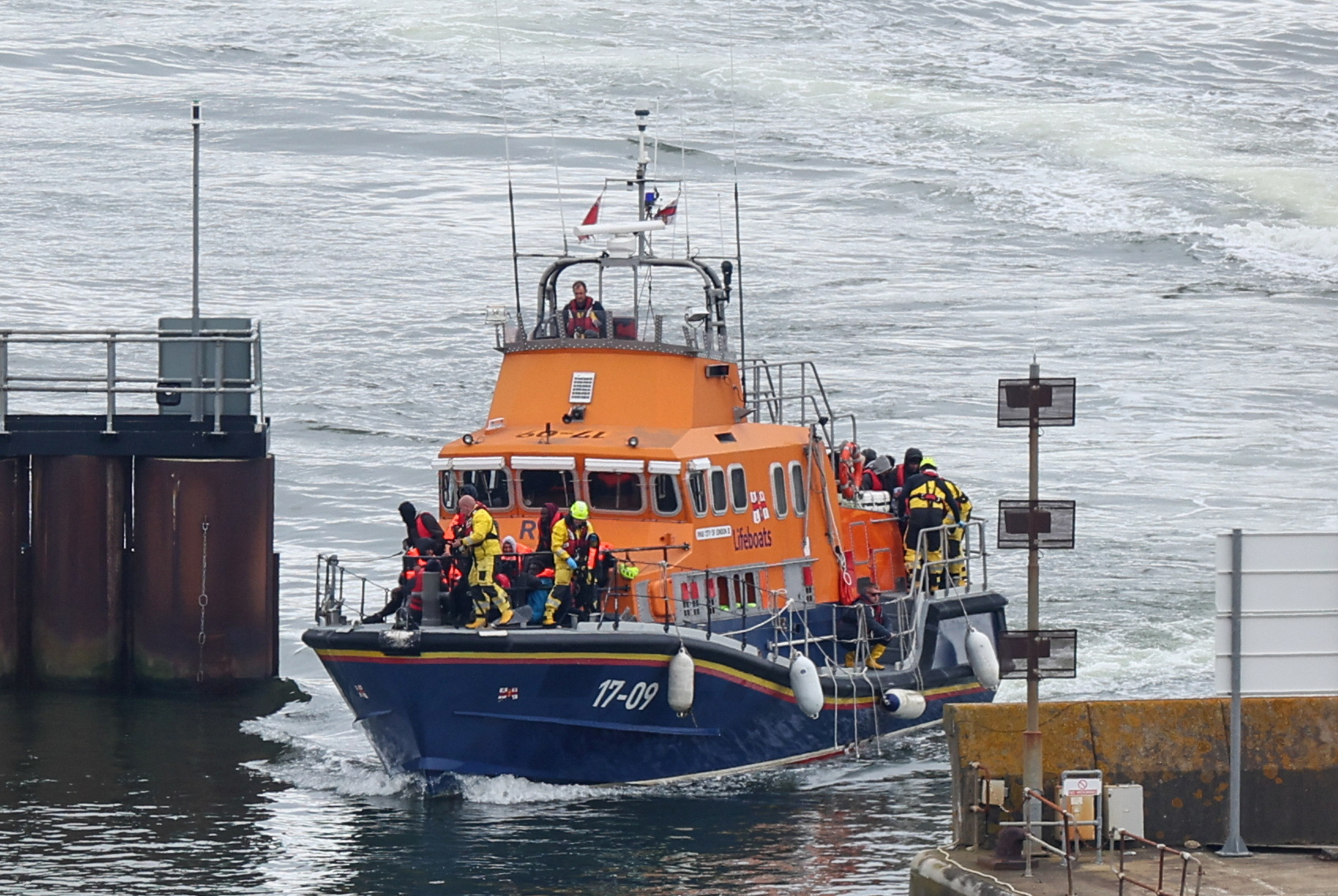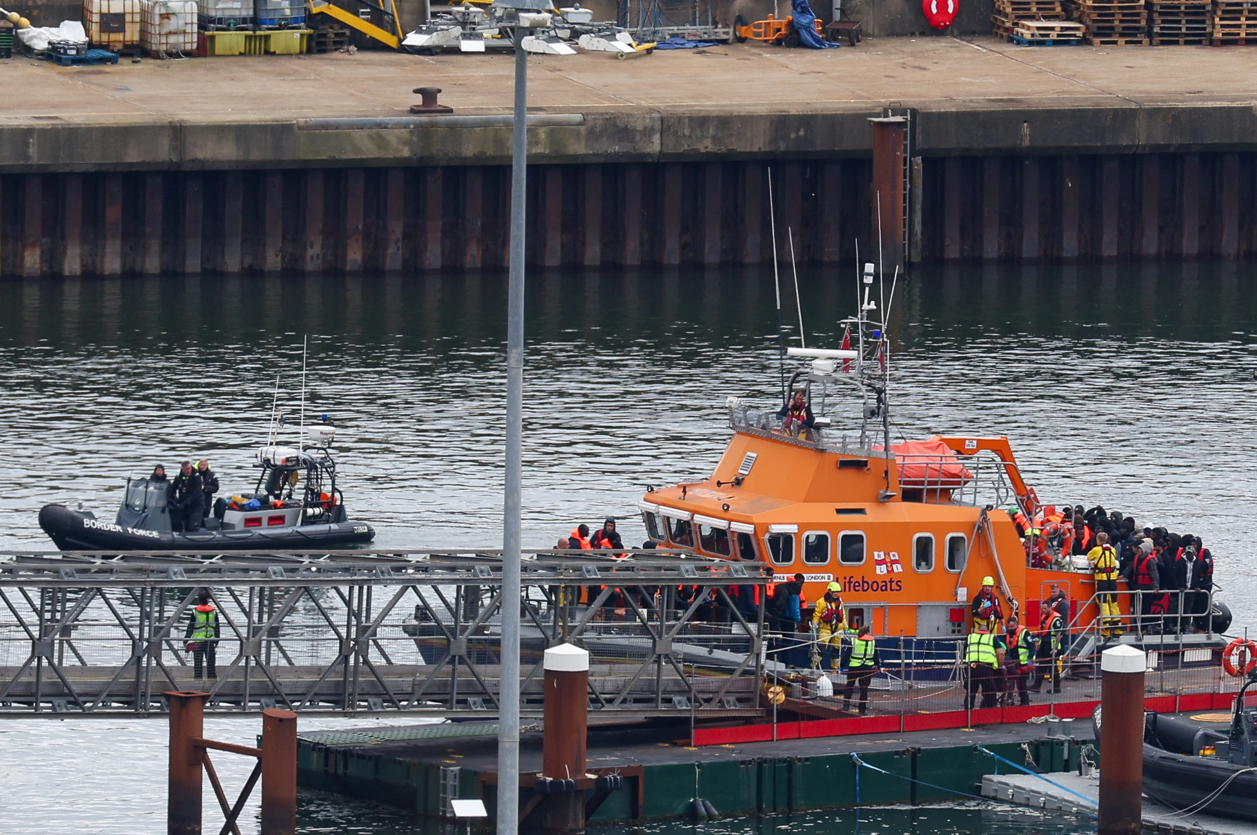 第1项,共8项 人们,据信是移民,乘坐救生艇抵达英国多佛港,2024年4月23日。路透社/托比·梅尔维尔/档案照片