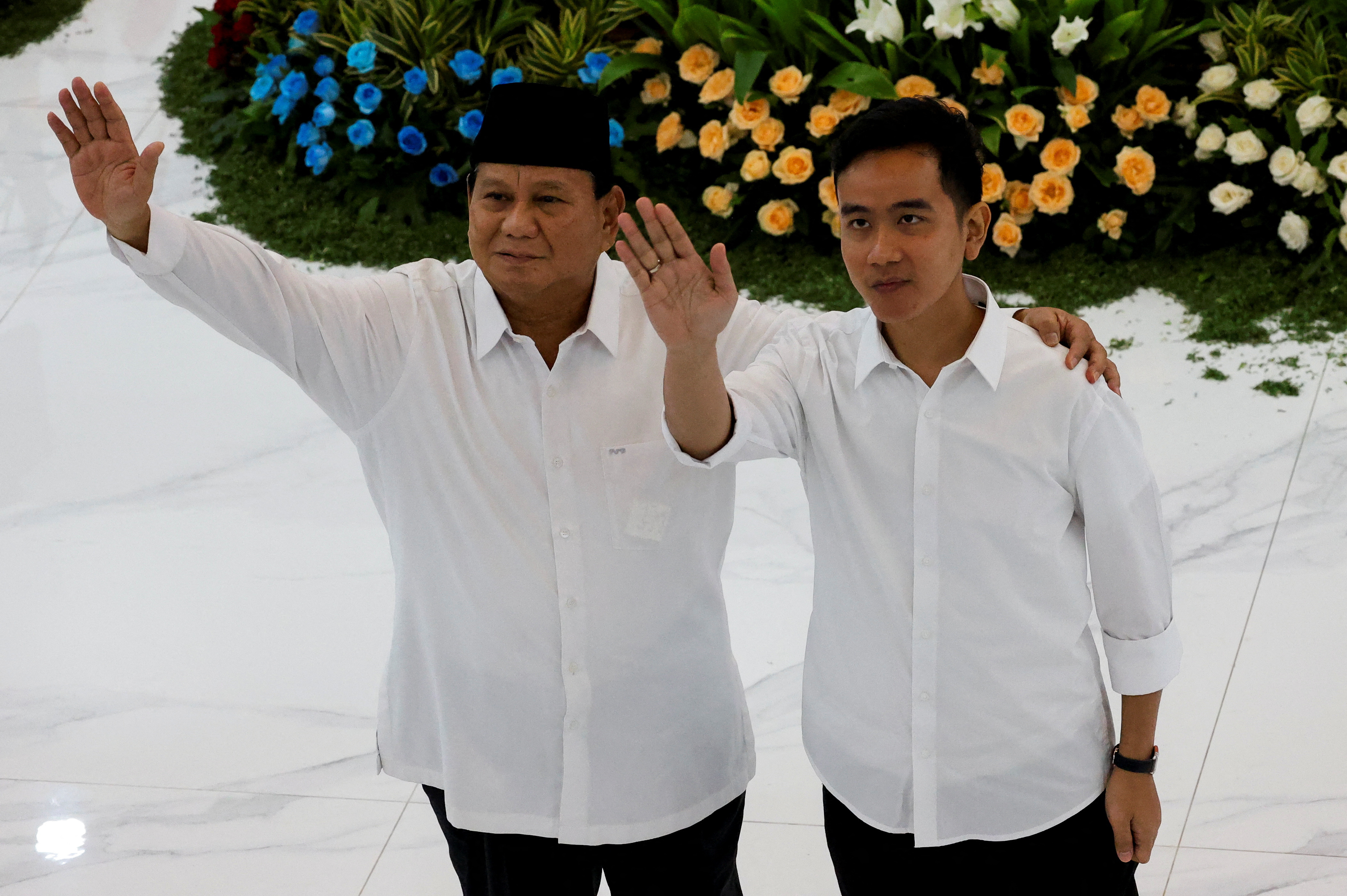 项目 1 共 3 印尼当选总统普拉博沃·苏比安托和当选副总统吉布兰·拉卡布明·拉卡在印尼雅加达的全国选举委员会(KPU)总部,正式宣布他们为总统选举获胜者后挥手致意,日期为2024年4月24日。路透社/阿杰恩·迪纳尔·乌尔菲安娜