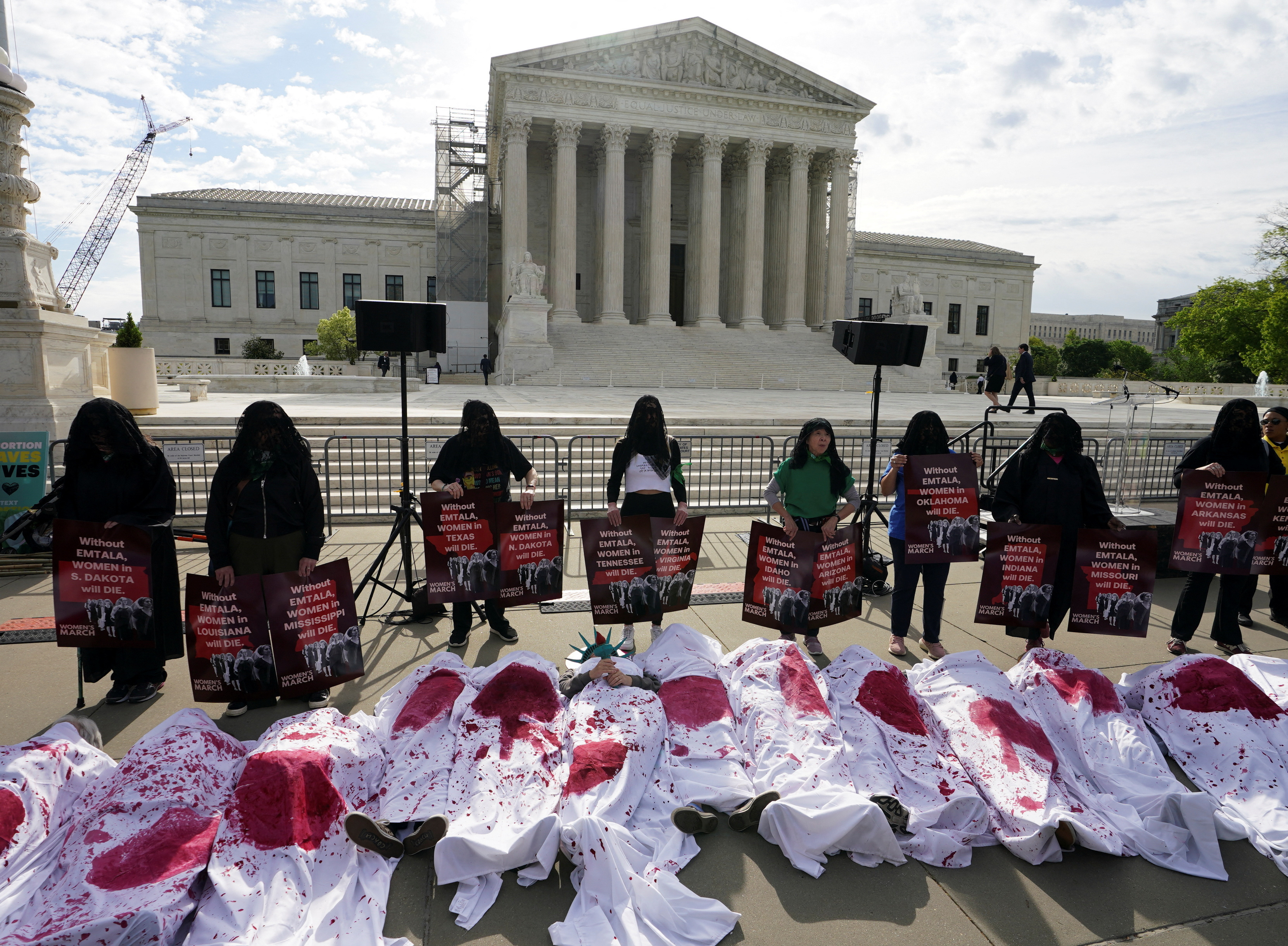第1项,共8项 堕胎权利支持者在华盛顿举行“死尸抗议”,支持“生育权和紧急堕胎护理”,在最高法院法官听取关于爱达荷州共和党支持的几乎全面堕胎禁令在医疗紧急情况下的合法性口头辩论的当天,2024年4月24日。路透社/凯文·拉马奎