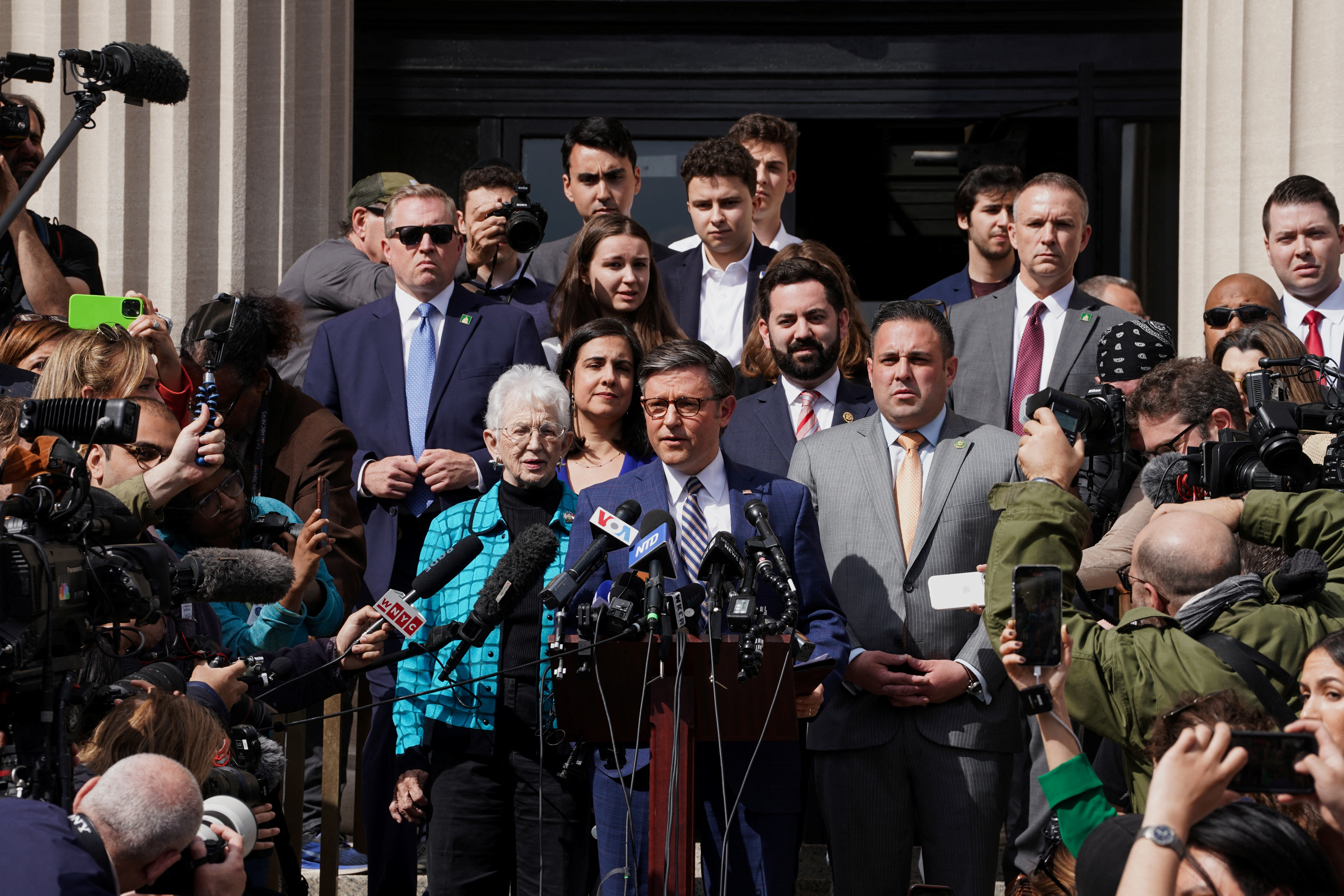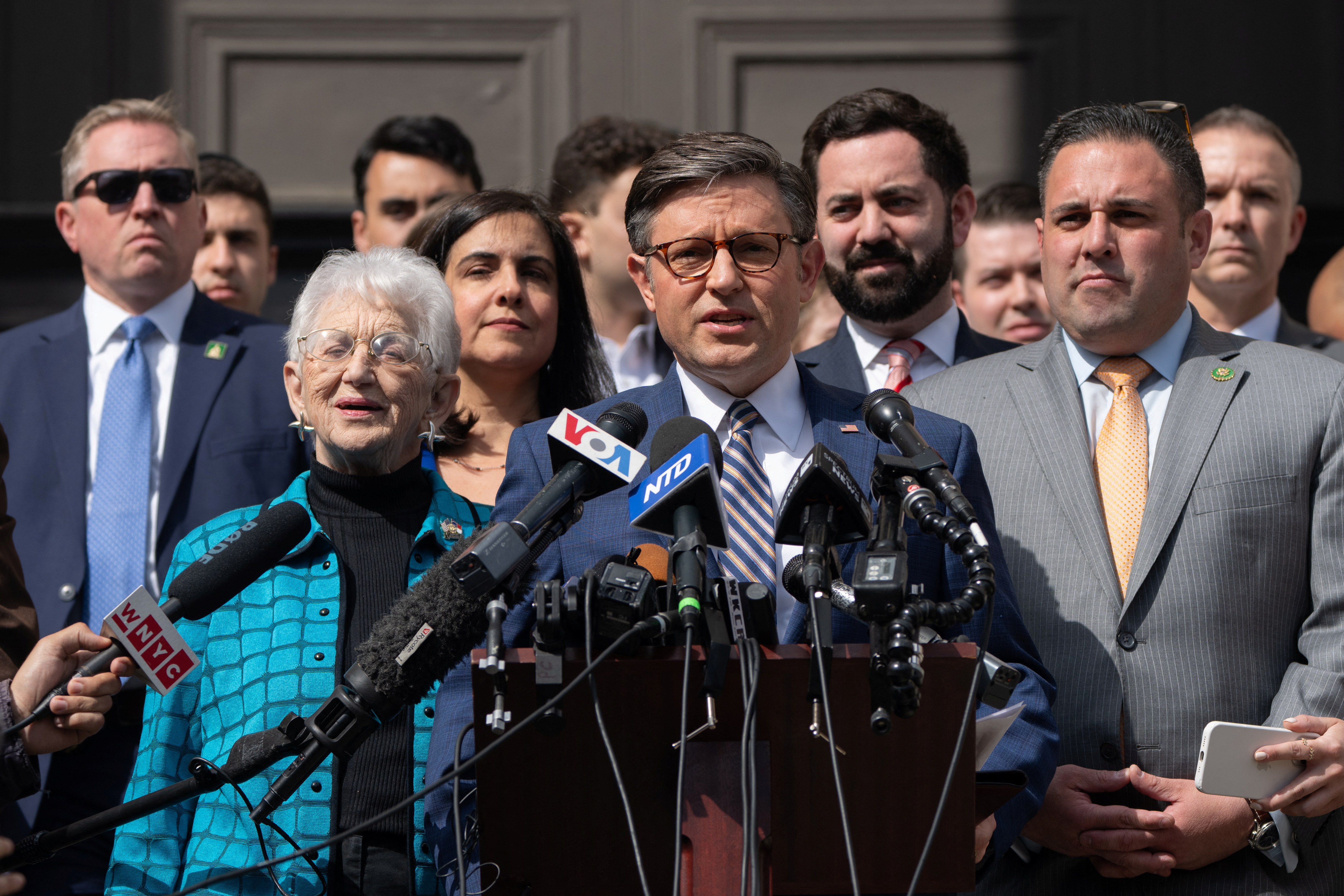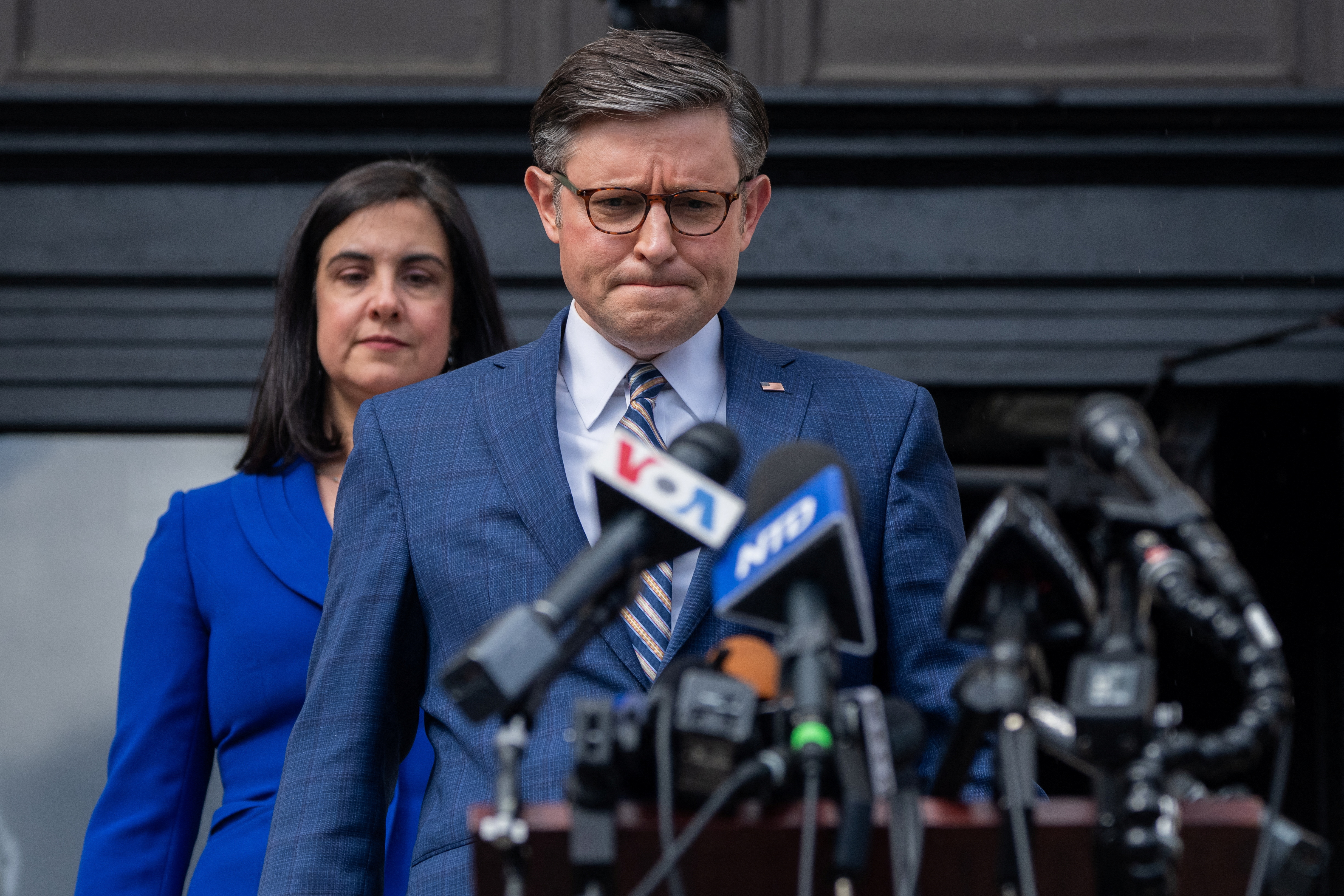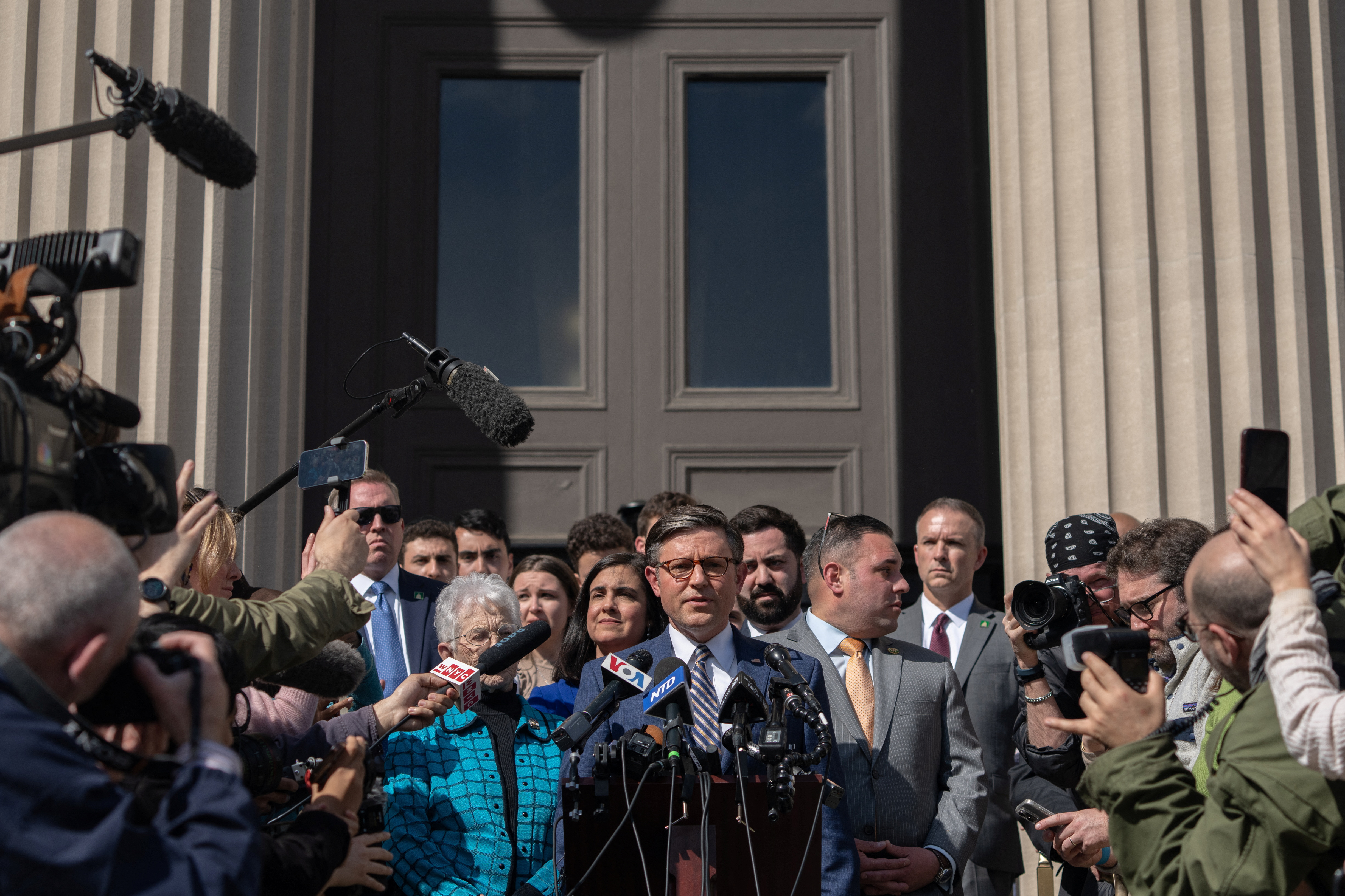 第1项,共13项 美国众议院议长迈克·约翰逊(R-LA)在哥伦比亚大学召开新闻发布会,回应示威者支持巴勒斯坦人的抗议,期间以色列与巴勒斯坦伊斯兰组织哈马斯之间的冲突仍在继续,地点为美国纽约市,2024年4月24日。路透社/吉娜·穆恩