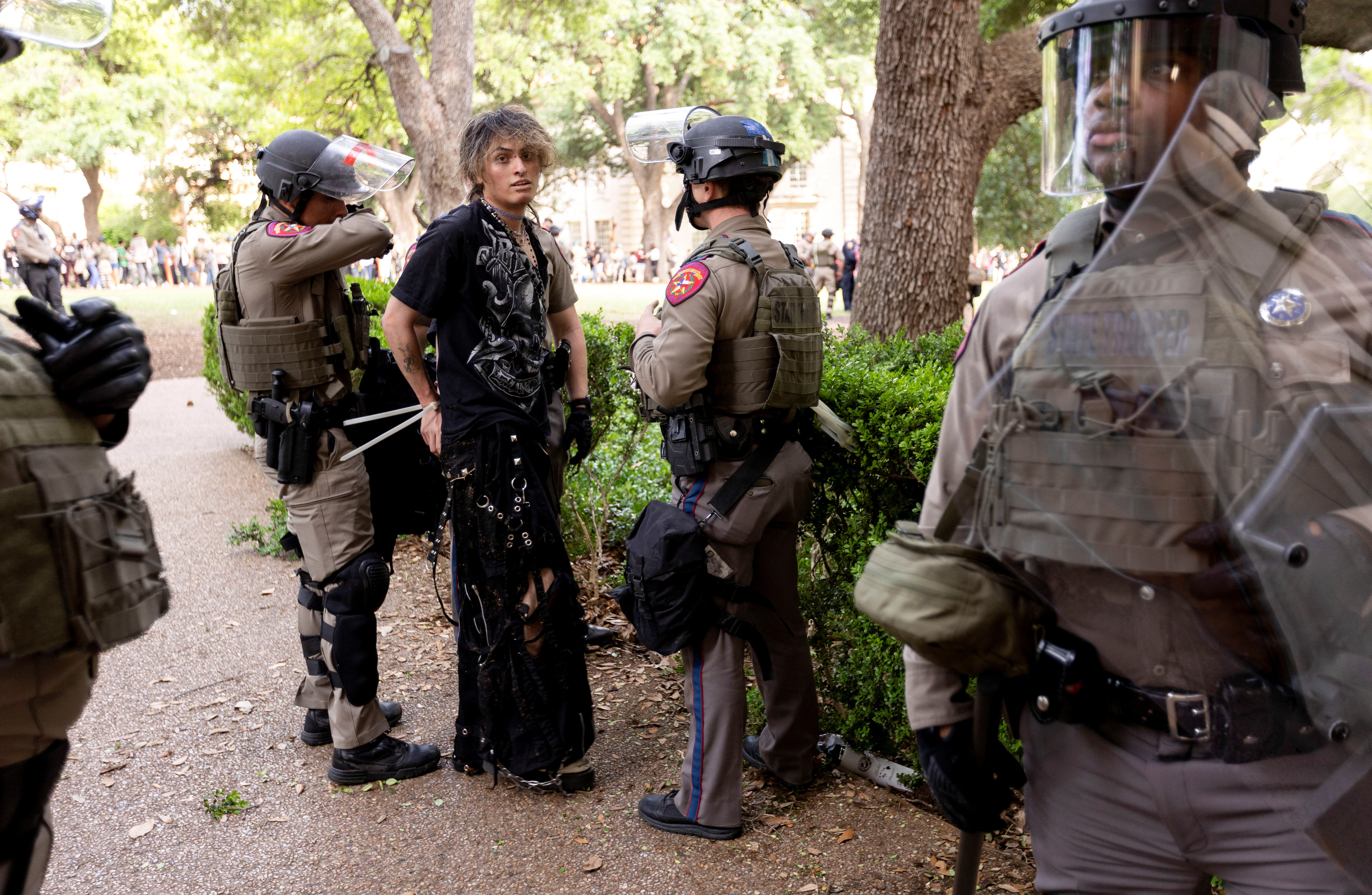 在德克萨斯州,州公路巡警穿着防暴装备,骑警在周三打散了在奥斯汀德克萨斯大学的抗议活动。德克萨斯公共安全部在X上发布消息称,已有34人被逮捕。
