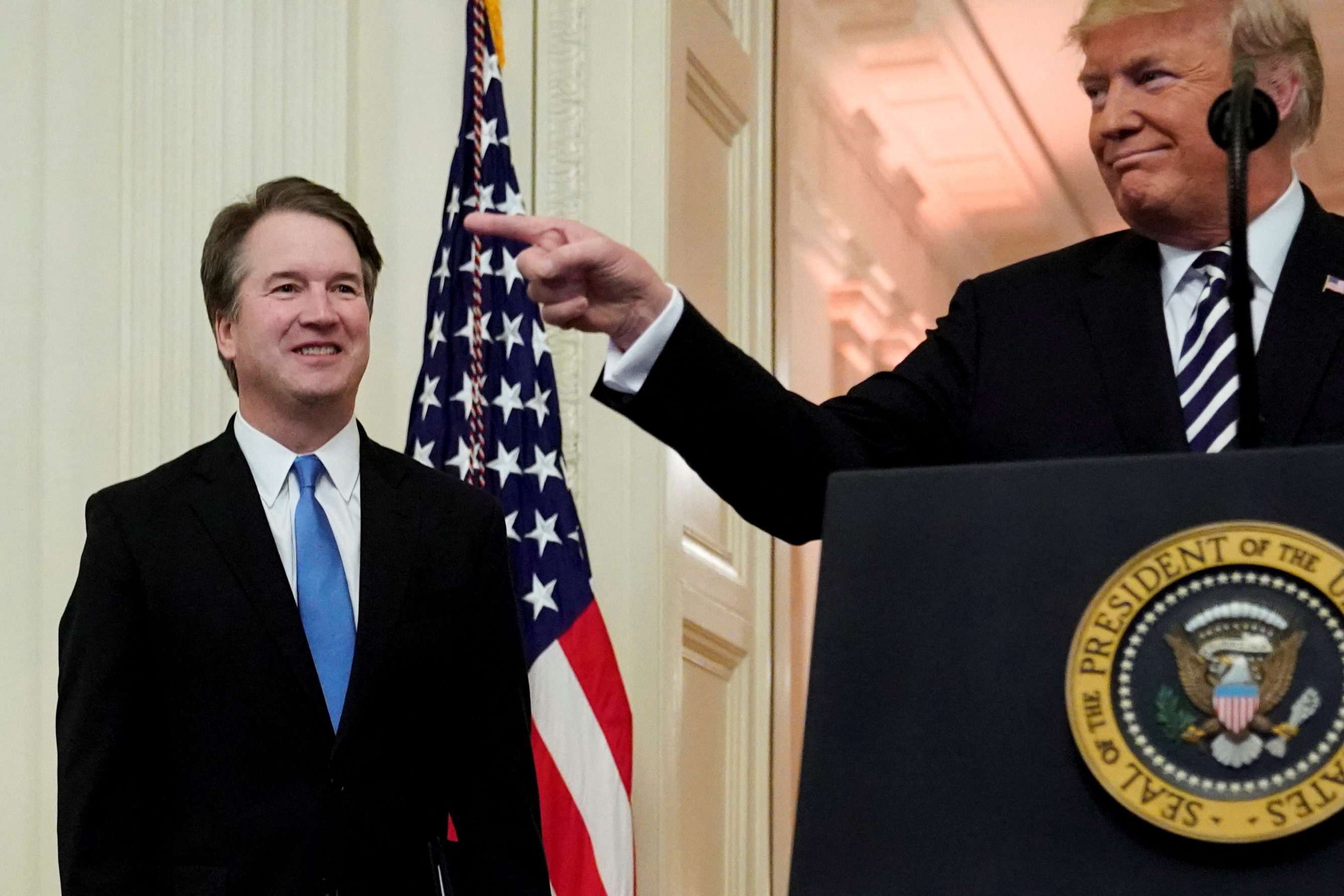 第1项共2项美国总统唐纳德·特朗普在华盛顿白宫东厅参加仪式性公开宣誓就职时,与美国最高法院大法官布雷特·卡瓦诺一起讲话。2018年10月8日。路透社/乔纳森·恩斯特/档案照片