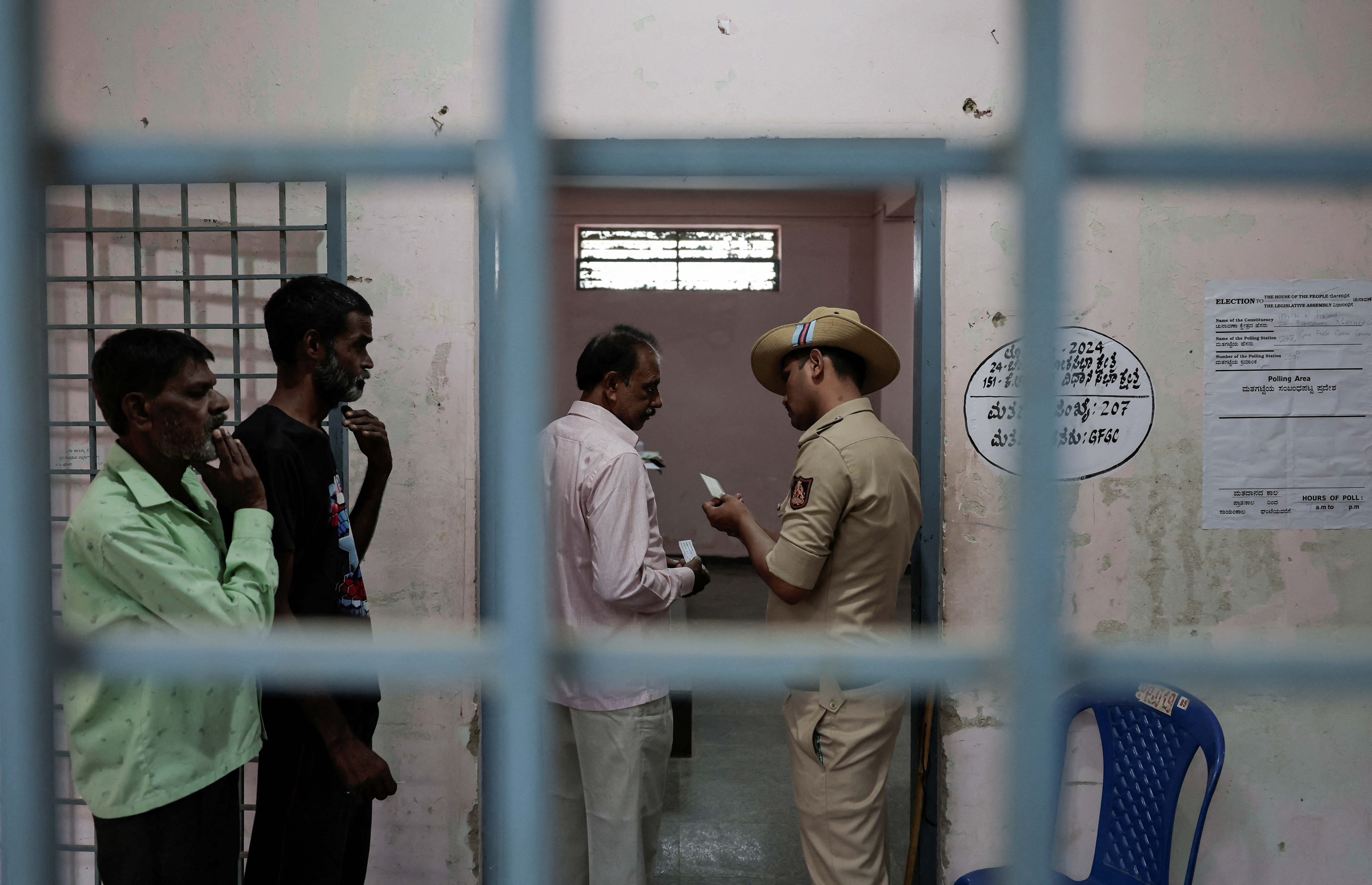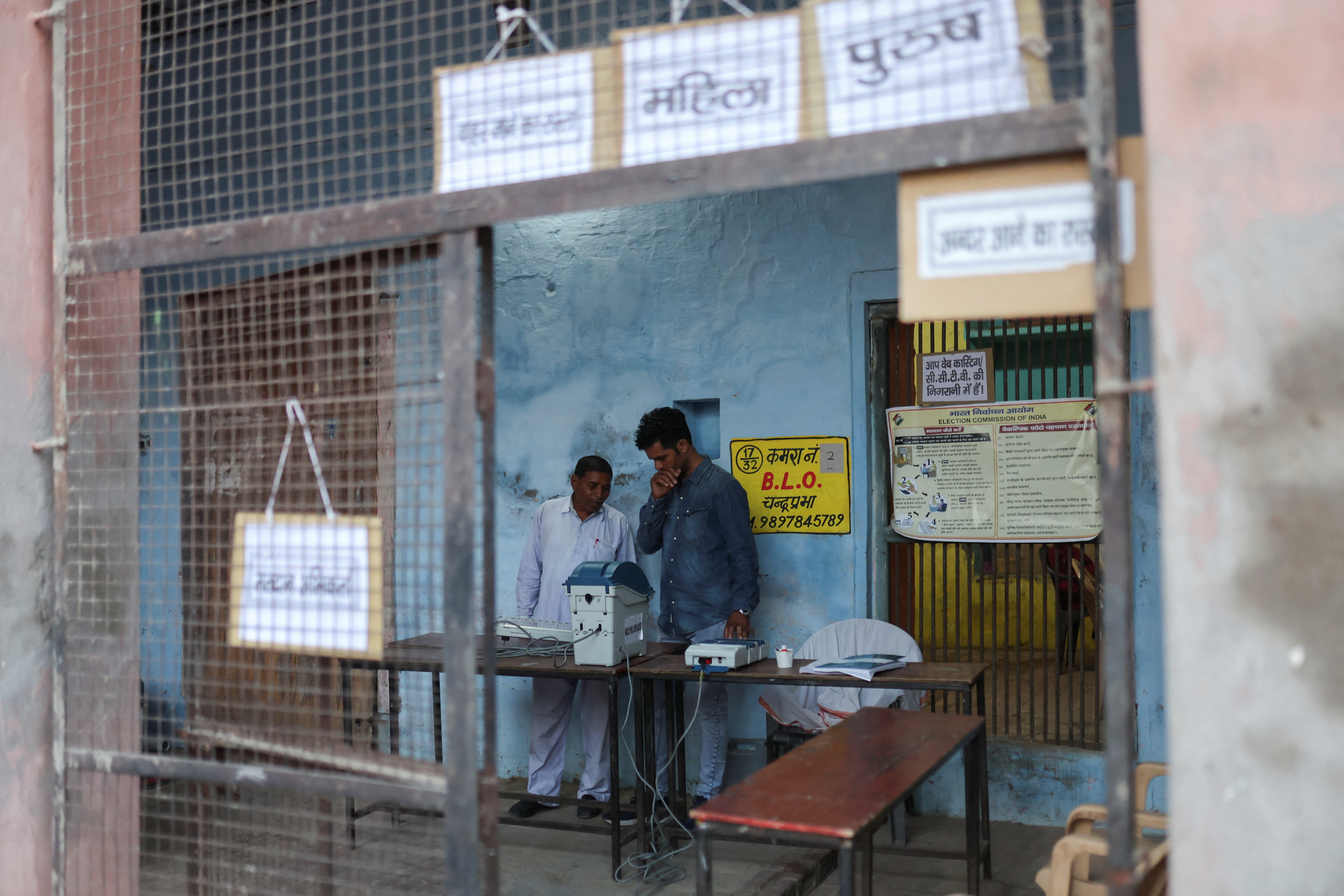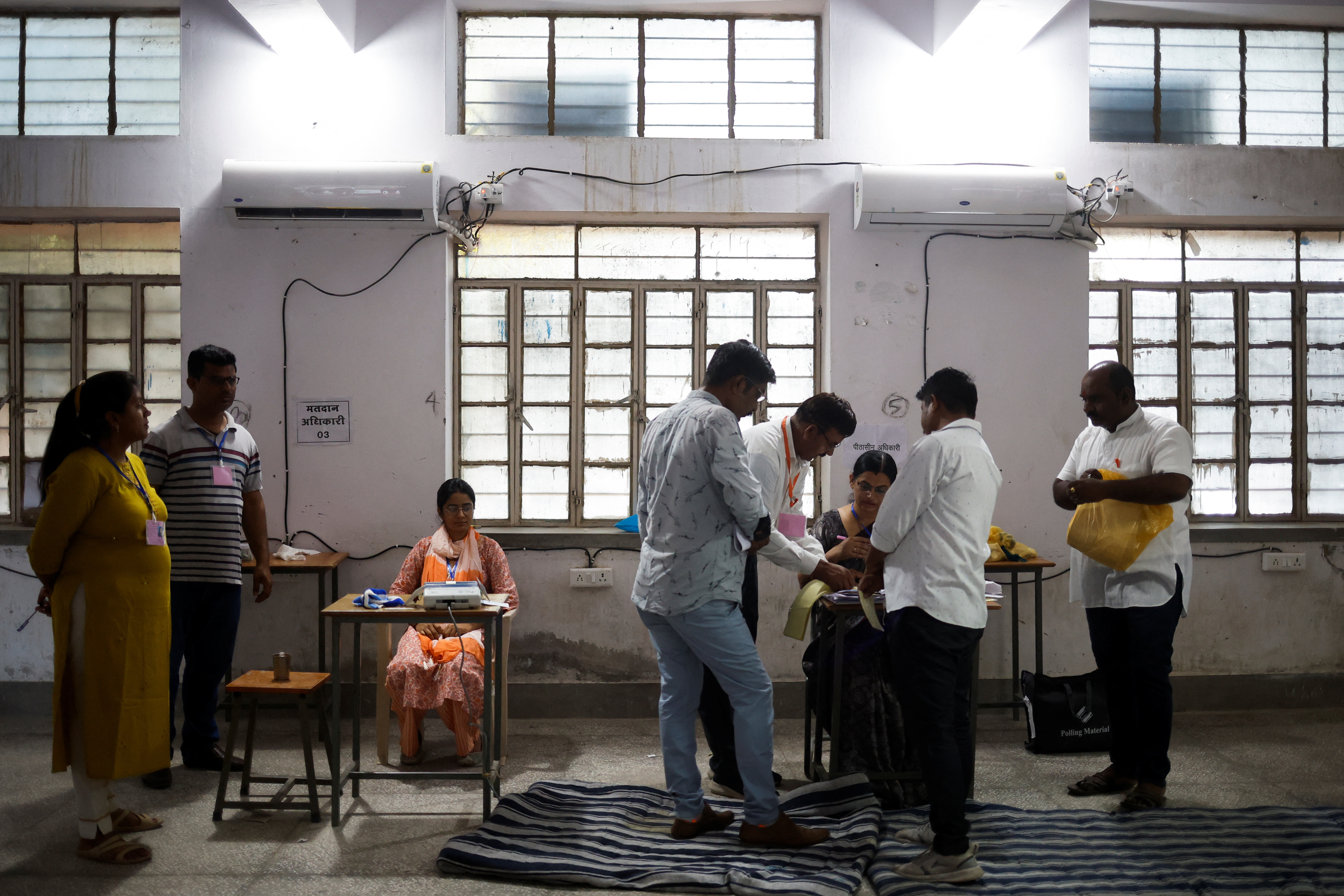 第1项,选举官员在印度拉贾斯坦邦巴尔默的一个投票站工作,2024年4月26日。路透社/阿德南·阿比迪