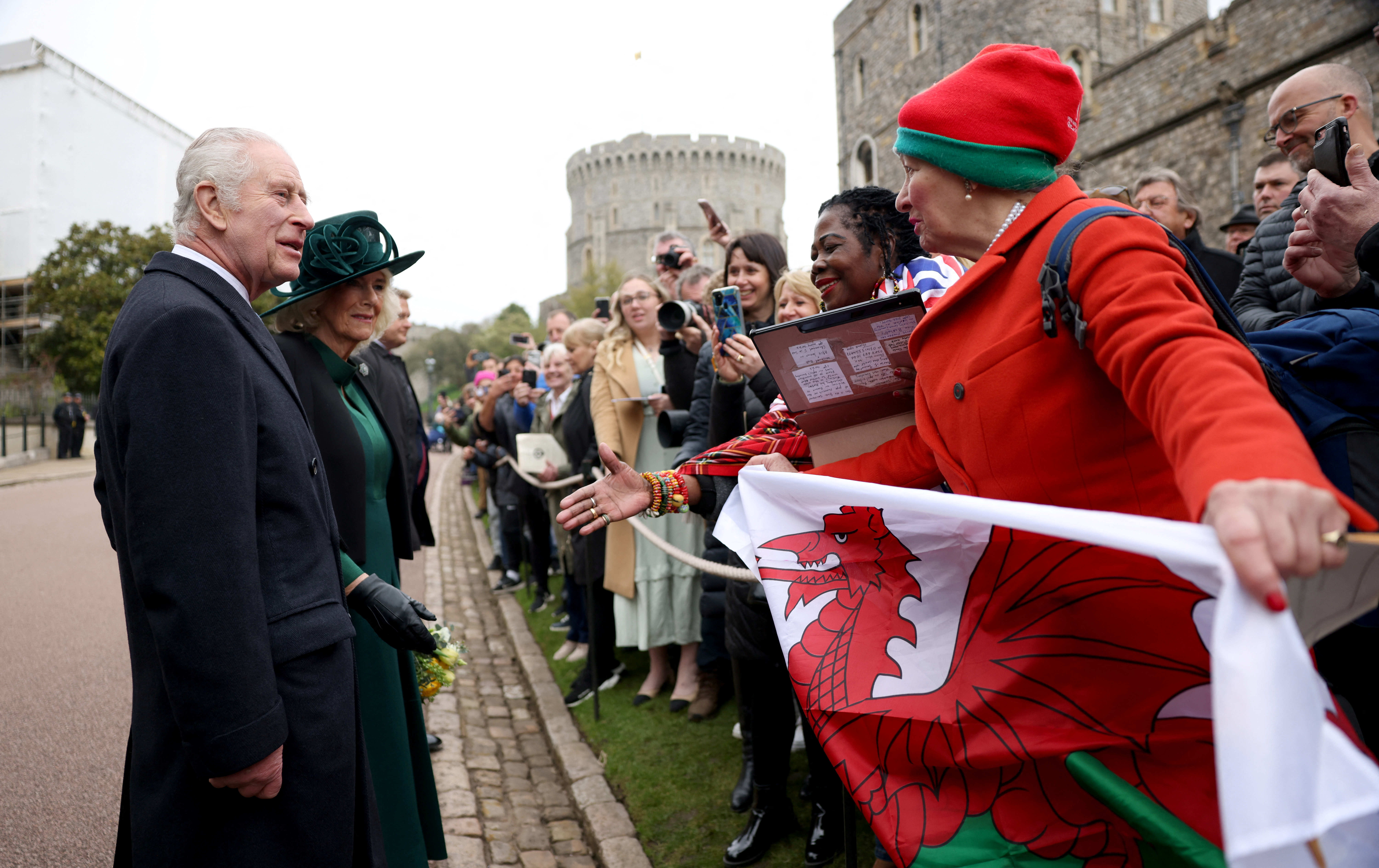 第1项,英国国王查尔斯和王后卡米拉在温莎城堡圣乔治教堂出席复活节晨祷仪式后向人们致意,2024年3月31日,英国。路透社/霍利·亚当斯/池/档案照片