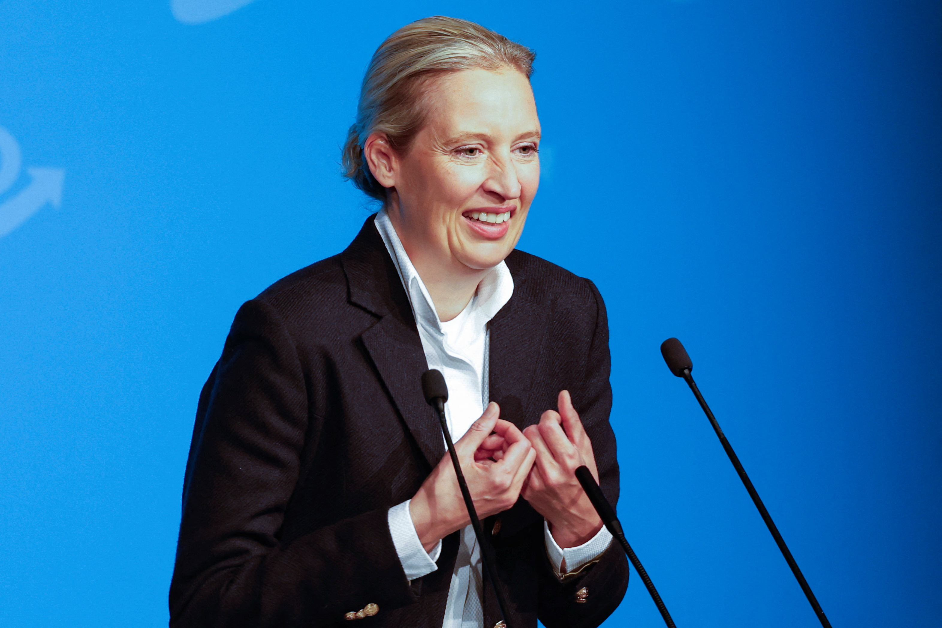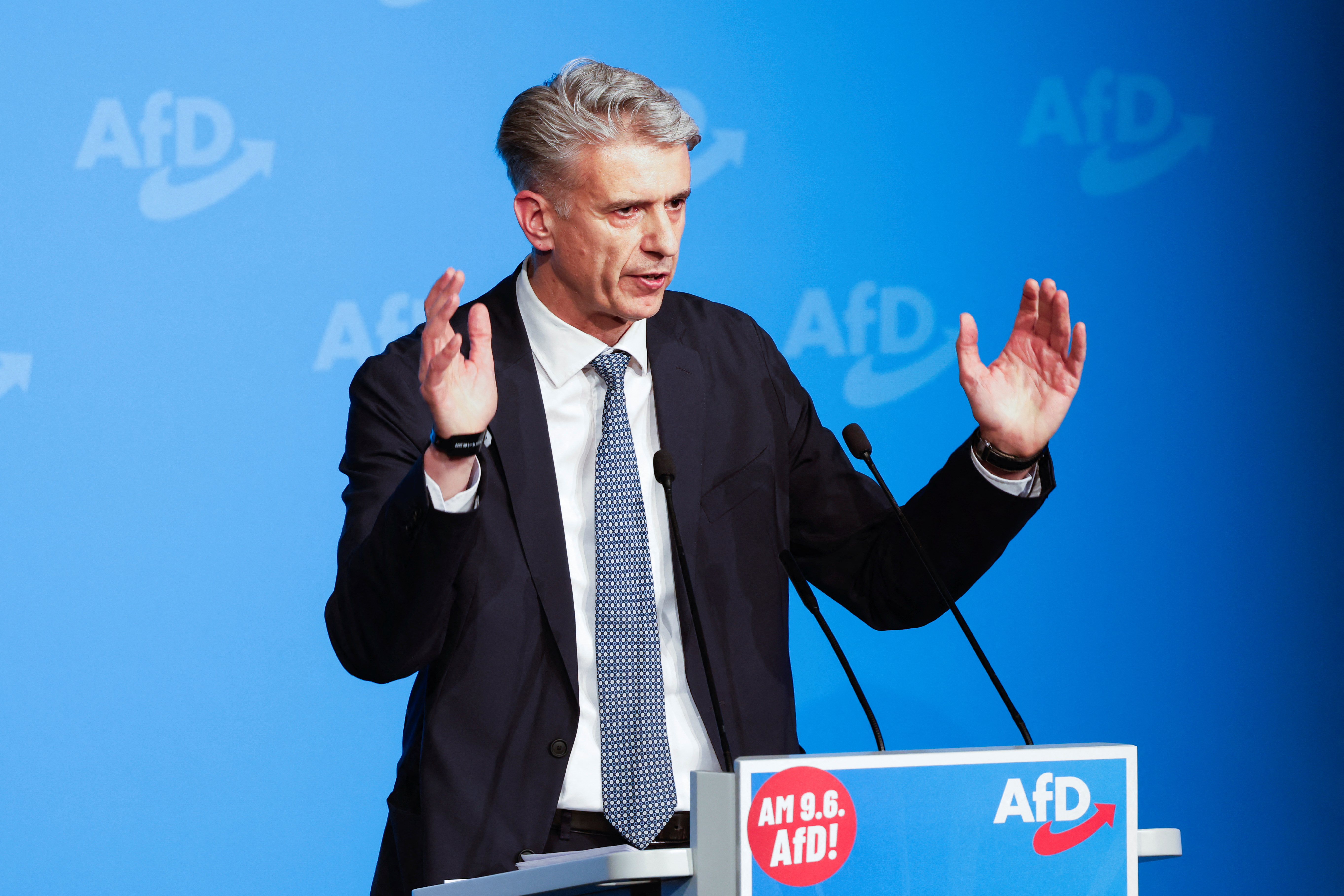 第1项,AfD成员蒂诺·克鲁帕拉发言,右翼德国选择党(AfD)在德国萨克森、图林根、勃兰登堡三个东部地区和欧洲议会选举中的竞选活动启动,2024年4月27日,德国多瑙河辛根。路透社/海科·贝克