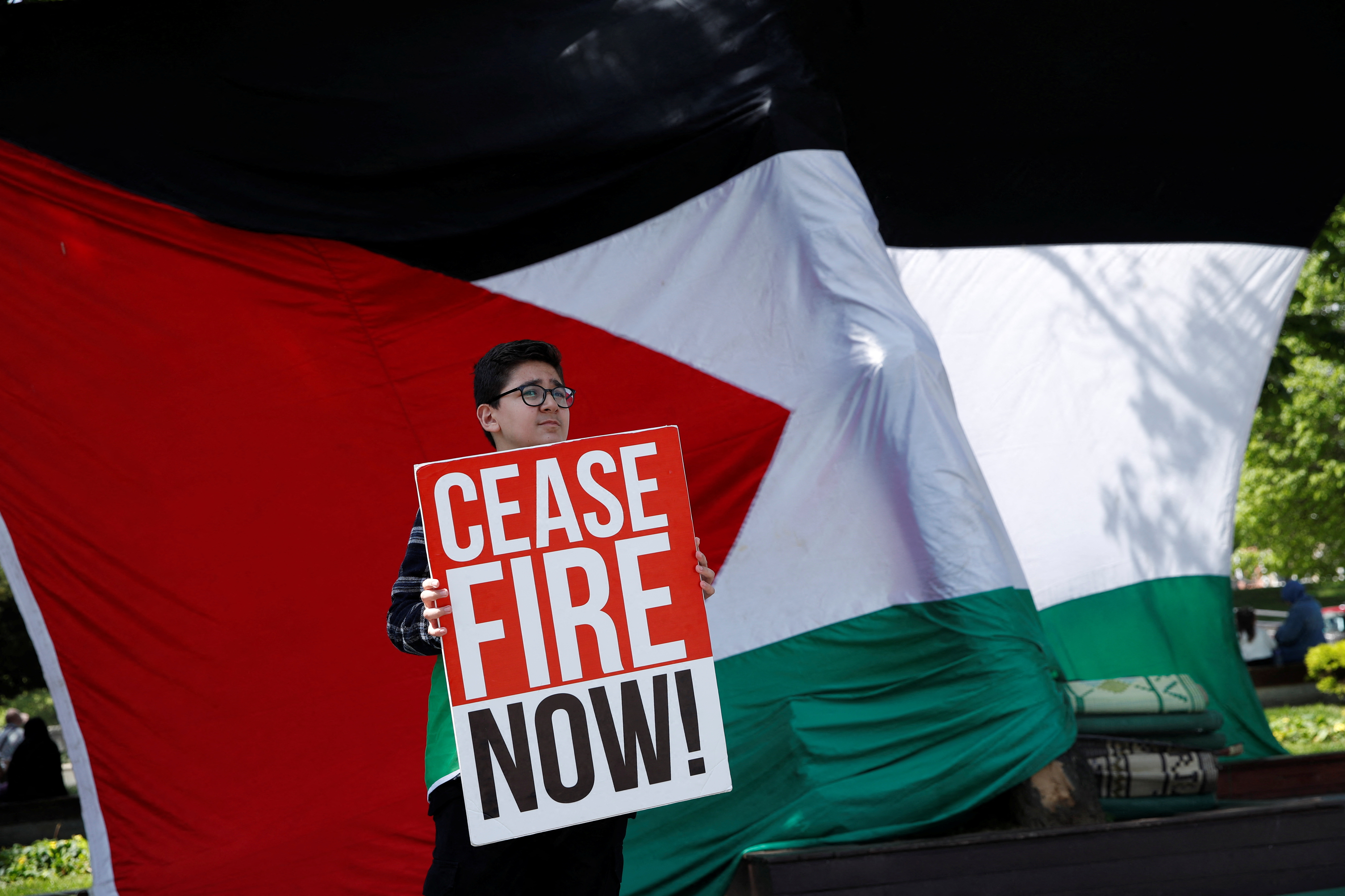一名示威者在伊斯坦布尔,土耳其,4月27日,举行的支持巴勒斯坦人的抗议活动中举着标语,背景是以色列与巴勒斯坦伊斯兰组织哈马斯之间的持续冲突。路透社/迪拉拉·森卡亚土耳其人道主义救助基金会(IHH)是民间自由船队联盟的主要组织者,该联盟由人权活动人士组成,包括律师、医生和护士,他们聚集在一起,直接向加沙提供援助。