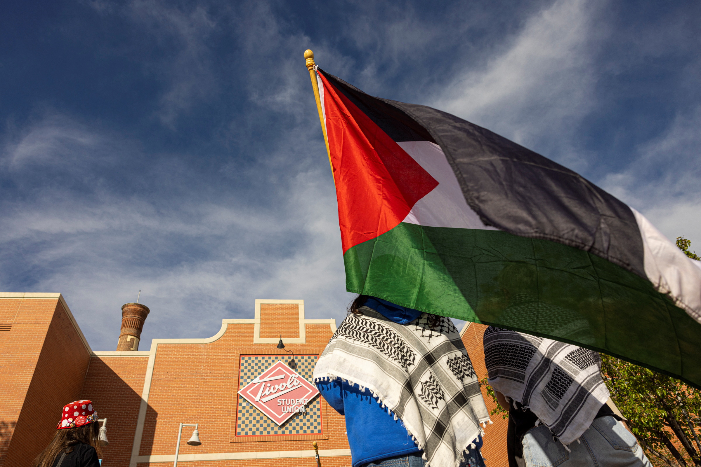 第1项,共2项 抗议者在美国科罗拉多州丹佛的奥拉里亚校园学生会外升起巴勒斯坦国旗,2024年5月14日。路透社/凯文·莫哈特