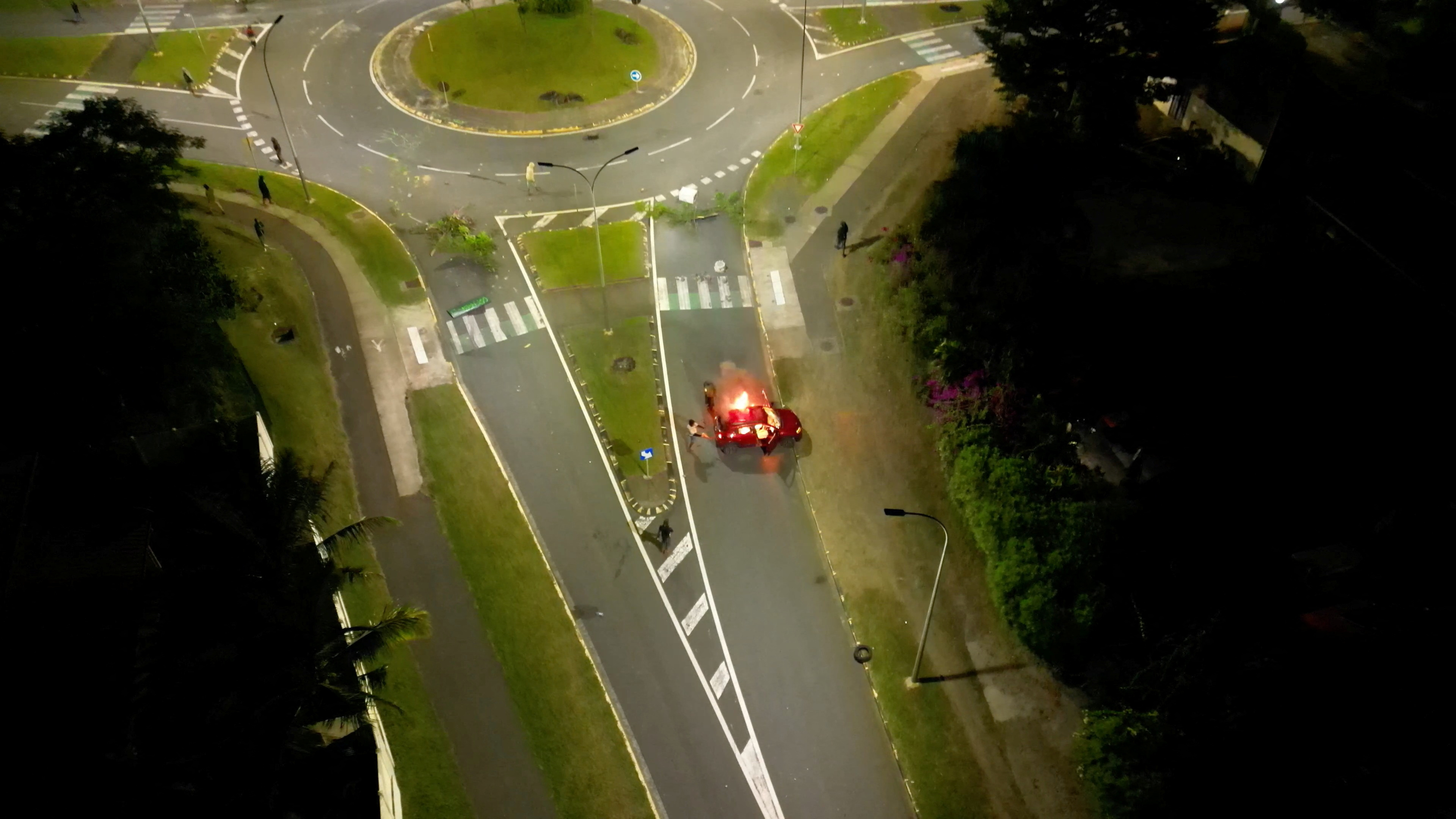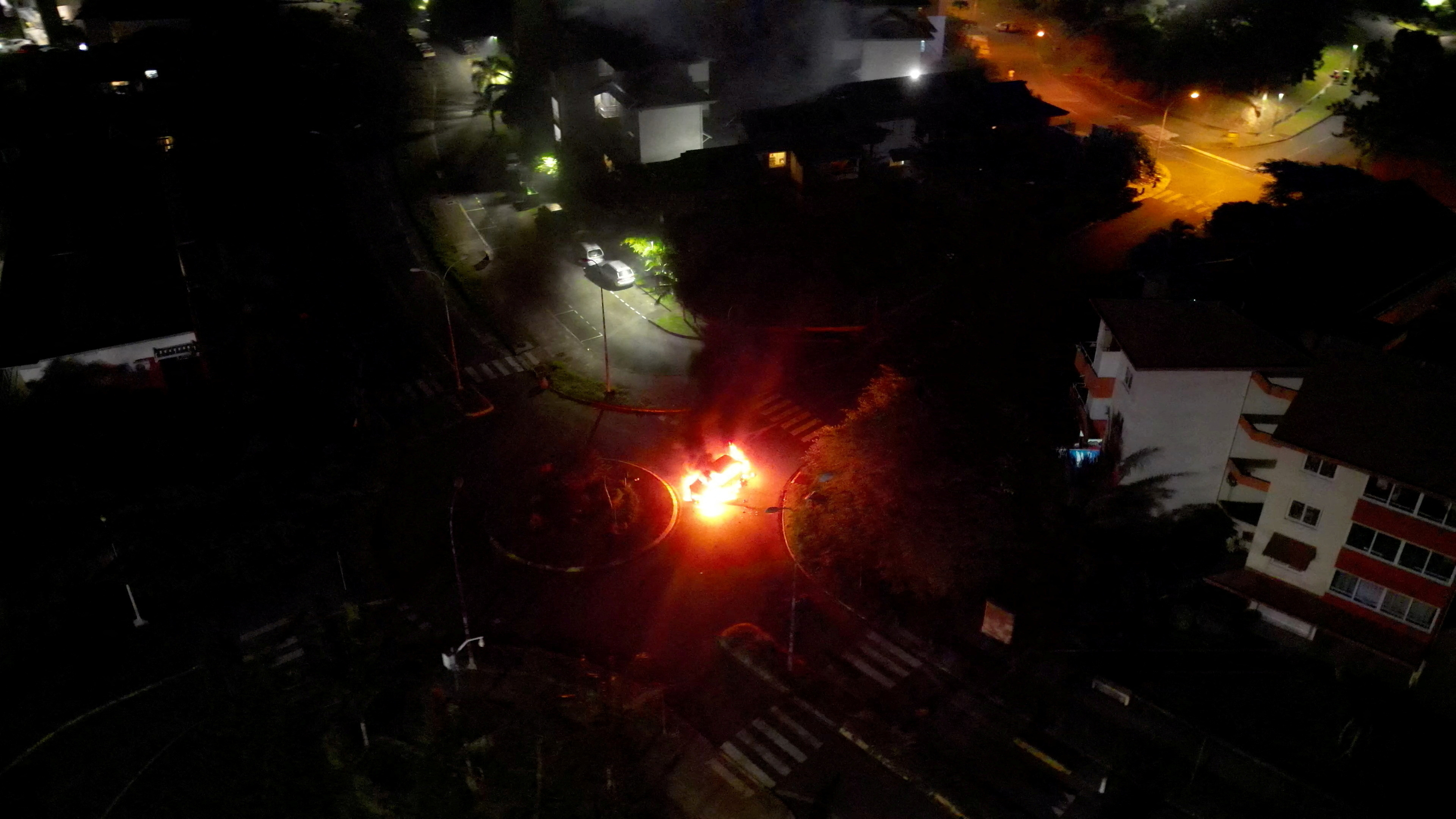 第1/2项:在法属领土新喀里多尼亚,原住民卡纳克抗议者反对允许更多人参加地方选举计划,一辆汽车被纵火焚烧,2024年5月18日,法国统治的新喀里多尼亚努美阿的抗议活动中,这是路透社获得的视频截图。视频由路透社获得/通过路透社