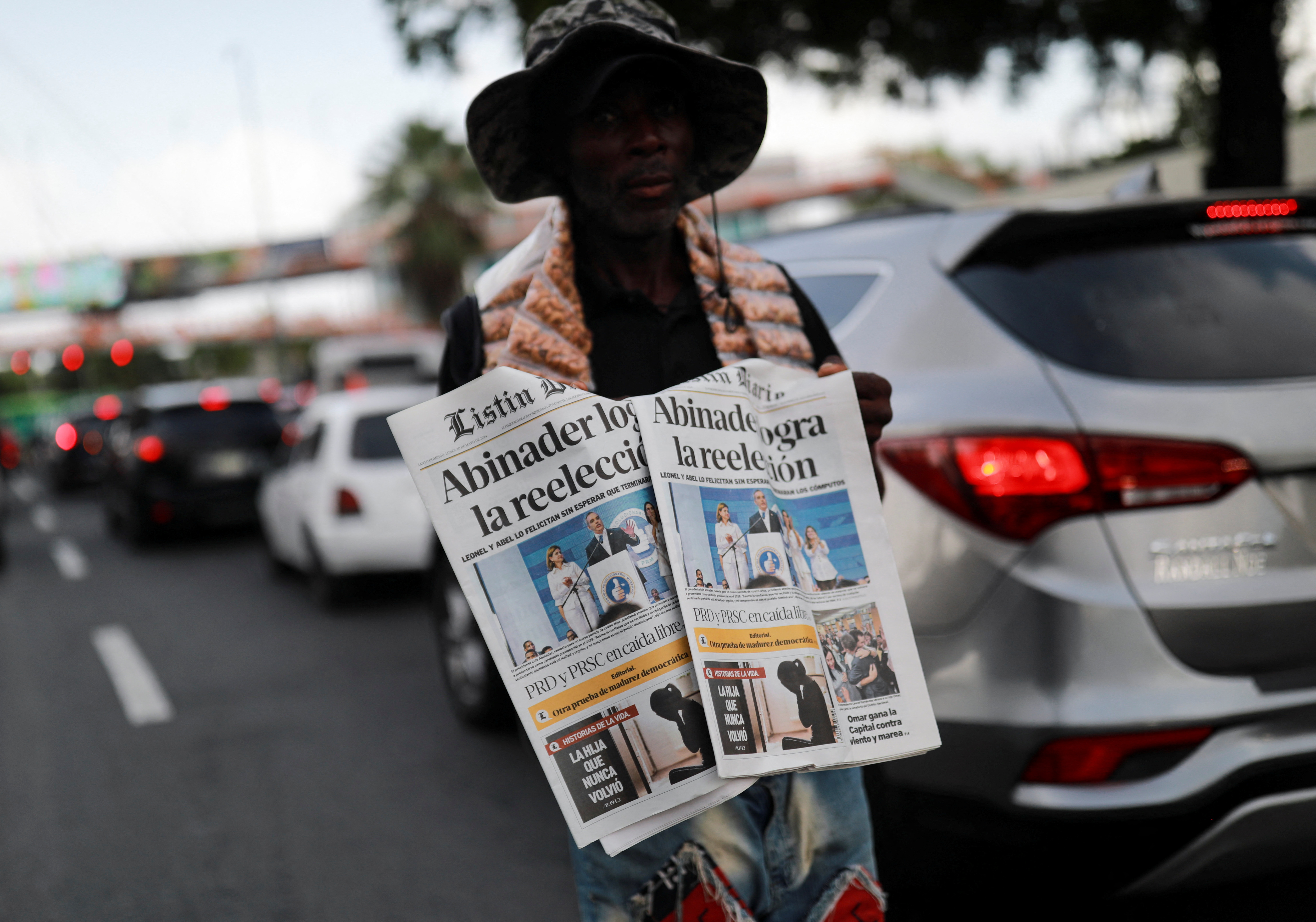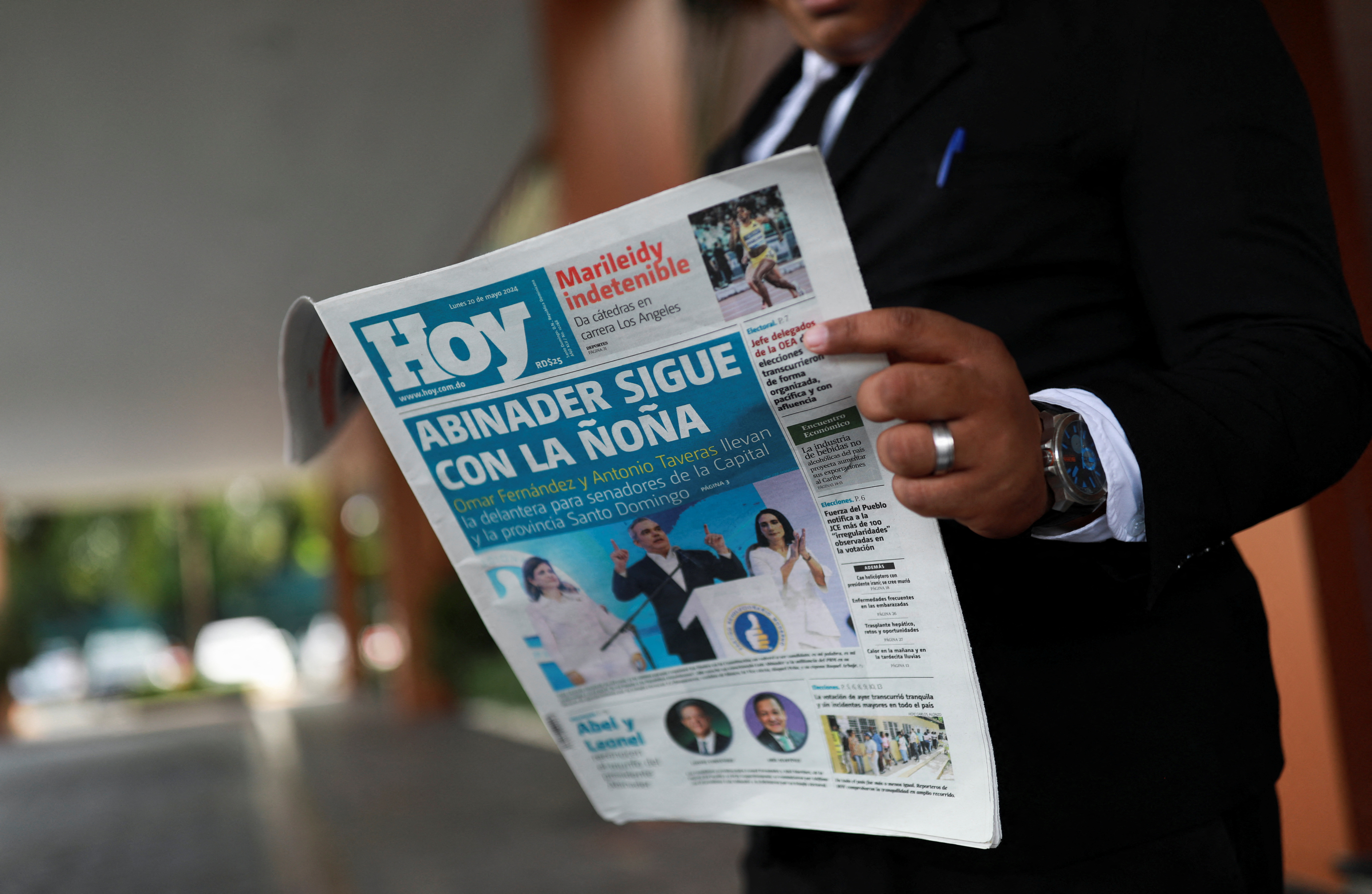 第1项,多米尼加共和国总统路易斯·阿比纳德在2024年5月20日星期日的投票中获得初步58.85%的选票后,将开始第二个任期。2024年5月20日,多米尼加共和国圣多明各,总统就职典礼的第二天,一名男子在一栋建筑物外面读报。路透社/亨利·罗梅罗