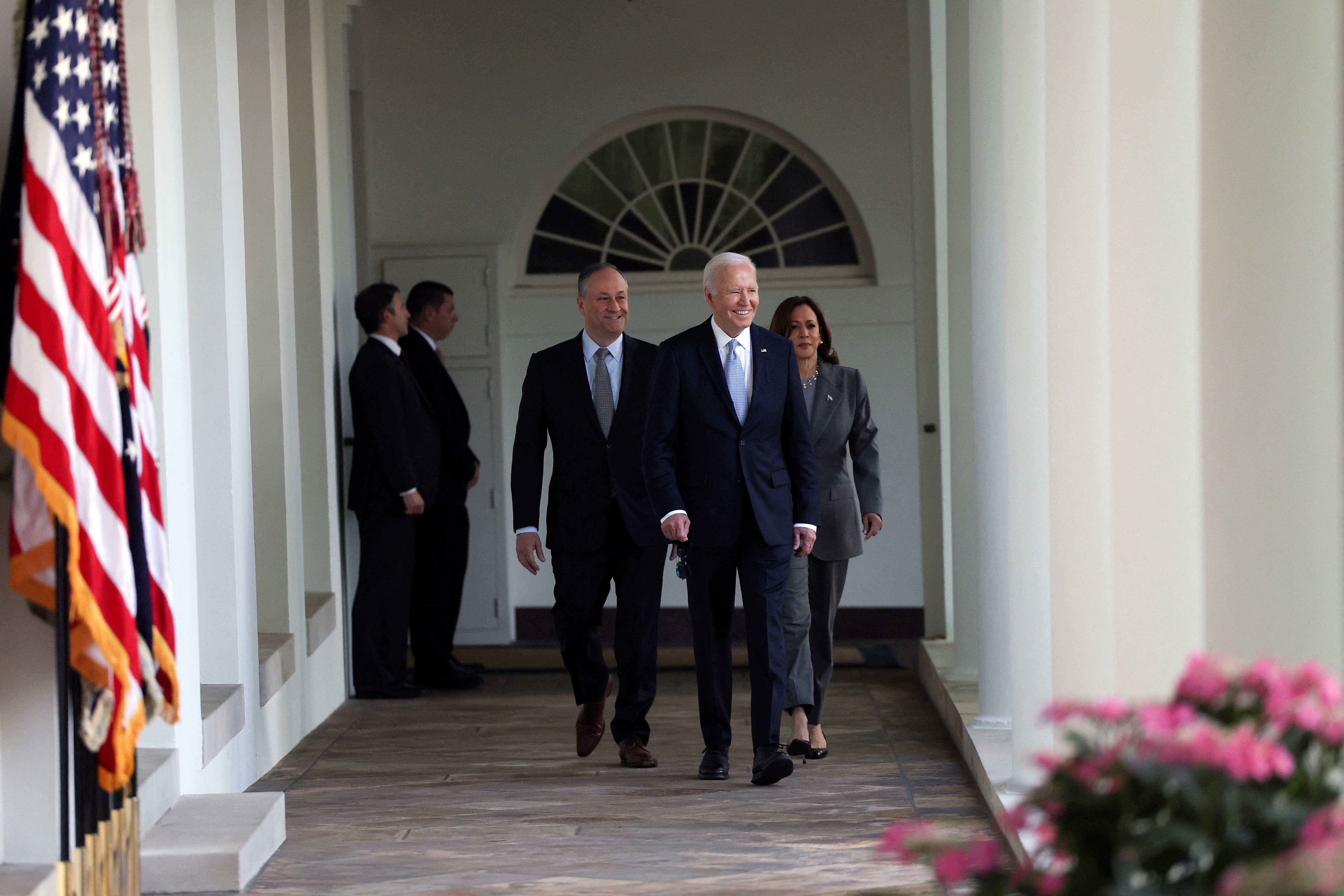 美国总统乔·拜登、副总统卡玛拉·哈里斯和第二先生道格·埃姆霍夫步行前往白宫参加庆祝犹太美国传统月活动,华盛顿,美国,2024年5月20日。路透社/利亚·米利斯 华盛顿,5月20日(路透社)- 总统乔·拜登的2024年竞选在4月的筹款首次落后于对手唐纳德·特朗普,此前前总统加大了与共和党全国委员会的联合行动,并主持了高额筹款活动。