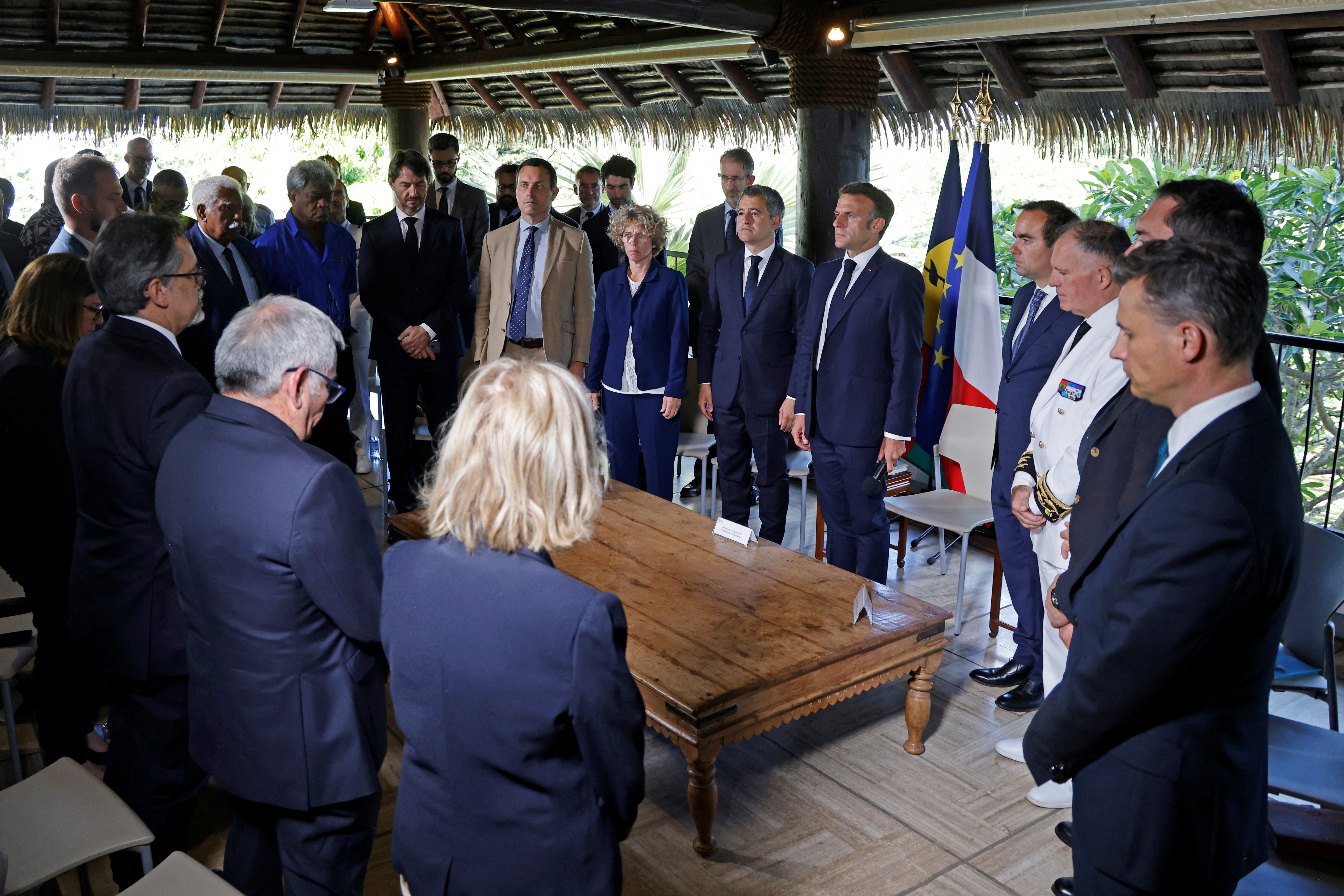 第1项6法国总统埃马纽埃尔·马克龙在新喀里多尼亚法国太平洋领土努美阿的法国高级专员路易·勒·弗朗克的住所与新喀里多尼亚选举官员和地方代表会面时,默哀一分钟,向2024年5月23日在致命冲突中丧生的受害者表示敬意。 LUDOVIC MARIN/Pool via REUTERS