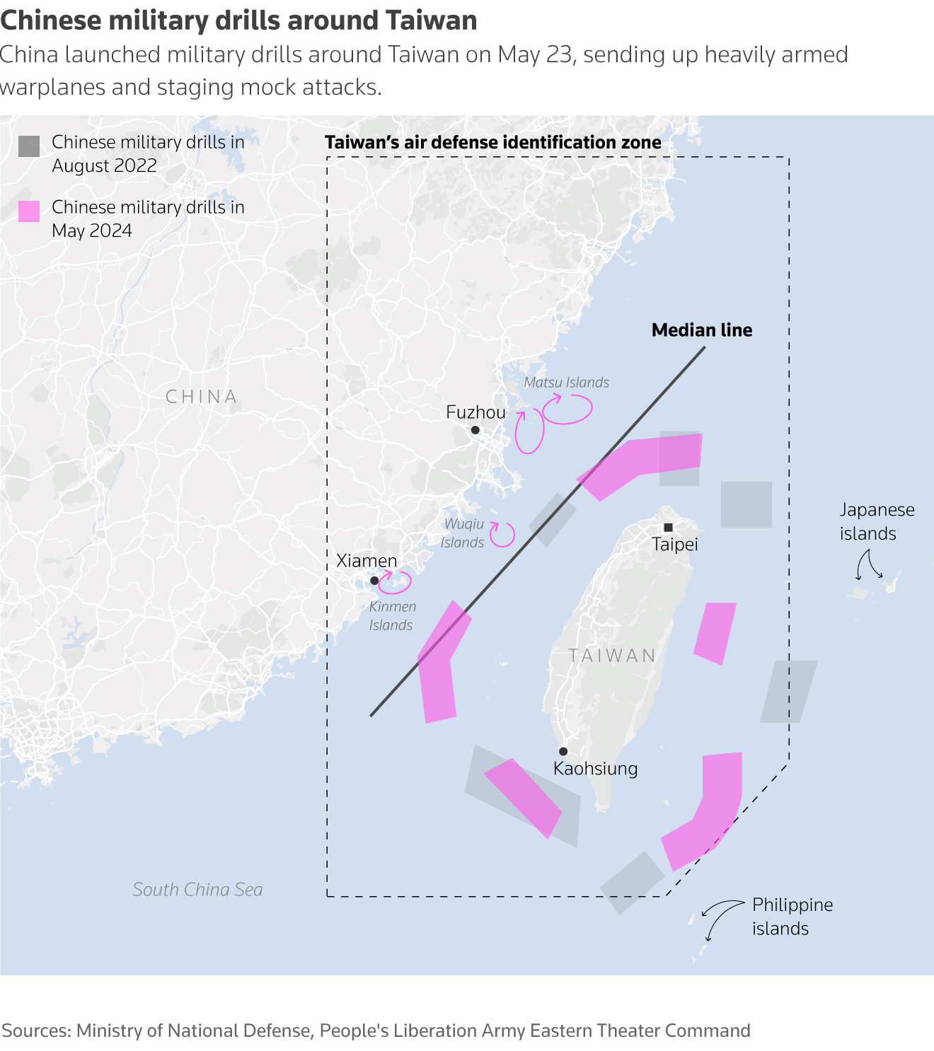 这些演习发生在台湾海峡以及中国海岸旁边的台湾控制的岛屿群周围,距离赖清德就职仅三天。