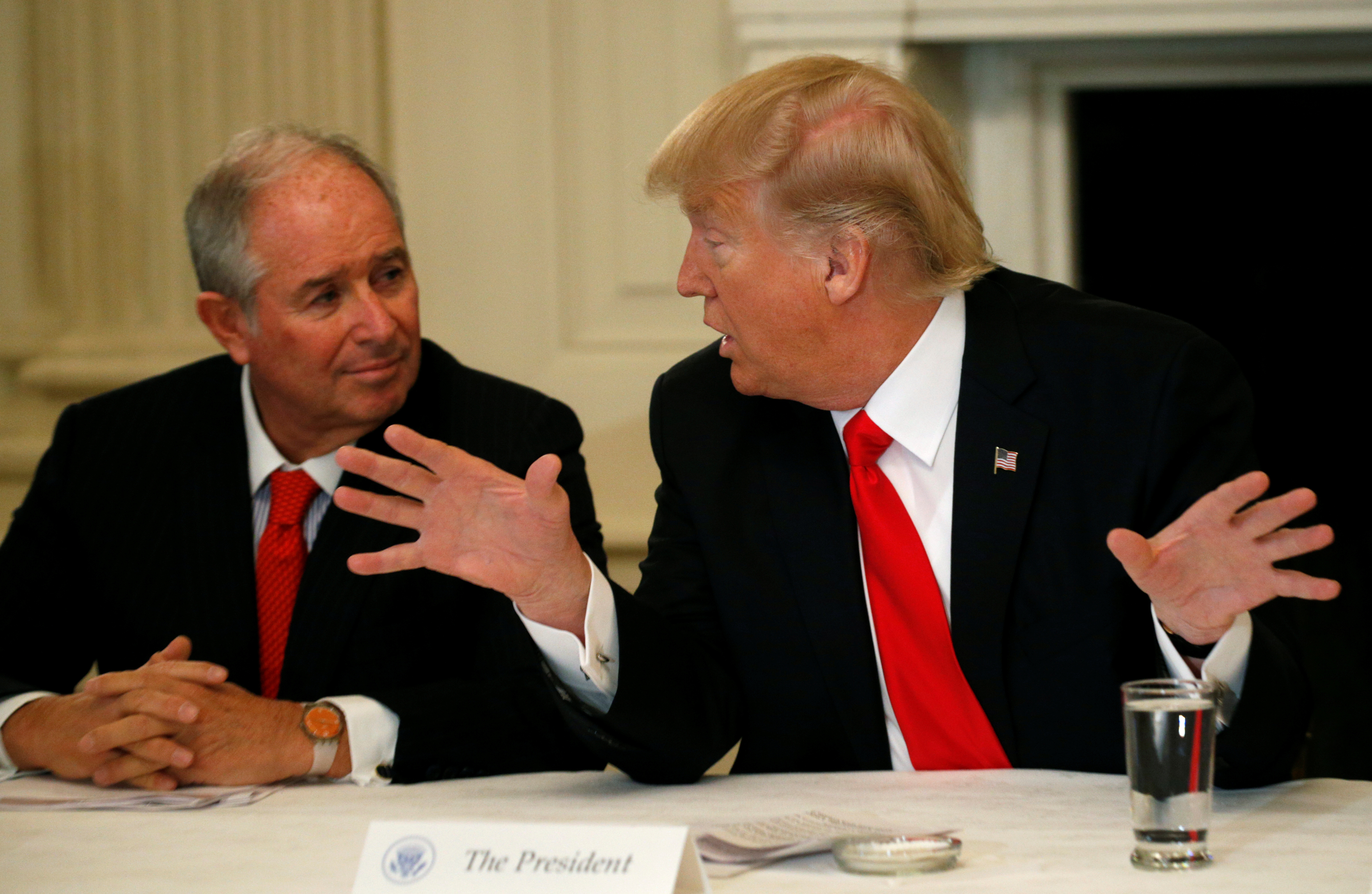 黑石集团首席执行官斯蒂芬·施瓦茨曼在2017年2月3日与美国总统唐纳德·特朗普在华盛顿白宫举行的战略与政策论坛上倾听。路透社/凯文·拉马克/档案照5月24日(路透社)- 黑石集团首席执行官斯蒂芬·施瓦茨曼将支持唐纳德·特朗普,后者正在寻求重返白宫,Axios周五报道。作为华尔街上最大的政治捐助者之一,施瓦茨曼计划向特朗普和各个共和党参议员候选人捐款,报告援引这家投资管理公司首席执行官的声明称。