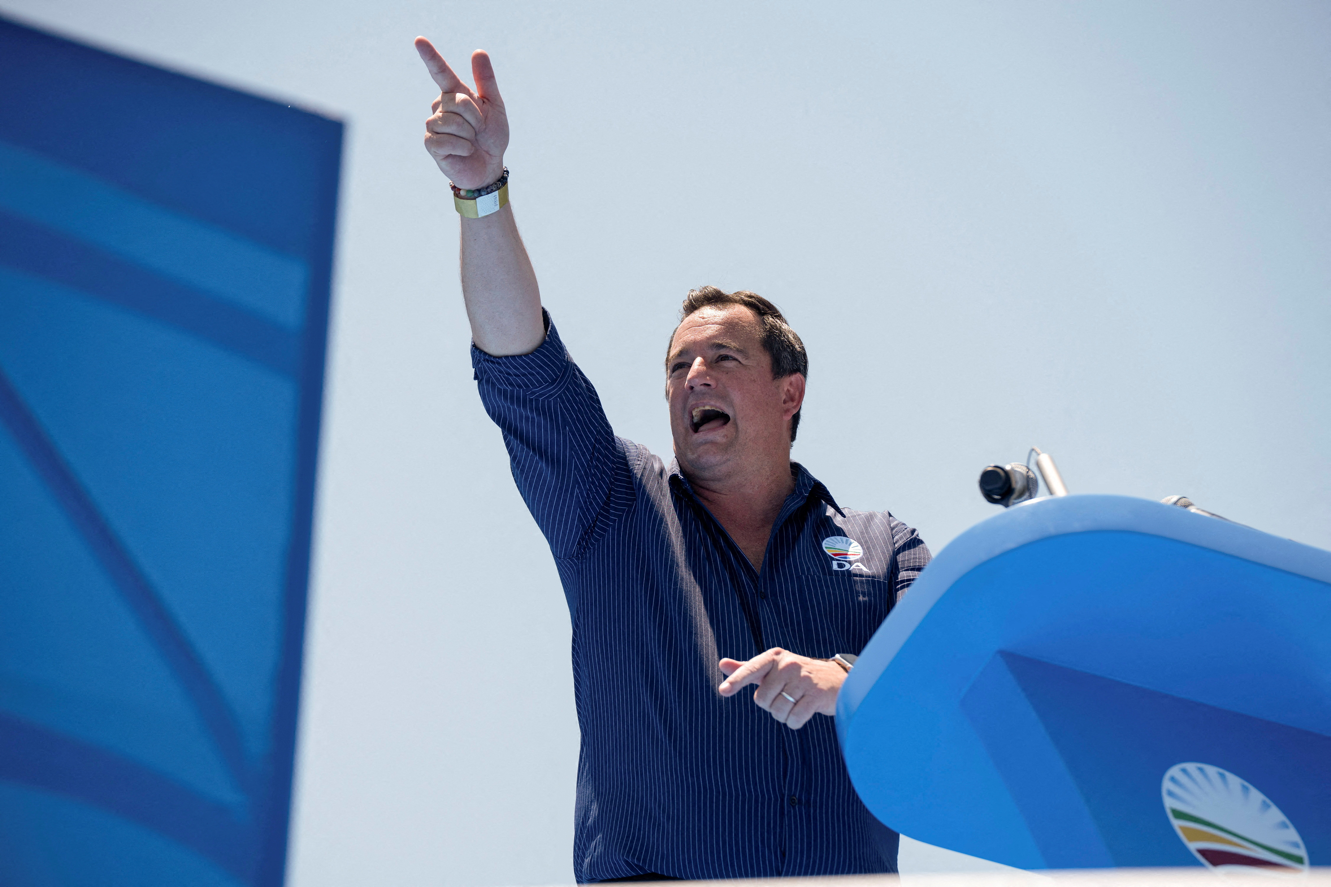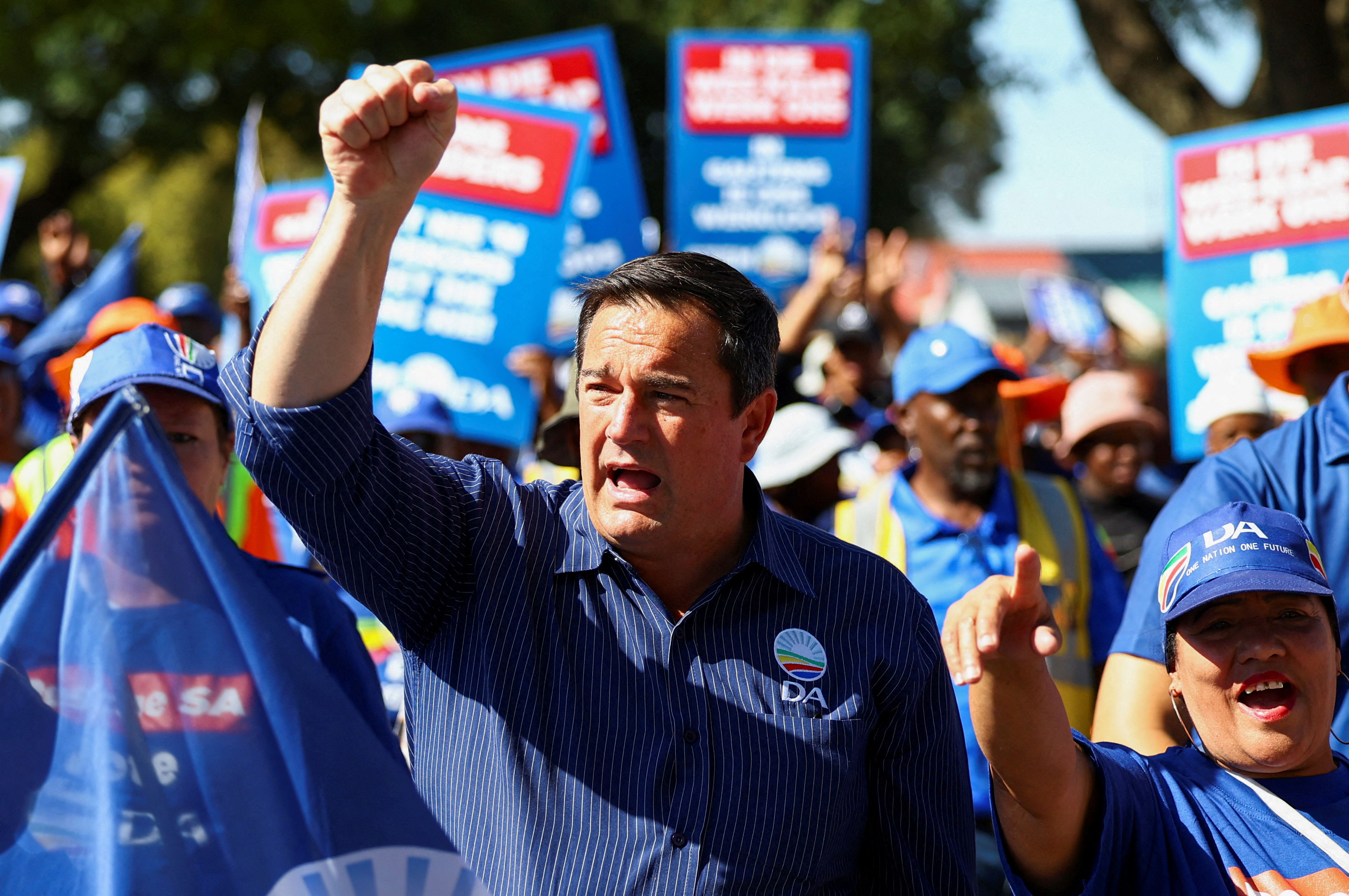 第1张照片,南非反对党领袖、民主联盟(DA)的约翰·斯蒂恩豪森在南非约翰内斯堡的Riverlea举行反犯罪游行,以迎接2024年5月29日的大选。2024年5月16日拍摄。路透社/Siphiwe Sibeko/文件照片