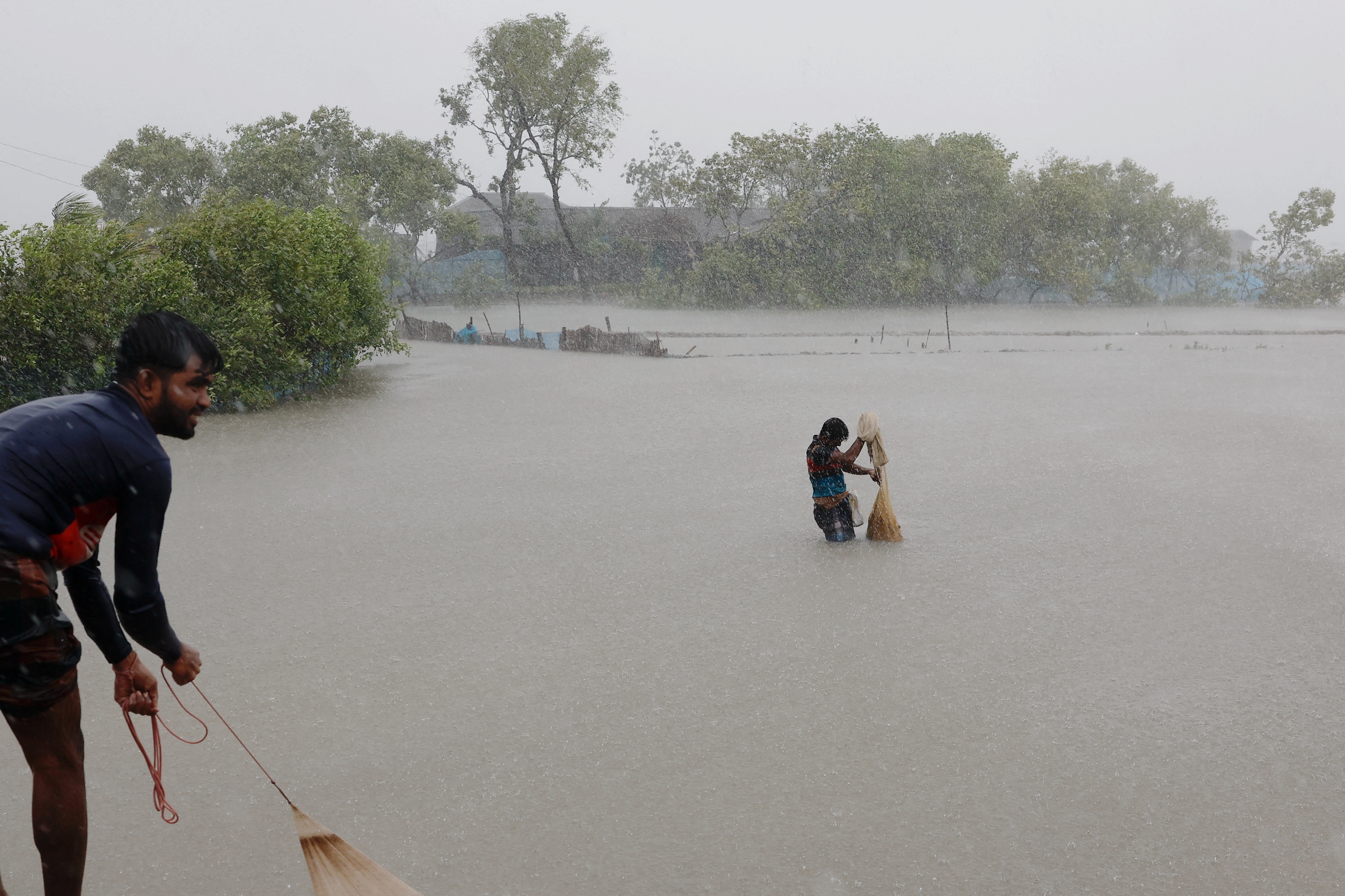 第1张图片:孟加拉国萨特基拉的夏姆纳加尔地区,由于热带风暴雷马袭击,人们在因暴雨而被淹没的虾蟹养殖场钓鱼,2024年5月27日。路透社/穆罕默德·波尼尔·侯赛因