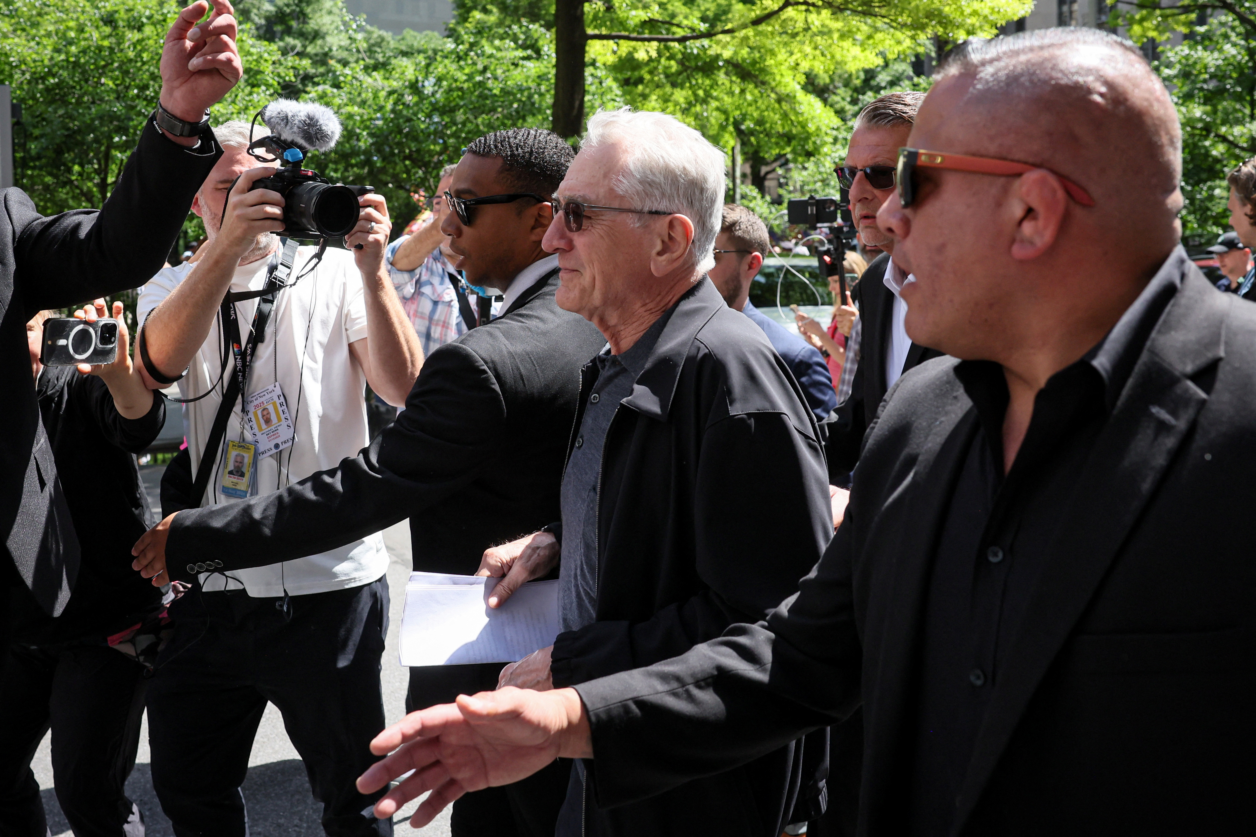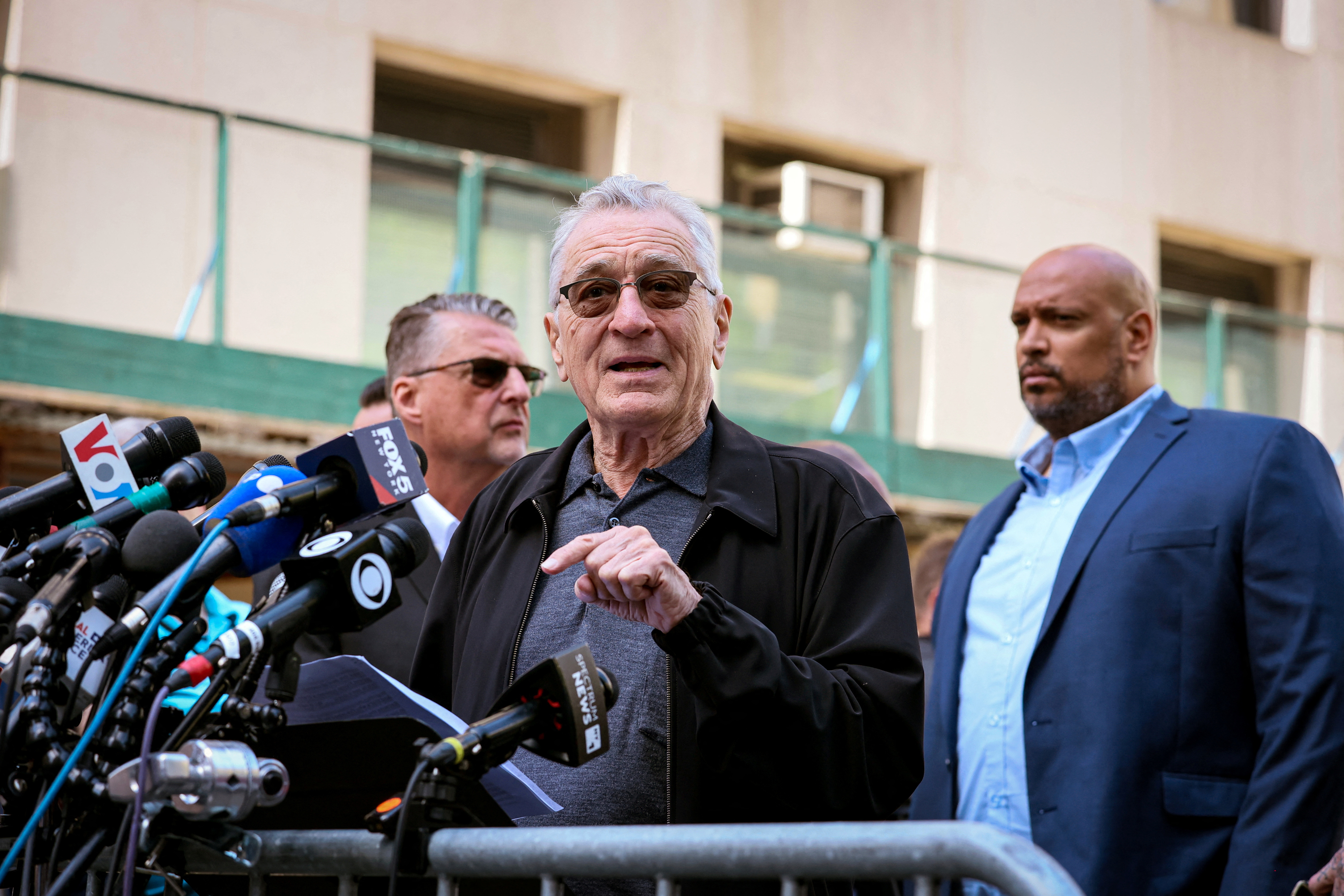第1项,演员罗伯特·德尼罗在曼哈顿州法院纽约市举行的特朗普前总统特朗普的刑事审判新闻发布会上发言,指控他伪造商业记录以隐瞒2016年向色情明星斯多米·丹尼尔斯支付封口费用的资金,2024年5月28日,美国,REUTERS/Brendan McDermid