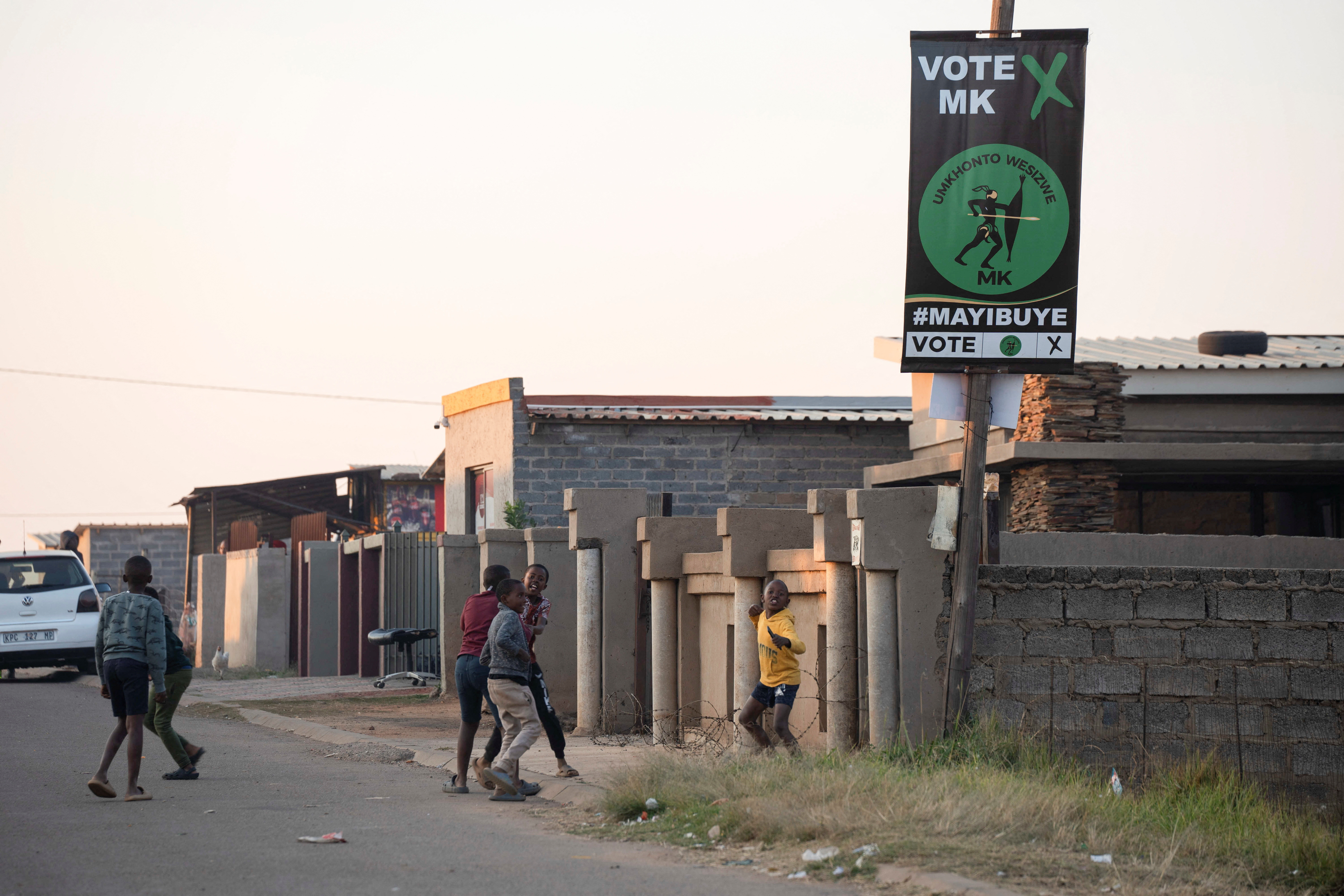 第1项,4项儿童在南非德尔马斯镇Botleng附近玩耍,海报上写着uMkhonto weSizwe党,2024年5月30日。路透社/Ihsaan Haffejee