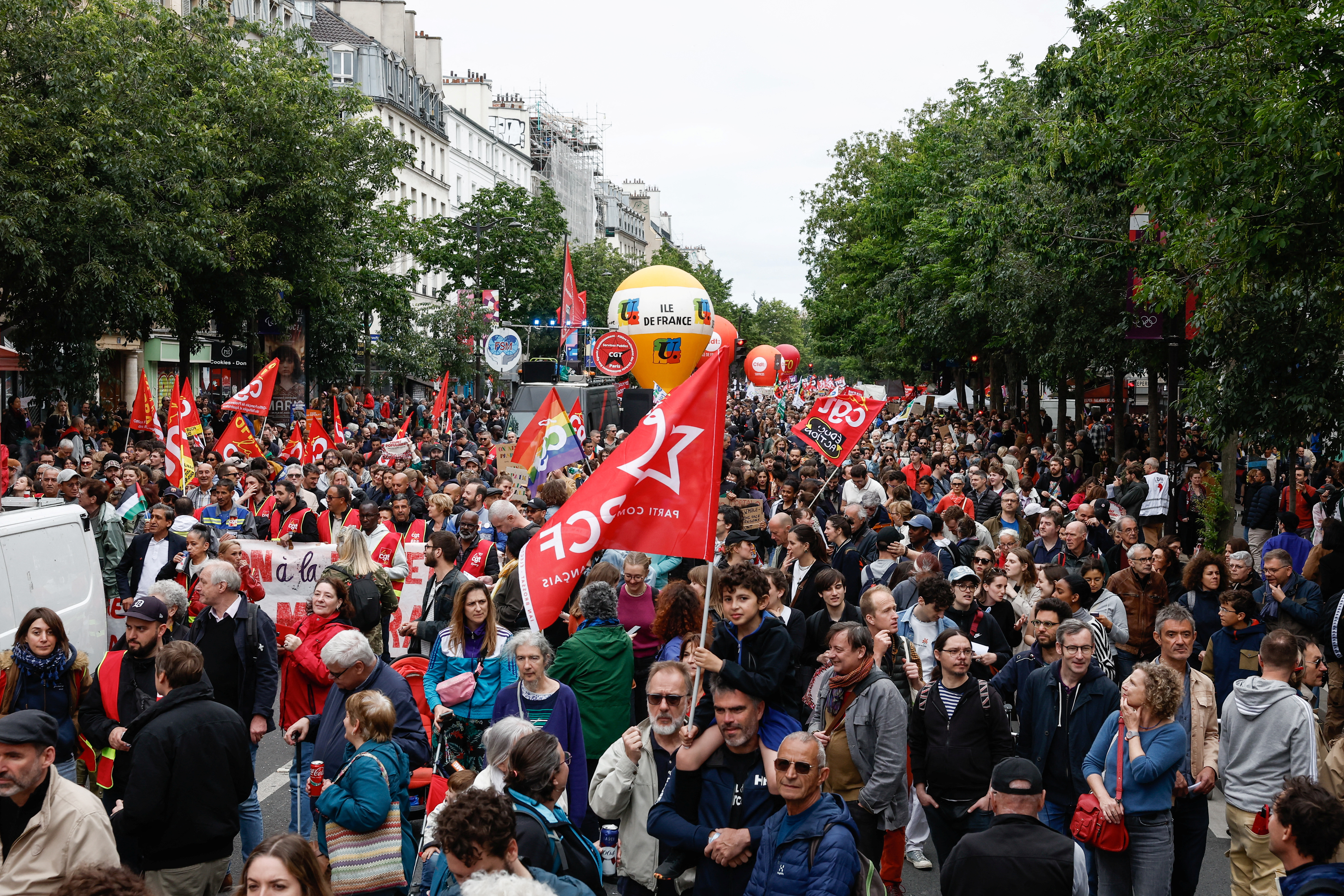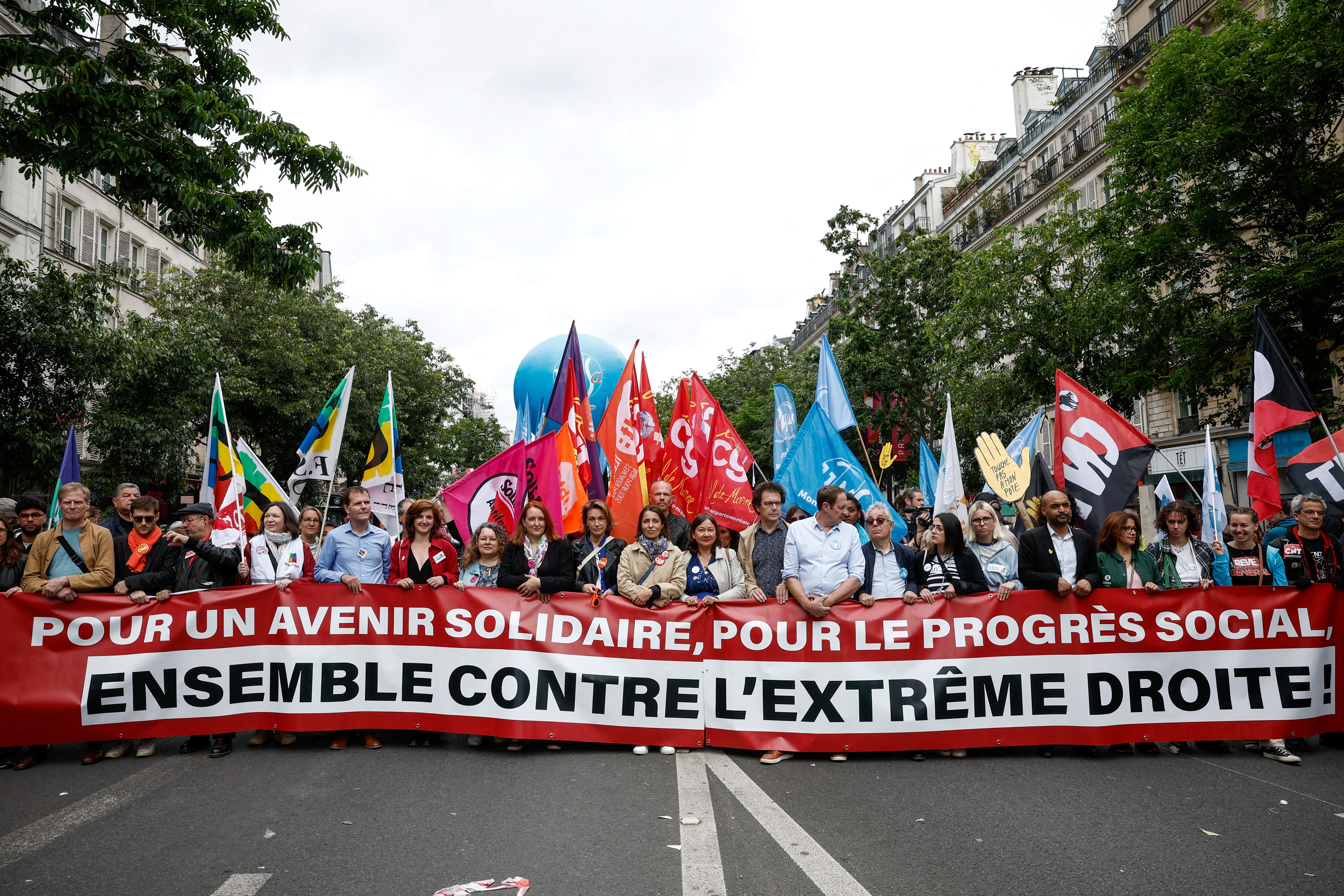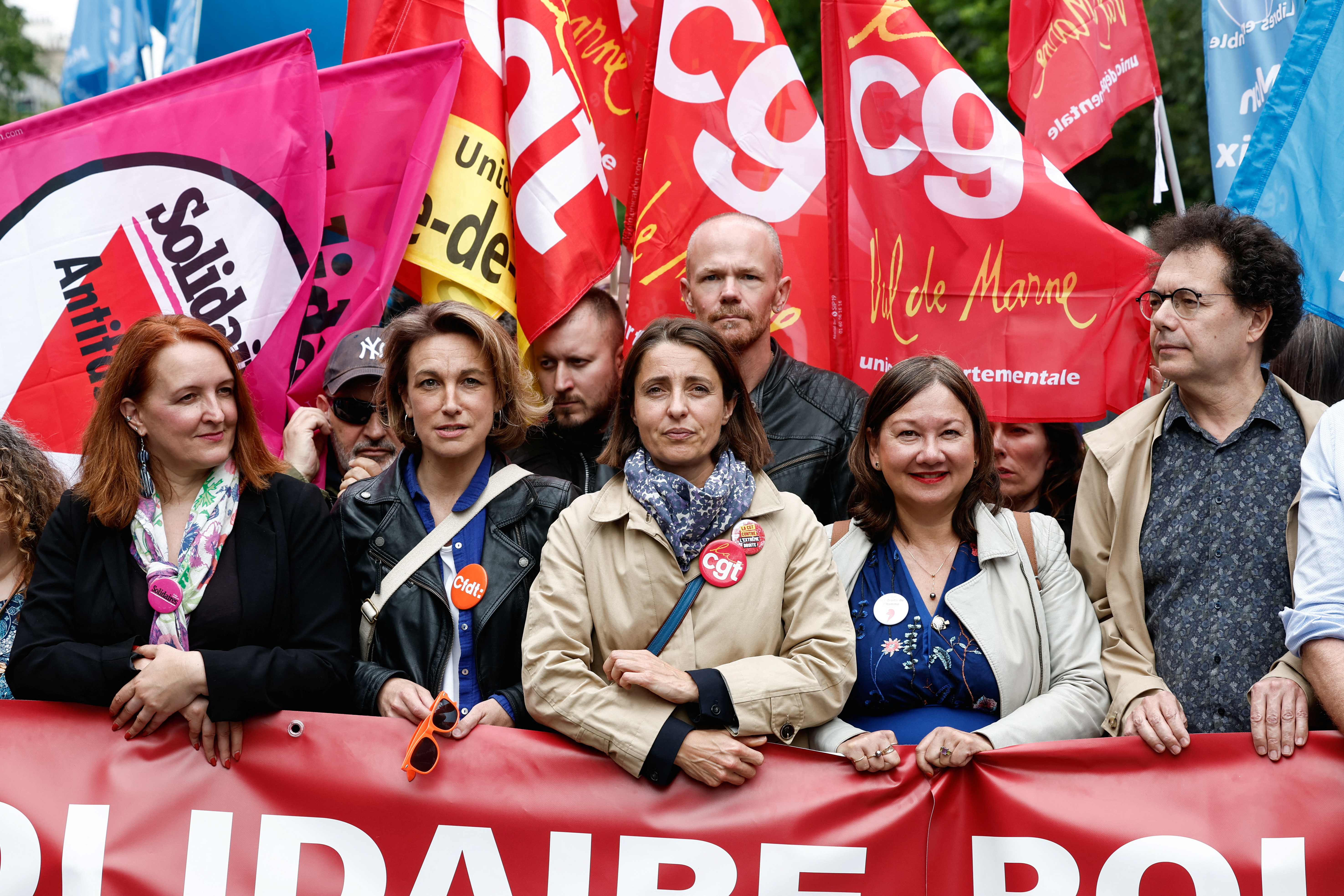 在共和国广场发表讲话的极左翼CGT工会领袖Sophie Binet告诉记者:“我们正在游行,因为我们非常担心(RN的领袖)乔丹·巴尔德拉可能成为下一任总理…我们希望阻止这场灾难。”