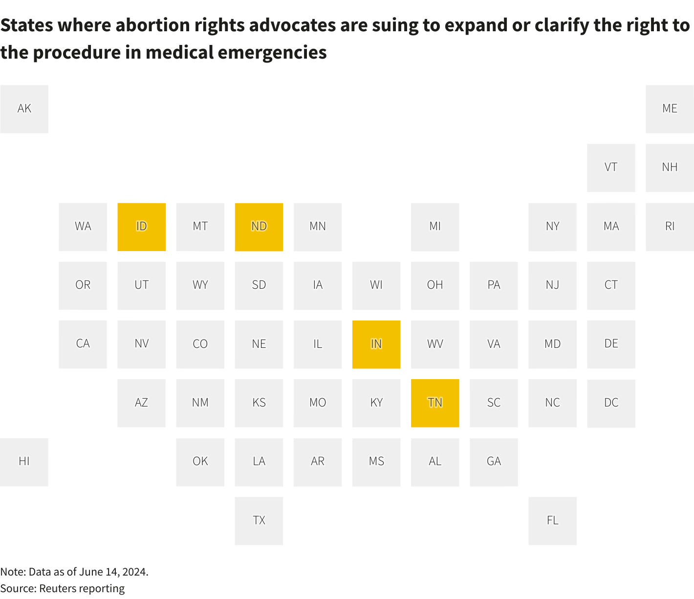 目前在包括印第安纳、田纳西、北达科他和爱达荷在内的一些州有类似的诉讼正在进行。爱达荷州的案件涉及该州的堕胎禁令是否与一项要求急诊室稳定患者的联邦法律相冲突,目前正在上诉至最高法院,可能也会影响其他州的医疗护理。与此同时,德克萨斯州最高法院最近驳回了一项试图扩大和澄清该州医疗例外情况的挑战。