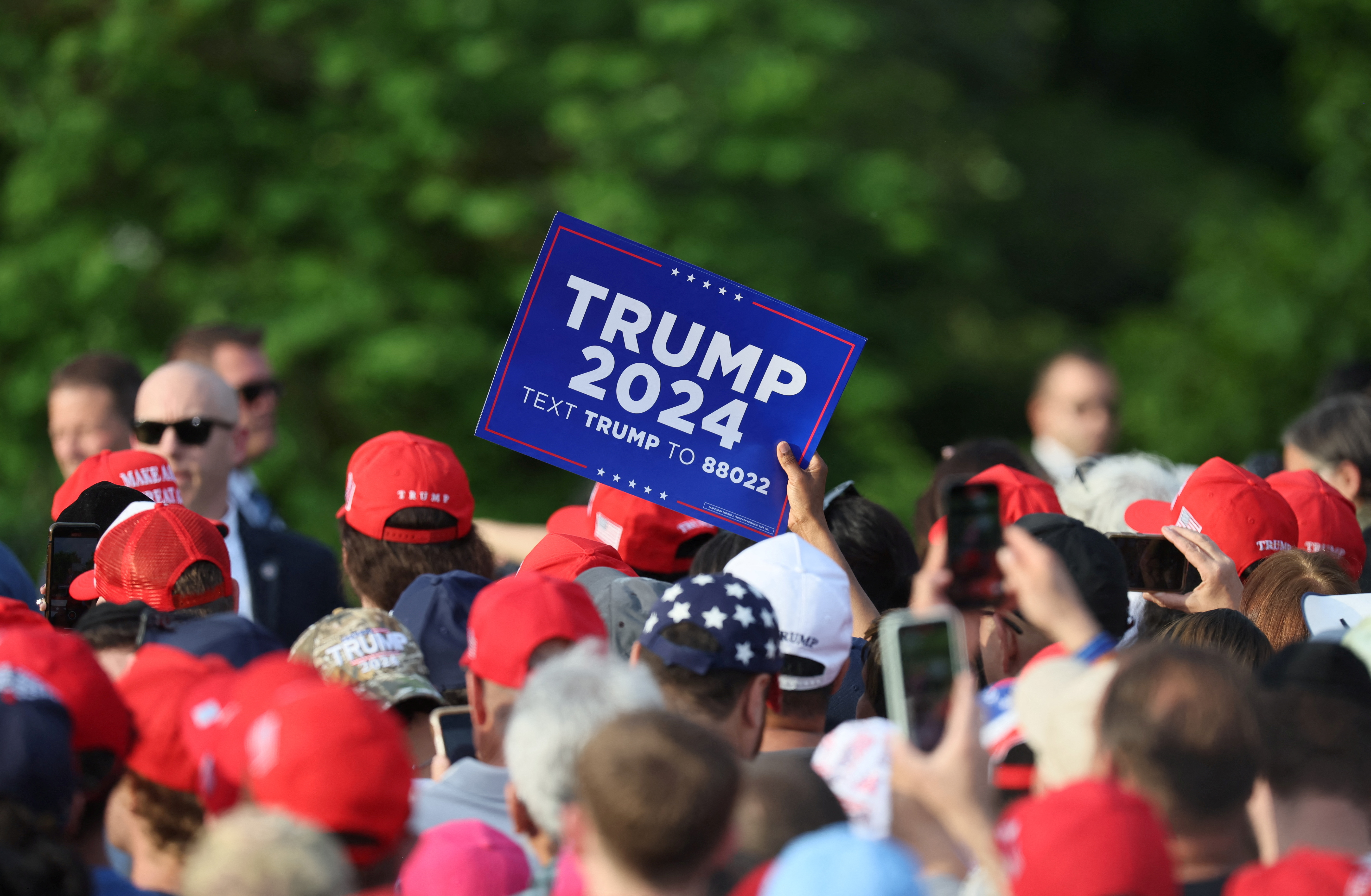 第1项,共2项。一名人士在美国前总统、共和党总统候选人唐纳德·特朗普于2024年5月23日在纽约市布朗克斯区的克罗托纳公园举行的竞选集会上举牌。路透社/Brendan McDermid/档案照片