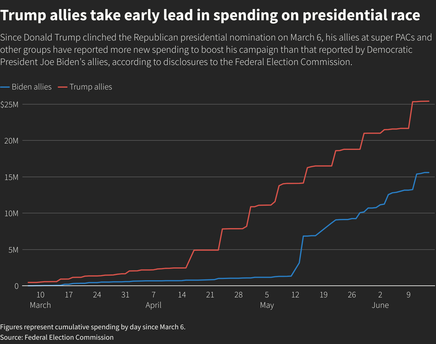 双方最近的大部分支出都用于电视攻击广告,他们试图影响那些将决定美国选举结果的少数选民。11月5日选举。特朗普的盟友表示,这场支出狂潮旨在抵消拜登早期筹款的优势。拜登的竞选团队报告称,4月底银行存款为8400万美元,而特朗普报告的数字为4900万美元。
