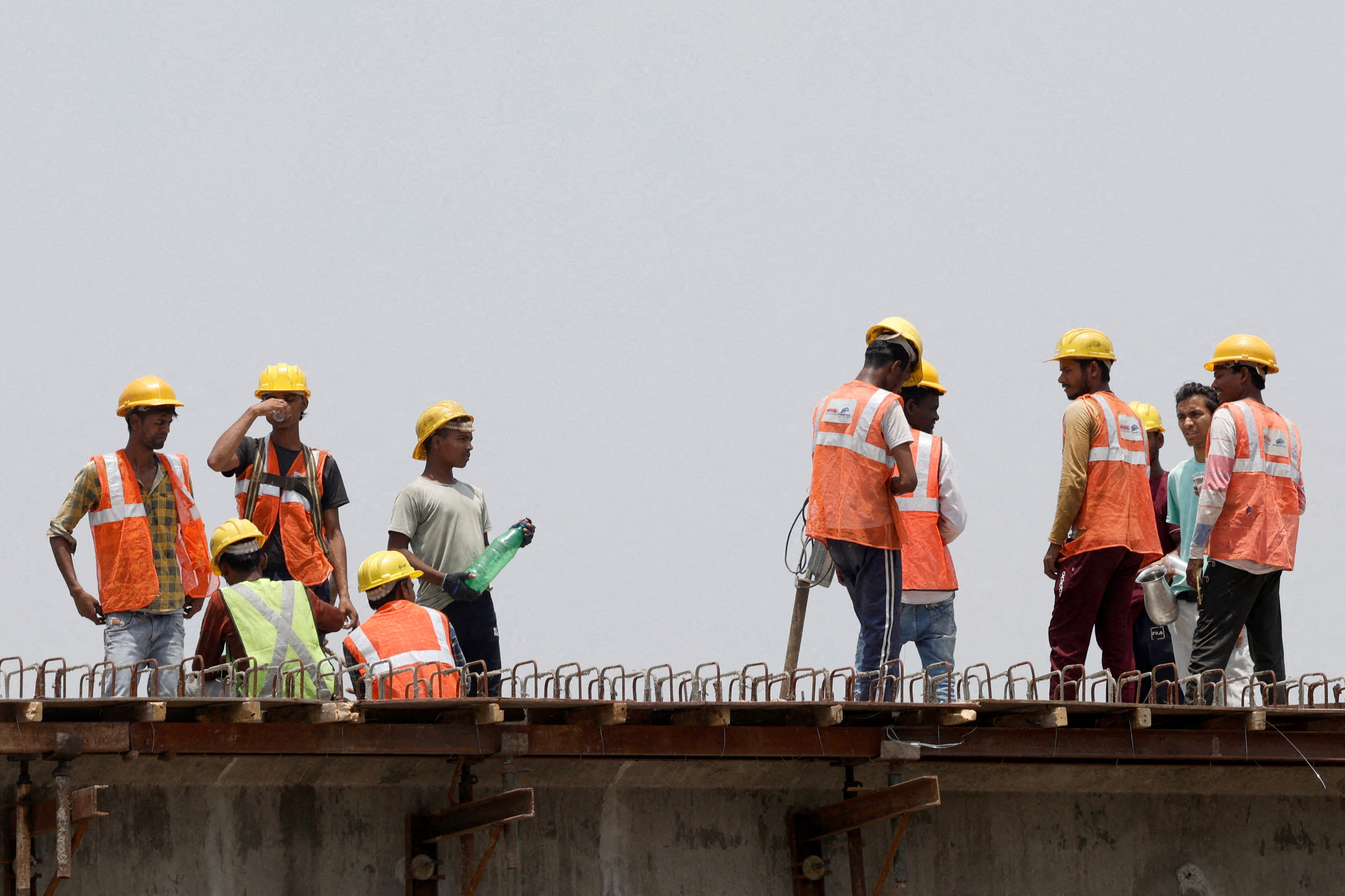 第1项,工人们在印度新德里一个炎热的夏日在建筑工地休息时喝水,2024年5月20日。路透社/Priyanshu Singh/文件照片